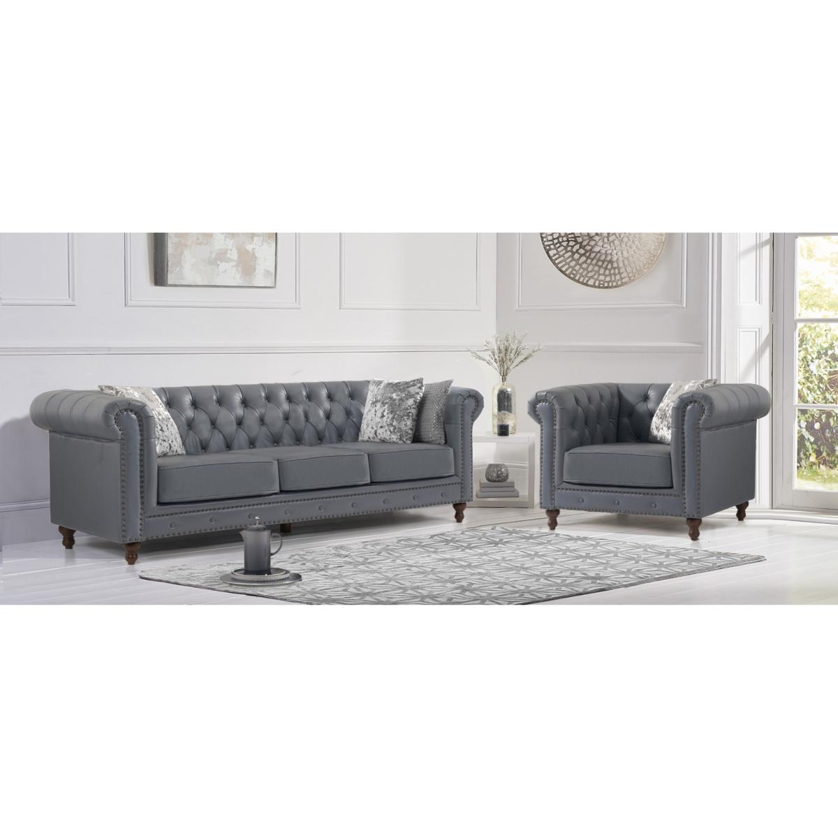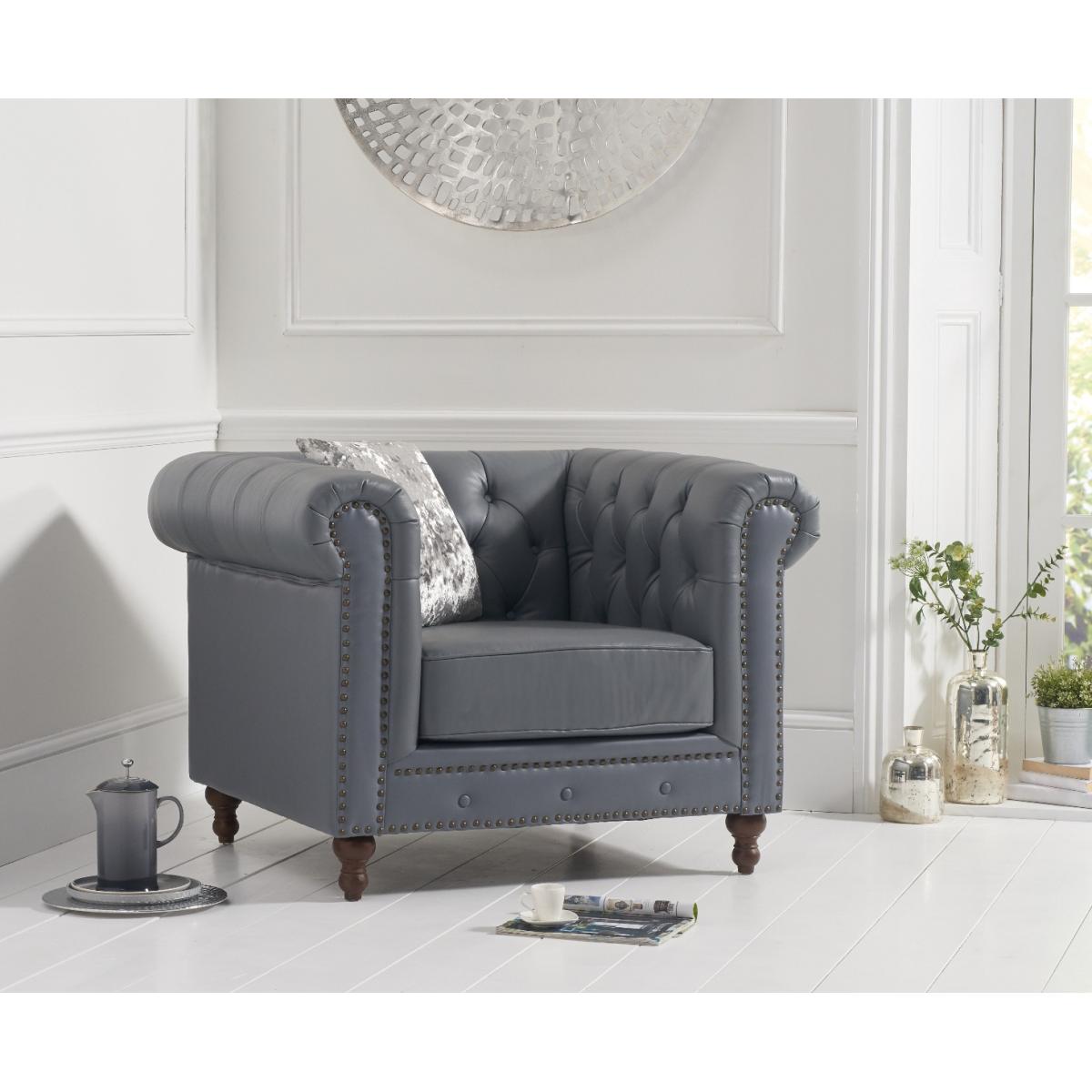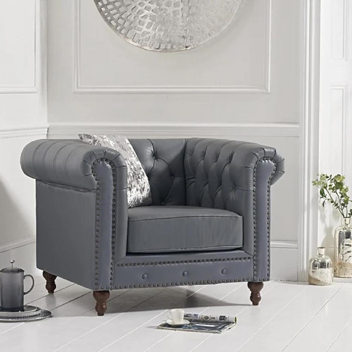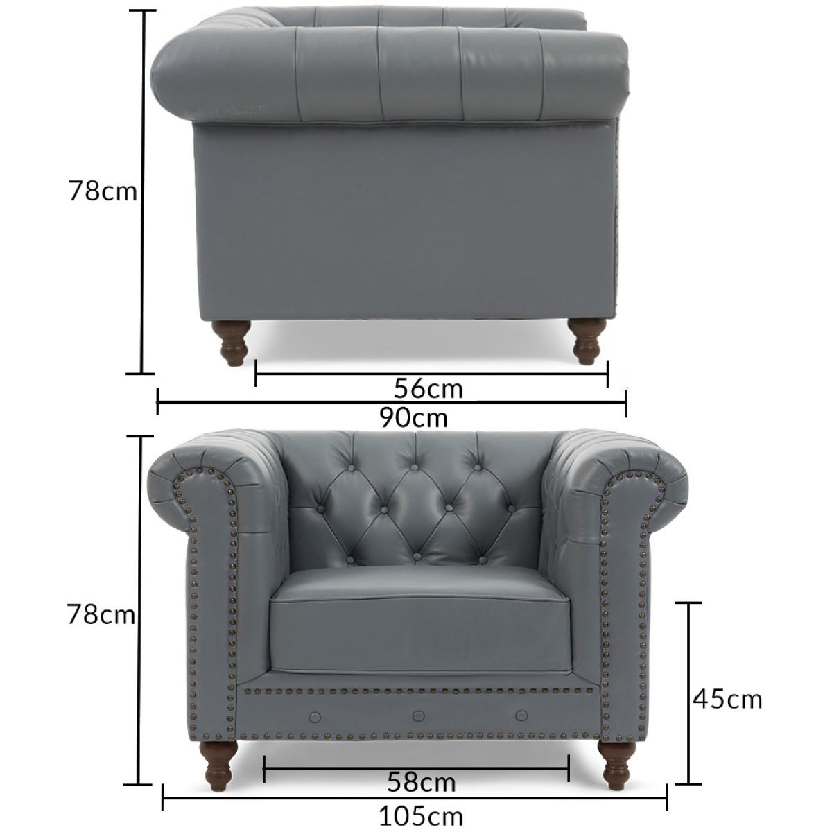 The perfect piece to both curl up in and add stylish charm to any living space, the Milano Chesterfield Armchair features our soft and supple leather in elegant grey, and classic Chesterfield styling. Deeply buttoned to the plump and comfortable back, and boasting a foam-filled cushion and high arms for a seriously cosy seat. A contemporary metal studded trim adds a modern, of-the-moment finish, and sturdy solid ash legs offer lasting support. Our soft and supple leathers lend both comfort and style, plus they’re effortless to wipe and clean. Contemporary tonal metal studding adds a modern touch to classic Chesterfield design. Supported by sturdy dark ash legs, designed to last. Carefully crafted, with every design aspect considered for a piece that’s truly unique.. We Love: Styled with the matching Milano Grey leather 3 Seater Sofa, and Milano 2 Seater Sofa for a full suite. Also available in: Grey Linen, Blue Plush, Green Plush, Grey Plush.