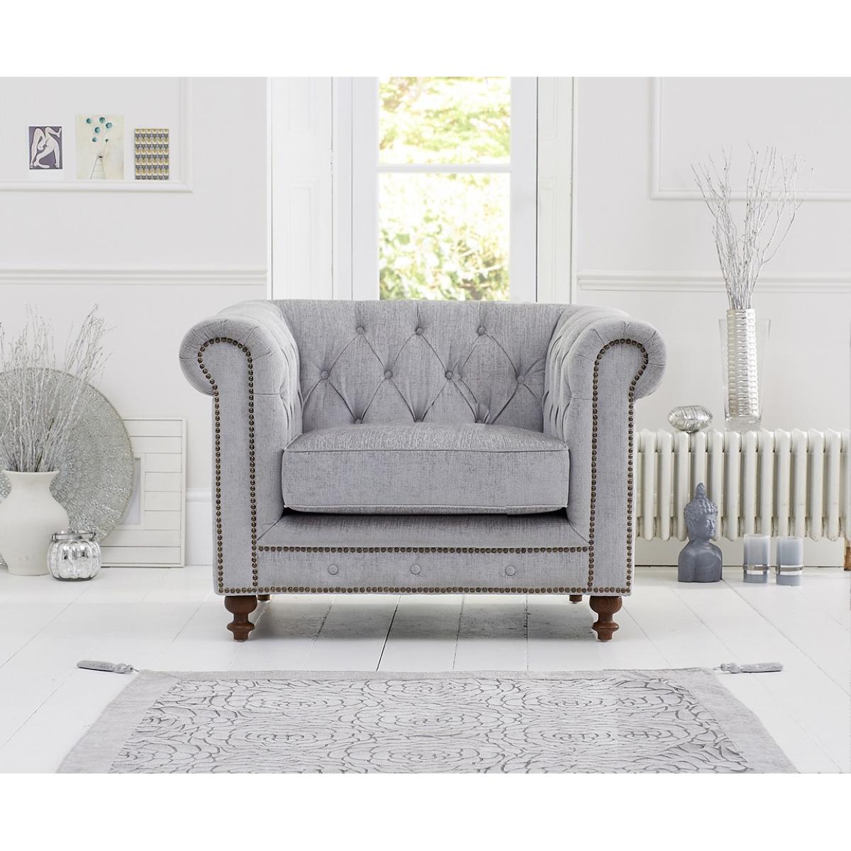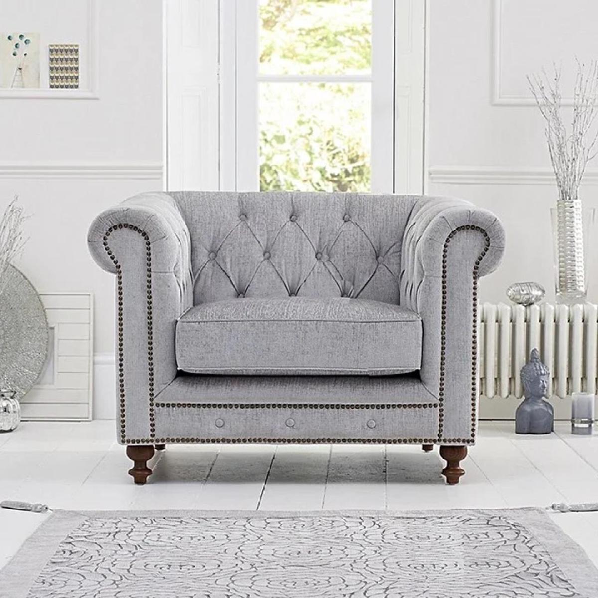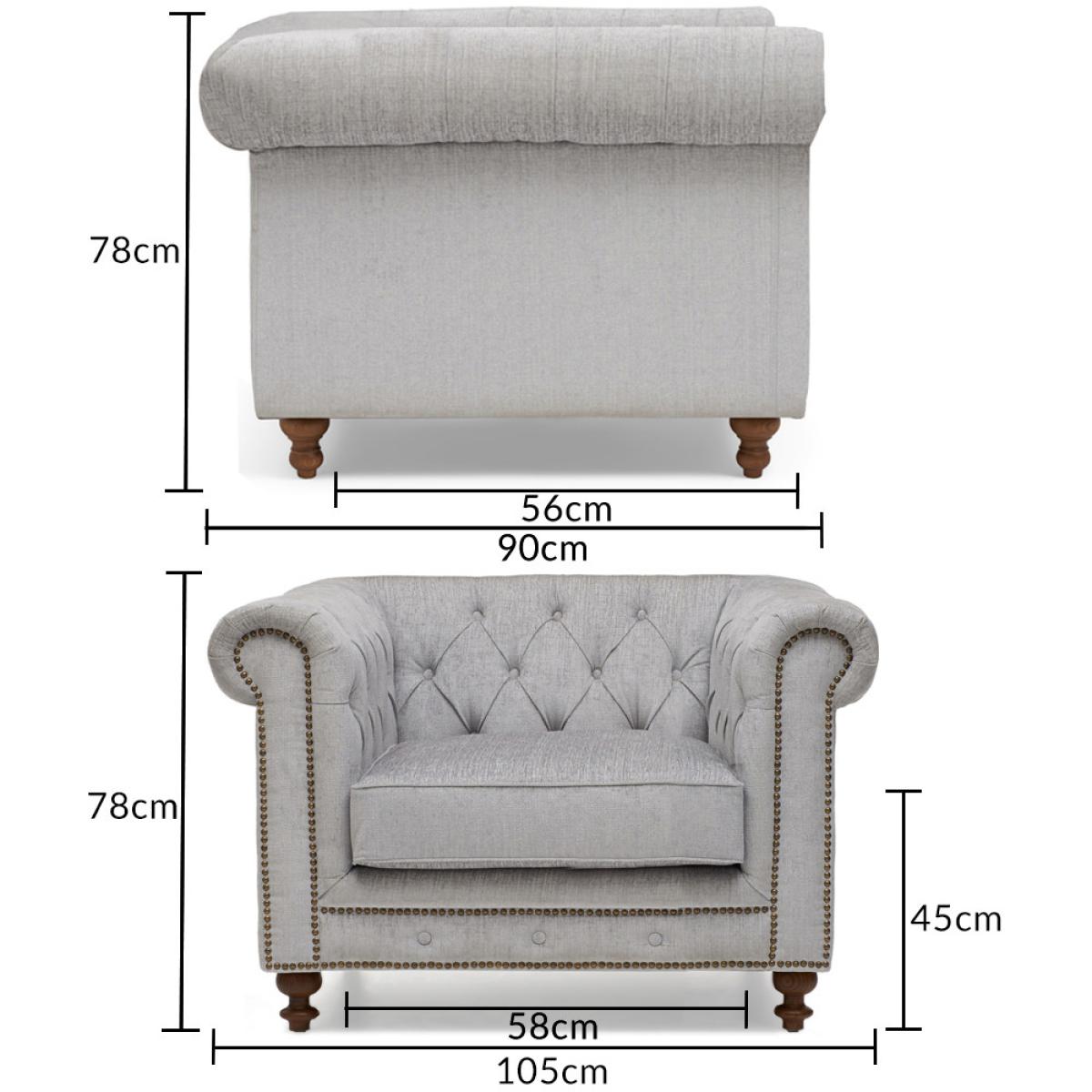 The Milano Chesterfield Grey Plush Fabric Armchair will bring charm and elegance to any room you choose to place it in. Inspired by the classic Chesterfield design, this armchair features scroll arms, deep-buttoning on its back, turned solid ash legs and on-trend metal stud edging. Plus, the Milano Grey Plush Fabric Armchair also offers just the right amount of comfort thanks to its smooth upholstery, deep-filled seat cushions, supportive S-spring structure and high-rise arms, which make this armchair perfect for curling up into. As well as providing the perfect finishing touch to the Milano suite, it's also a fantastic accent chair by itself.