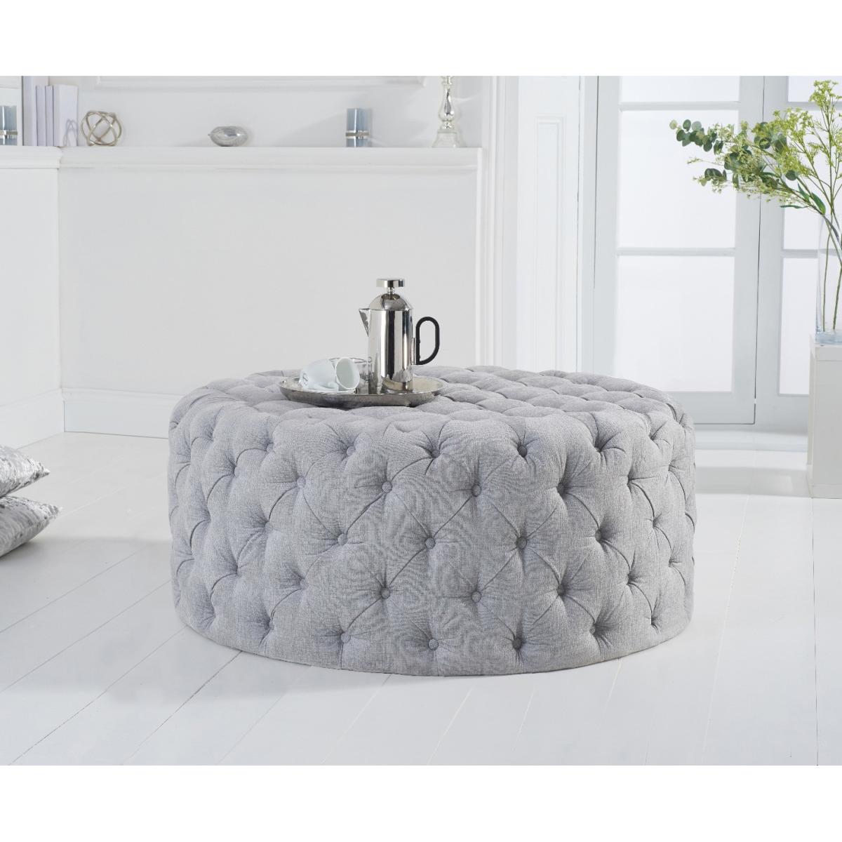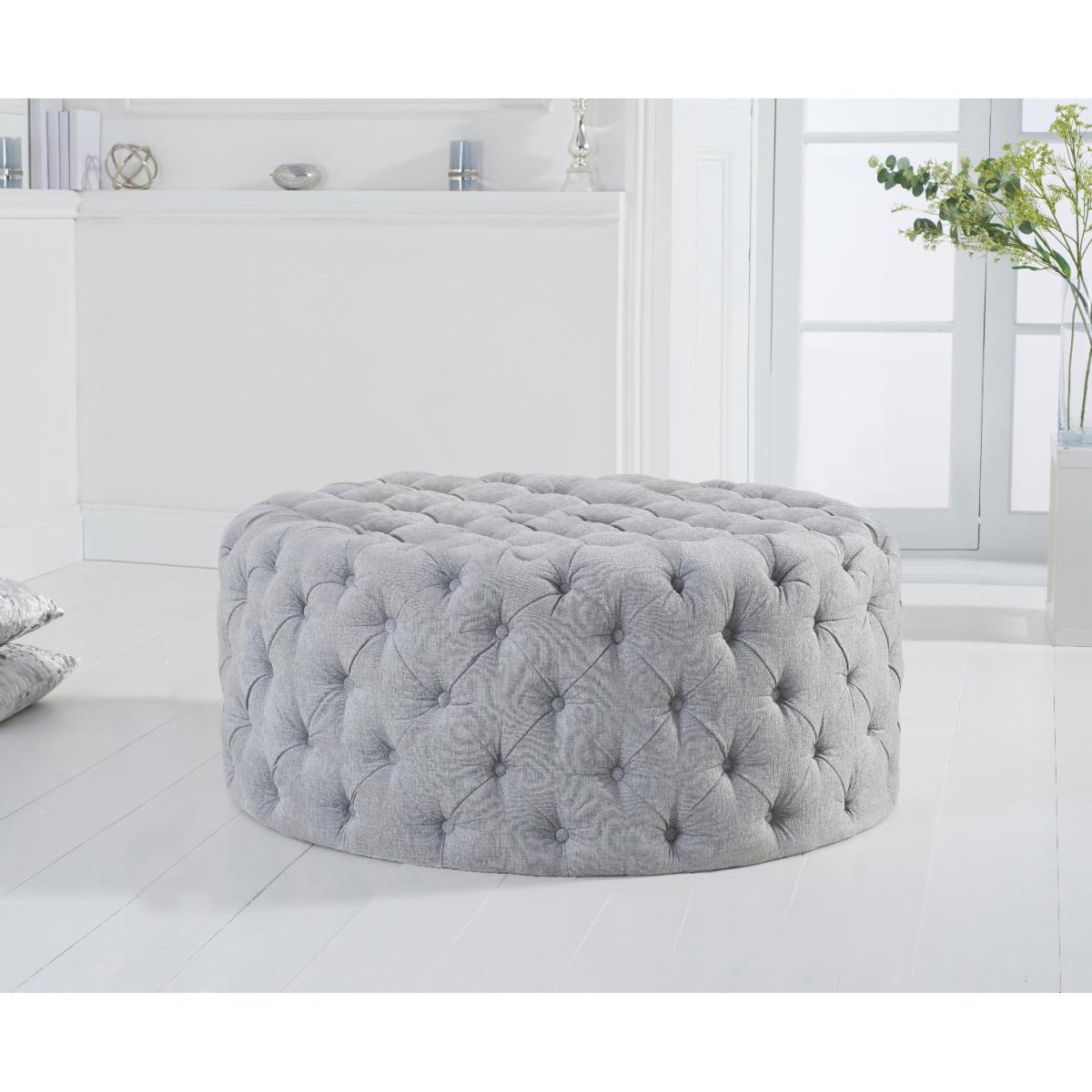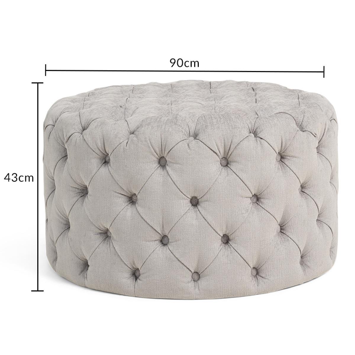 The Milano Grey Plush Round Footstool features a classic design that brings style to any interior. Complementing the Milano Grey Plush Sofa collection, the round footstool features soft-touch plush Fabric and deep buttoning. Stylish grey plush footstool makes a statement. Complements the Milano Grey Plush Sofas. Classic design with deep buttoning for a luxe look. Low, round design with padding throughout for maximum comfort. Also available in Blue and Green