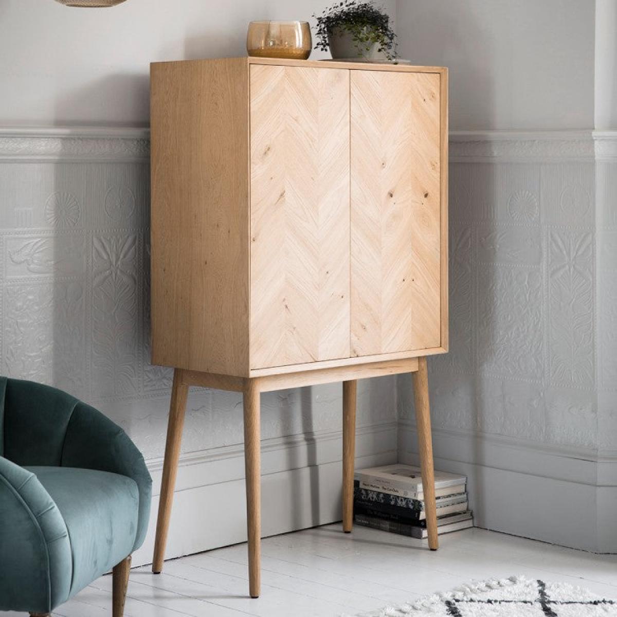 Cool and sleek this 2 door cocktail cabinet features a beautiful inlay chevron design, and is made using European oak and rustic oak structured veneers which show the natural beauty of the oak grain and knots. Finished in a specialist mat lacquer, which keeps the timber looking natural and dry, with brushed out grain, the cabinet is tactile to the touch and looks amazing. Flush finish doors show the stylish chevron pattern and the true beauty of the oak. Internally, the bottom part of the cabinet is wood and there is a wooden shelf. Above this the cabinet has a mirrored back and 2 glass shelves.