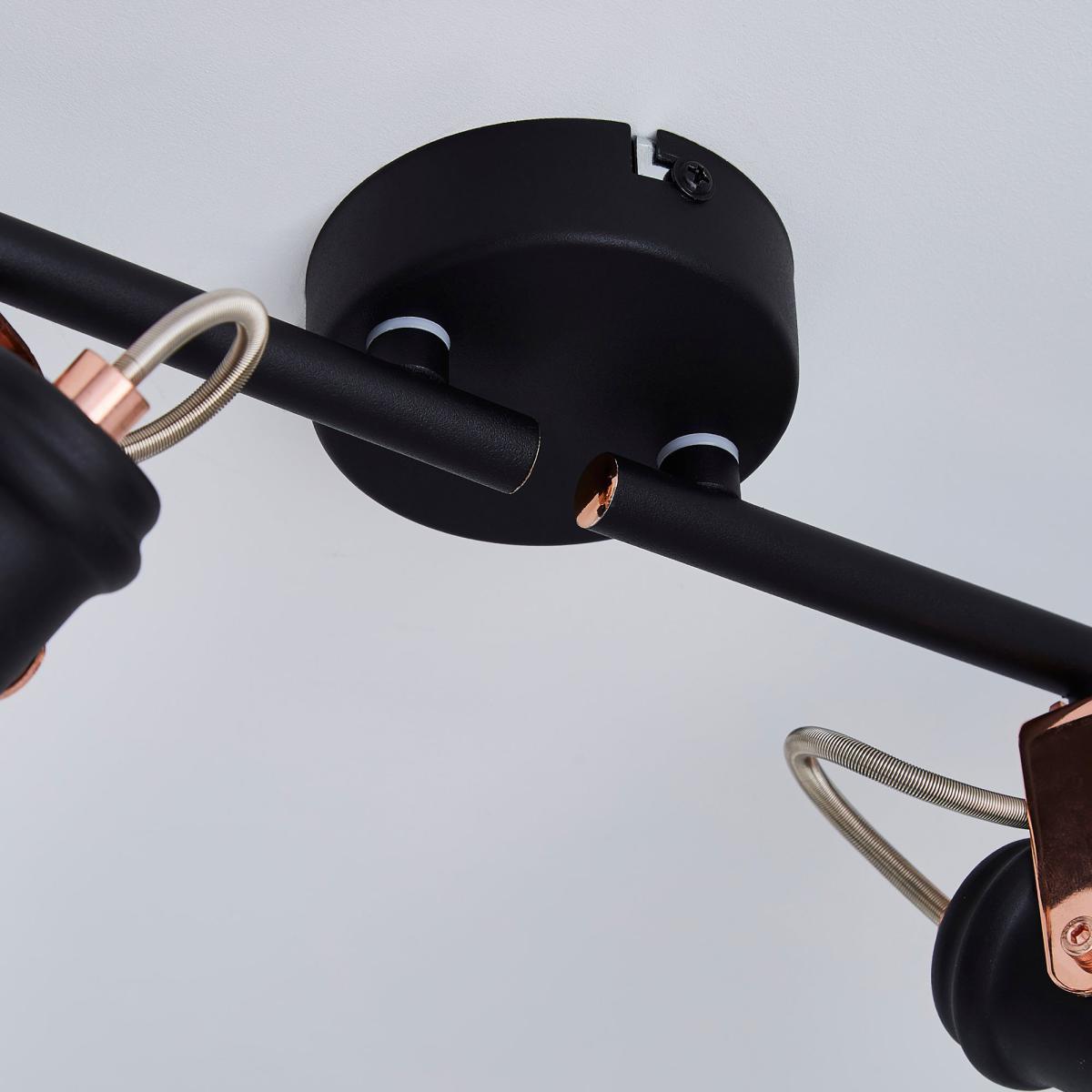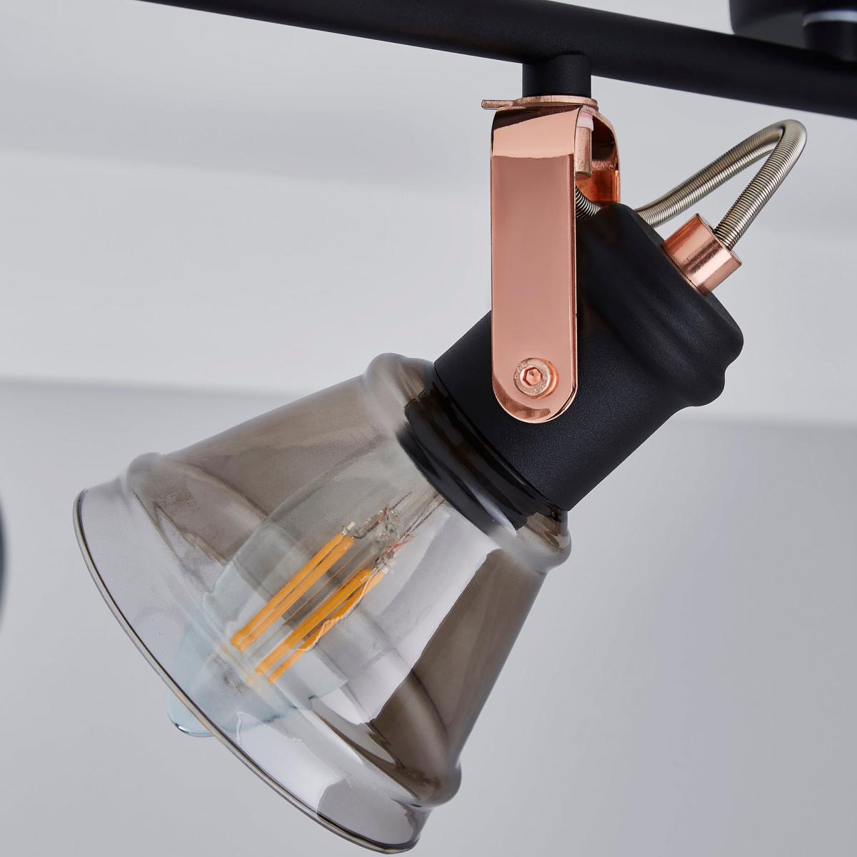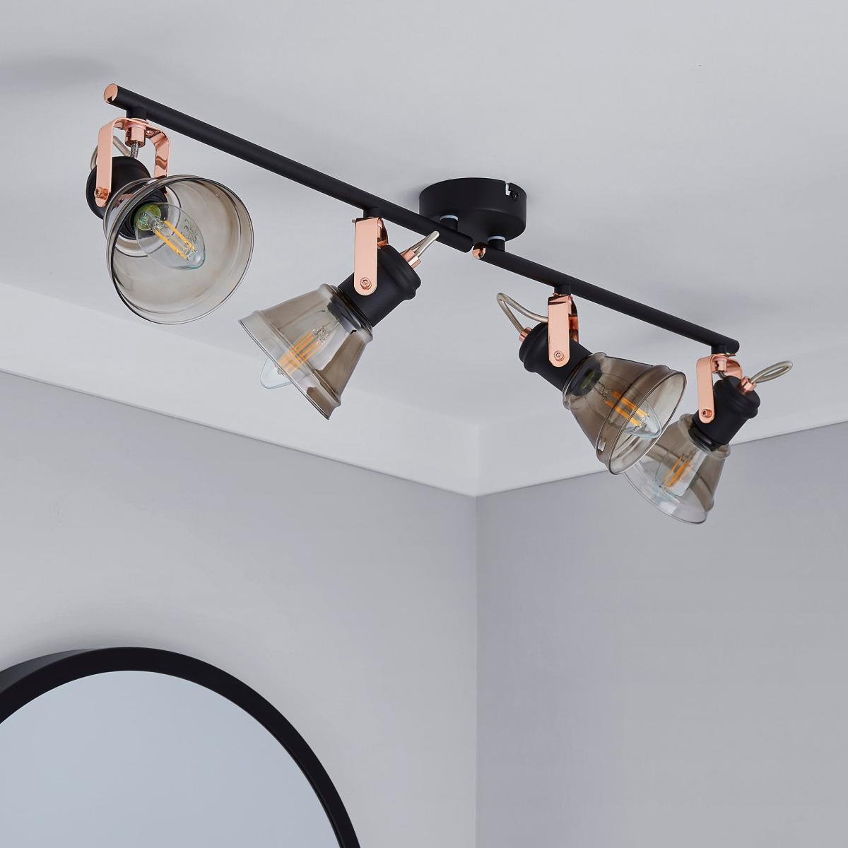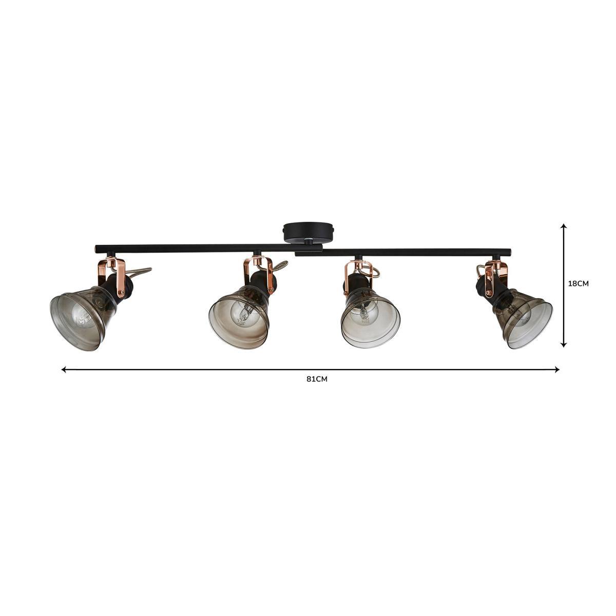Featuring a bar with four spot lights, this contemporary, industrial inspired ceiling fitting is finished with smoke glass shades and copper detailing with a matt black body.