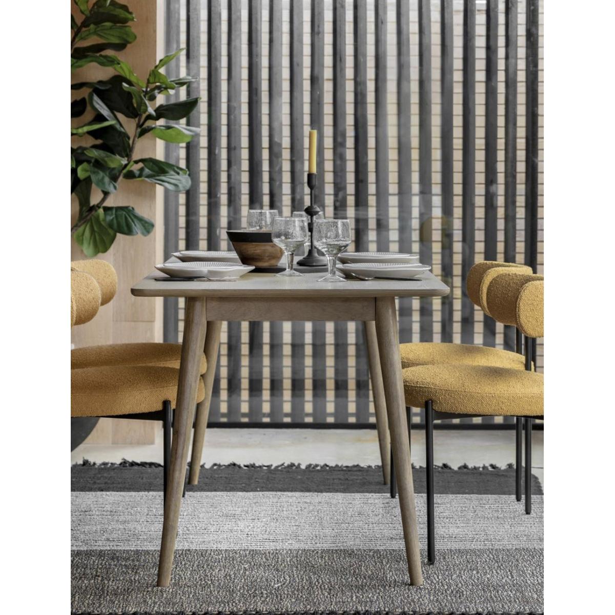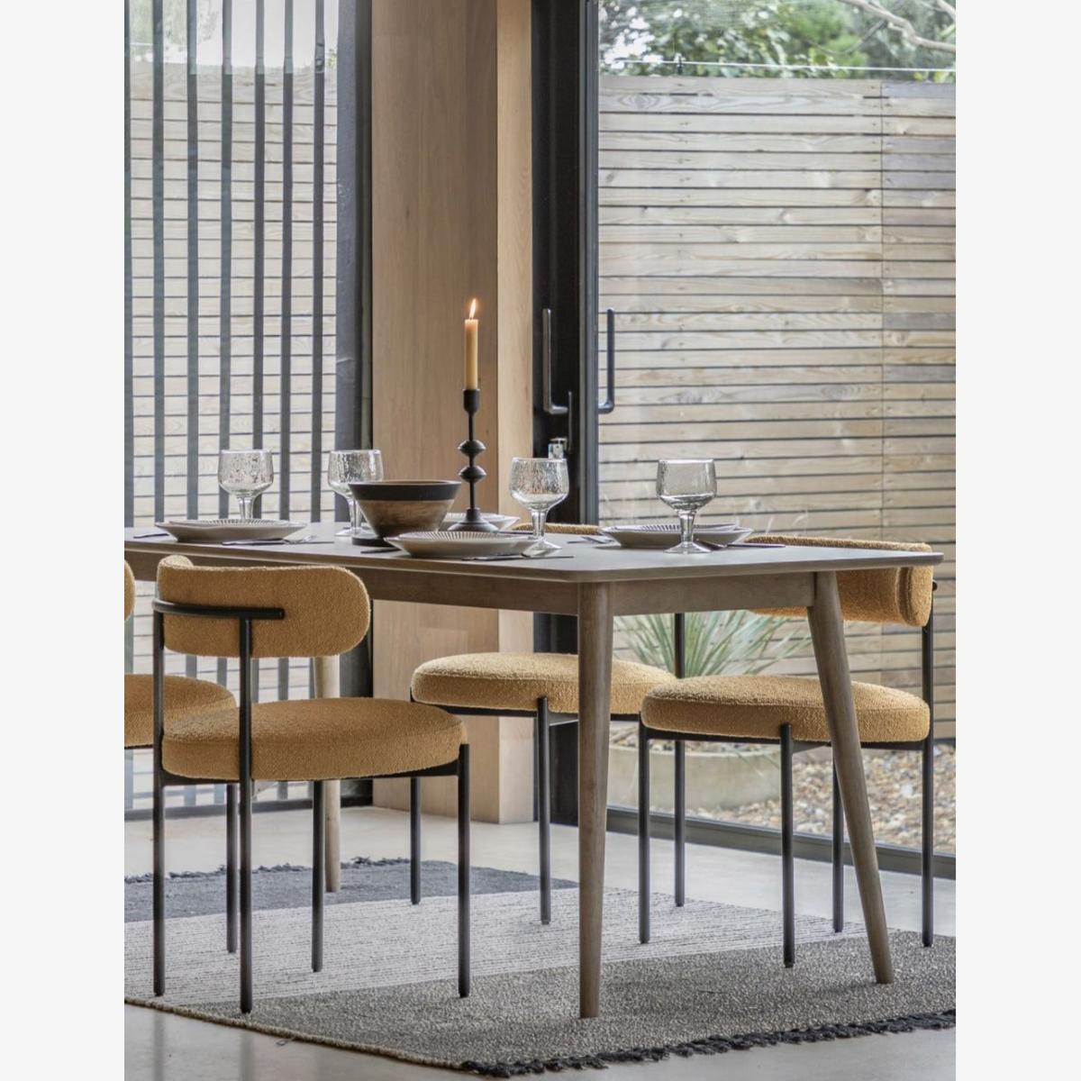 I’m a fan of the Miles table for its clean lines and tapered legs, which give it a light, unfussy look that suits both Scandi and modern-minimal interiors. The warm timber finish pairs equally well with muted neutrals or richer accent tones, making it a versatile anchor in an open-plan space or a dedicated dining room. For styling, keep the tabletop clear of clutter and introduce a textured rug underneath to define the area. A slim, linear pendant light above emphasises the table’s length, while a mix of simple ceramics, a tall candlestick or a low, sculptural vase keeps the look practical yet considered.