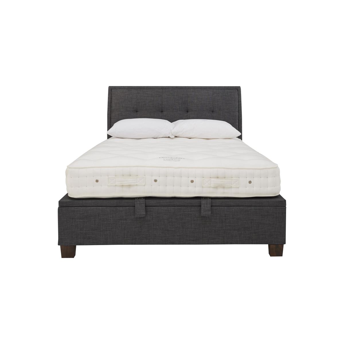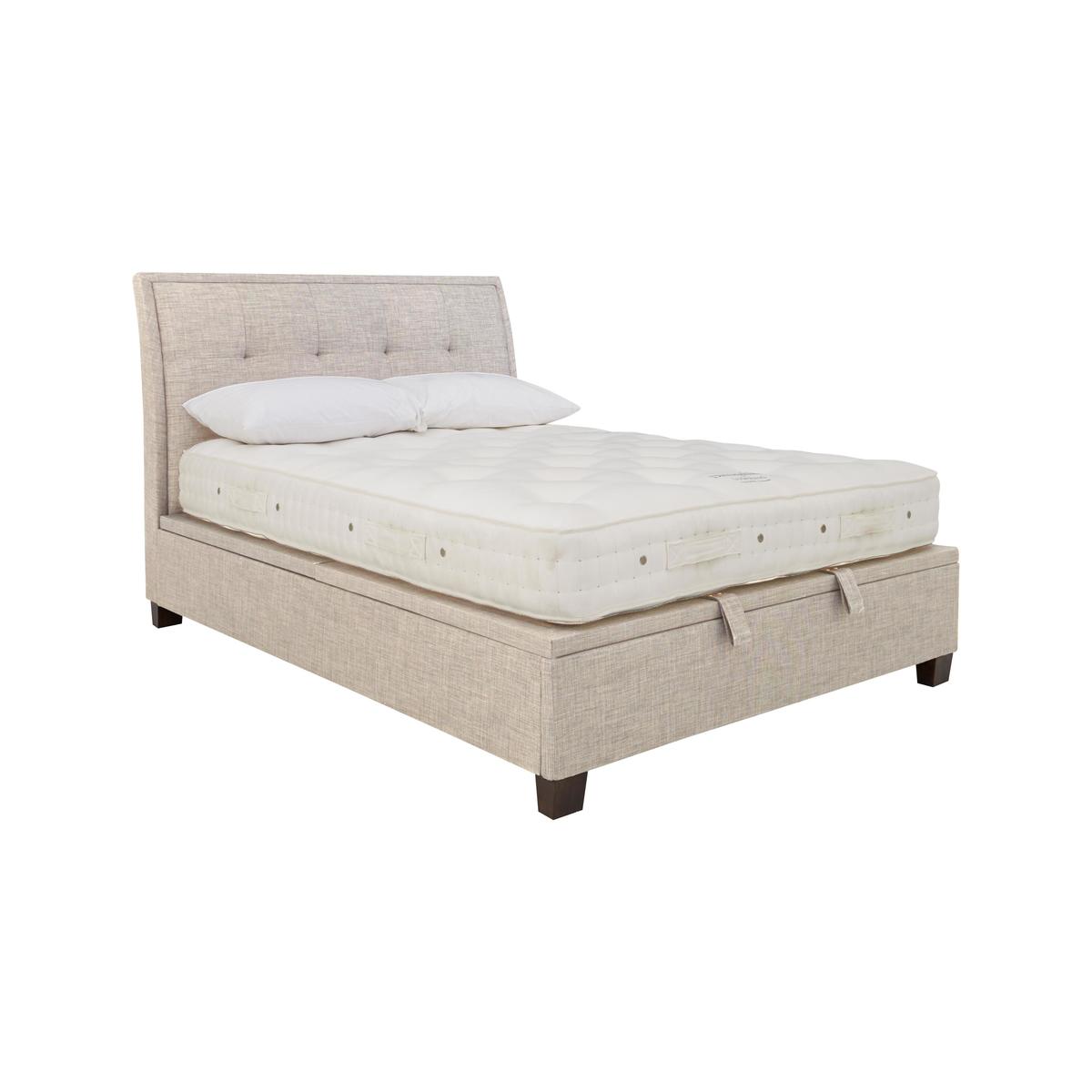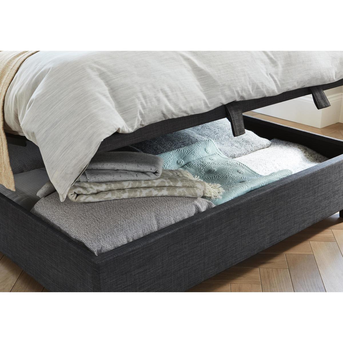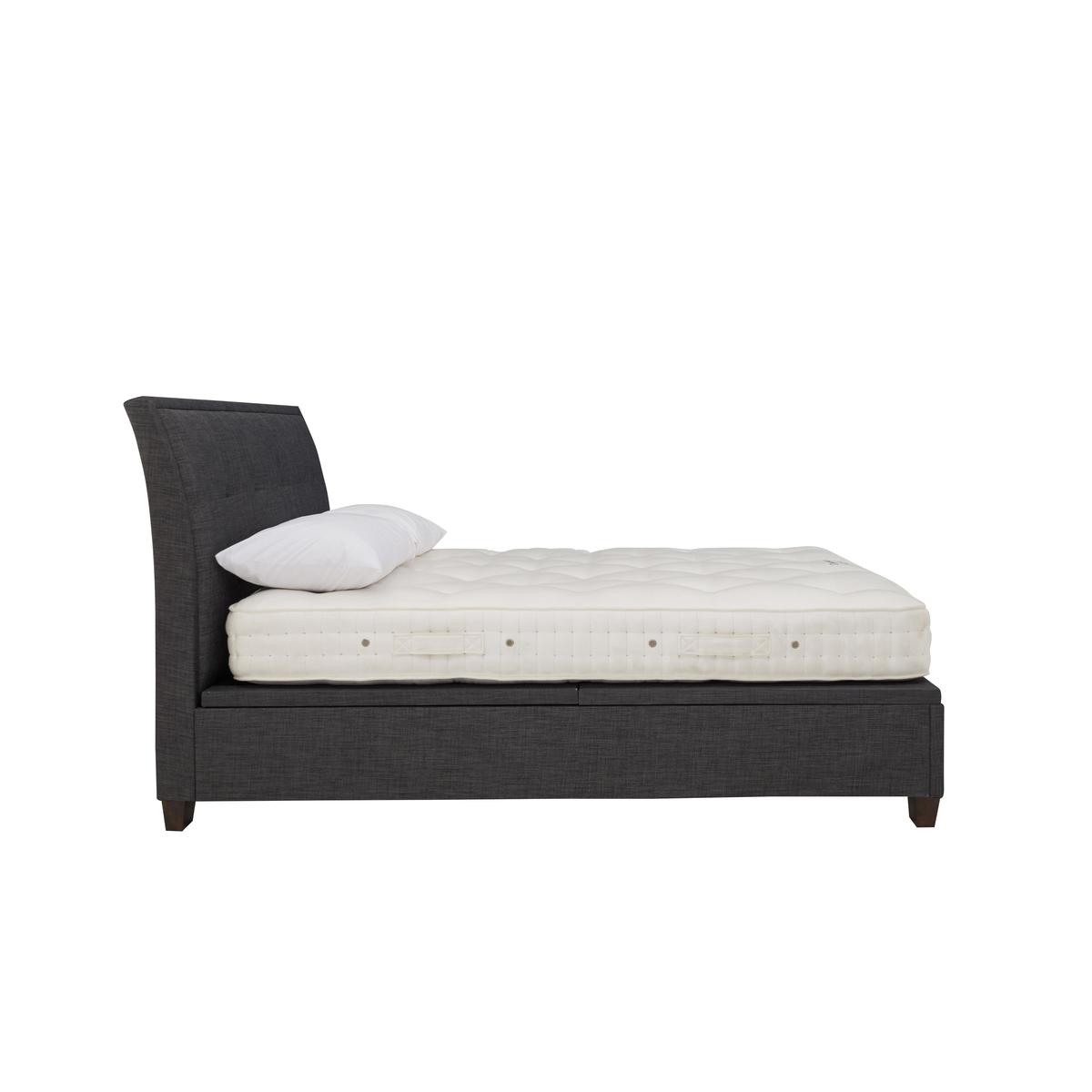 Elegant style plus useful storage – the Miles ottoman bed frame is everything your contemporary bedroom needs. Beautifully upholstered, this bed frame with gently arched headboard features modern minimal buttoning and wonderful cushioning, and is available in a selection of fabrics. It’s a practical choice too, offering a huge amount of under bed storage that’s so easy to access thanks to the piston-assisted system. The Miles ottoman bed frame is available in a range of bed sizes and is suitable for any standard mattress. Elegant buttoned headboard. Spacious easy-lift ottoman storage. Beautifully upholstered in a choice of colours. Stylish and elegant, the Miles ottoman bed frame is a classic upholstered bedframe with lovely contemporary details and a practical approach to bedroom storage. Offering a modern twist on traditional style elements, it features a gently curved square-edged headboard with understated and beautifully executed stitching and buttoning. And along with superb style, this bedframe offers excellent storage. Simply lift the ottoman bed base – the clever piston-assisted system makes it effortless – and you’ll find a large storage area that’s perfect for pillows, duvets and more. This sophisticated bed frame is upholstered in a soft yet hardwearing high-quality fabric, available in a selection of colours, and comes in a choice of bed sizes. The ventilated platform bed base has sprung slats and is designed to support any type of standard mattress. Thoughtfully designed and well crafted, the Miles ottoman bed frame is the perfect centrepiece for any bedroom. Mattress available separately.