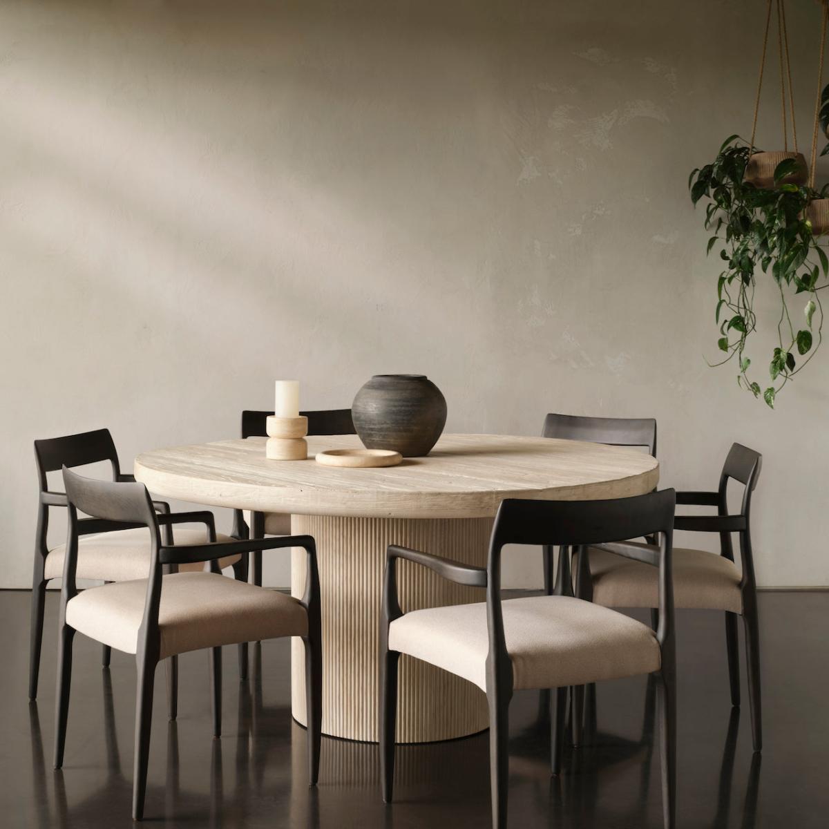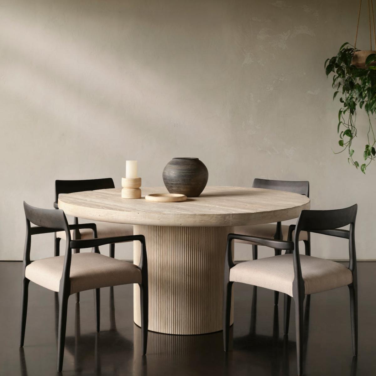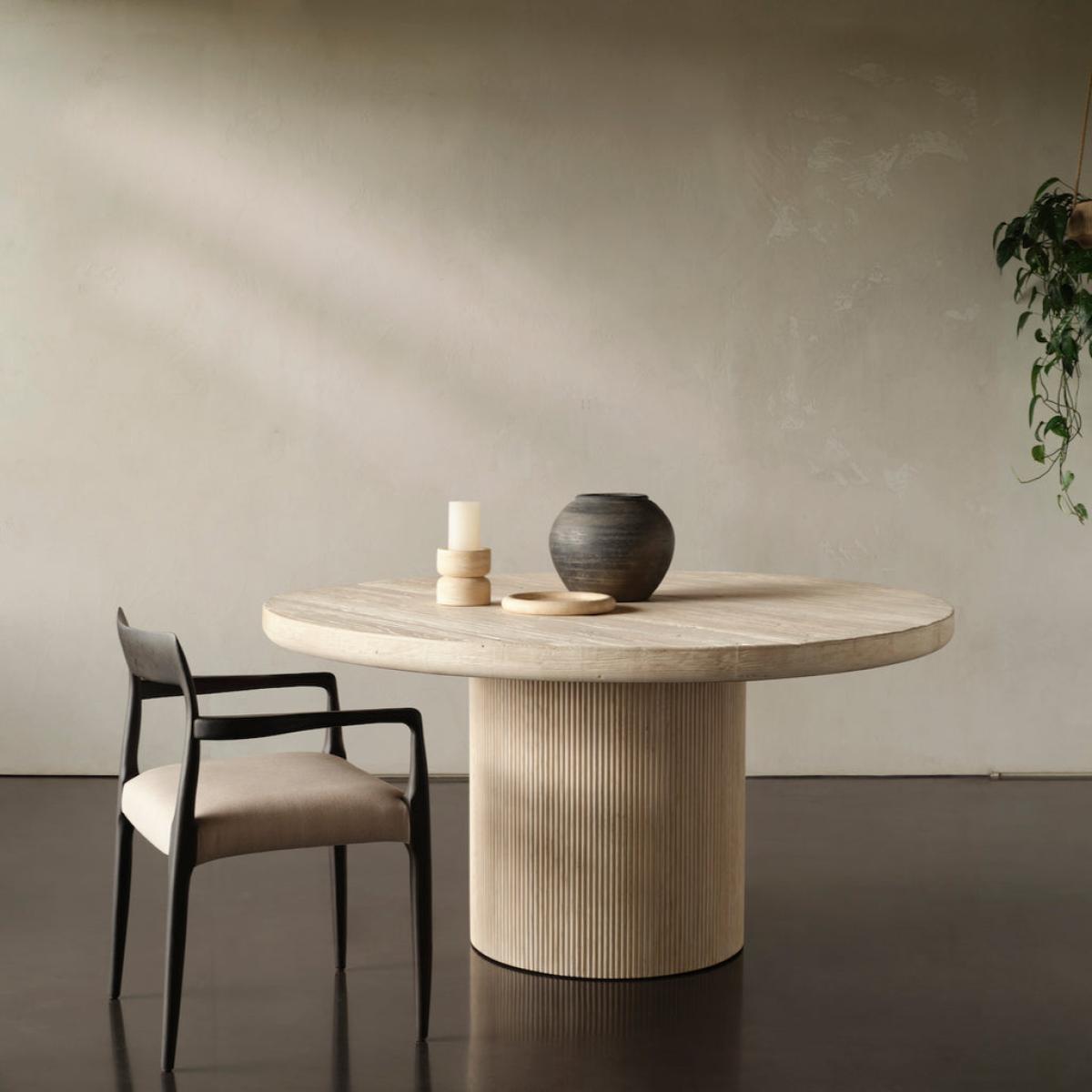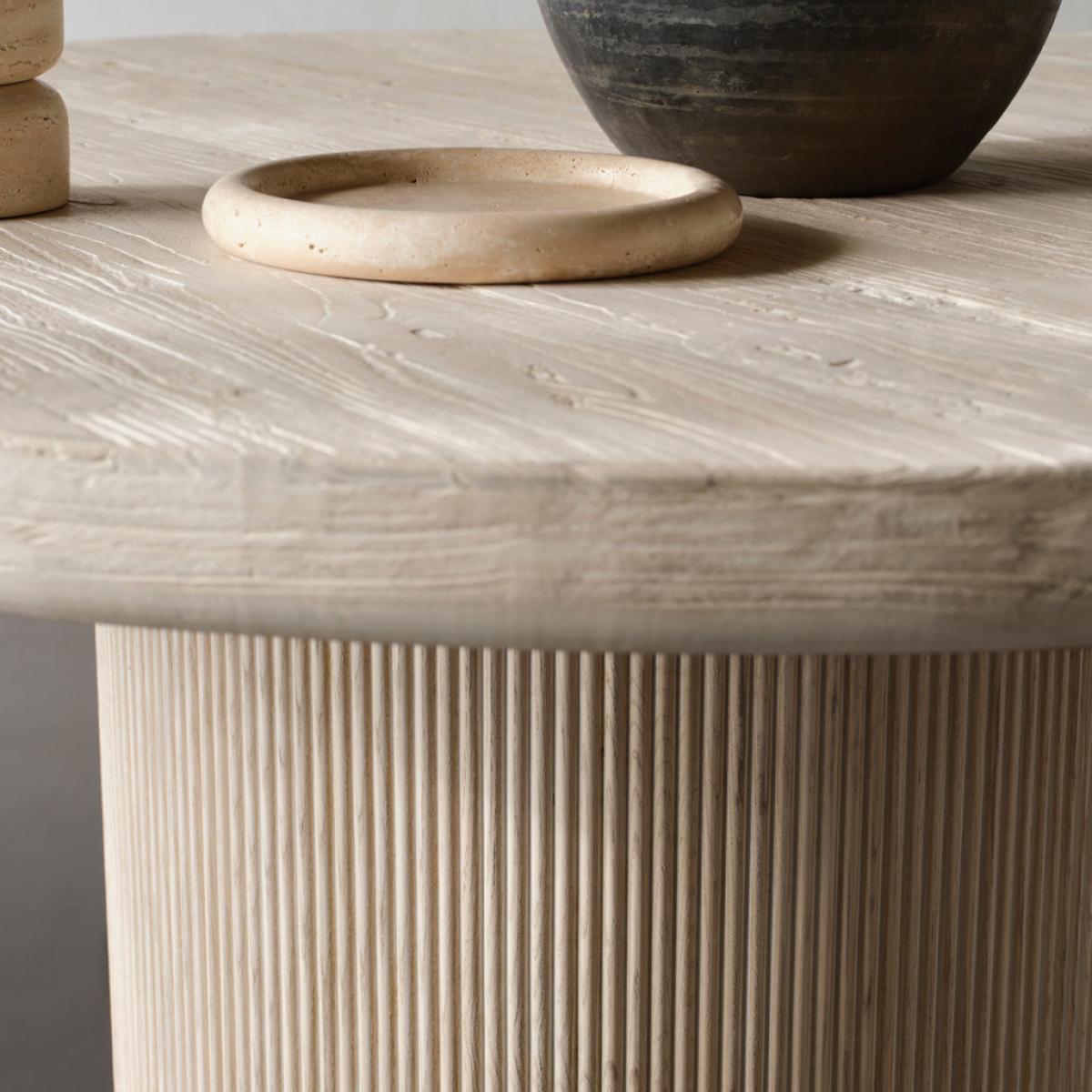 The Milford round wooden dining table is a stunning new addition to our furniture range. Made of reclaimed elm the surface of the table has beautiful grain detail and smooth edges complemented by a modern base with ribbed detail. A soft white wash completes the look and lightens the tone of the wood to a light blond colour. Seats 4-6 people.