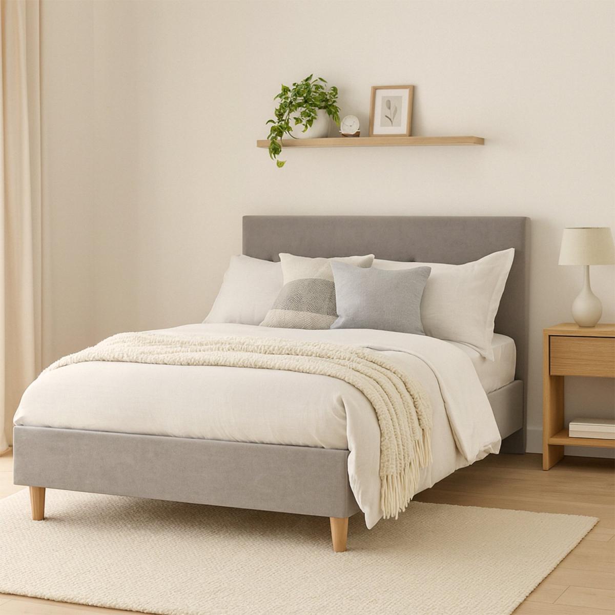 Millbrook bed frames are handcrafted in the UK, with solid wooden slats offering firm support. Thoughtfully designed with space beneath for extra storage, they combine practicality with style. Upholstered in six curated fabrics (four plush velvets and two textured wovens), to suit any interior. Swatches available to order. Available in Double, King, and Super King sizes. Taylor, a buttoned headboard with a single horizontal row of fabric-covered buttons, striking the perfect balance between simplicity and character. Proudly made and upholstered in the UK using carefully selected, high-quality materials for lasting comfort and style. Each bed is made to order, handcrafted by skilled upholsterers, and finished in your choice of beautiful fabrics. Our made to order furniture service means you can choose from different options, such as fabric, size and shape to create a beautiful bespoke piece of furniture. Because this piece is designed just for you, you might notice the delivery time is a little longer than usual. A plush velvet fabric that offers a smooth, inviting feel with a soft texture and subtle sheen. Fabric frame. Velvet fabric - 100% polyester. Wooden feet. Base with wooden slats. No storage. Size W191, L217, H100cm. Height to top of siderail 37.5cm. 15cm clearance between floor and underside of bed. Weight 69.9kg. Total maximum user weight 220kg. Supplied assembled - 2 people recommended. Package Dimensions: Package 1 dimensions: H22, W29, D207cm. Package 1 weight: 25.5kg. Package 2 dimensions: H9, W122, D183cm. Package 2 weight: 30kg. Package 3 dimensions: H7, W25, D183cm. Package 3 weight: 19.5kg. General Information: Manufacturer's 1 year guarantee.