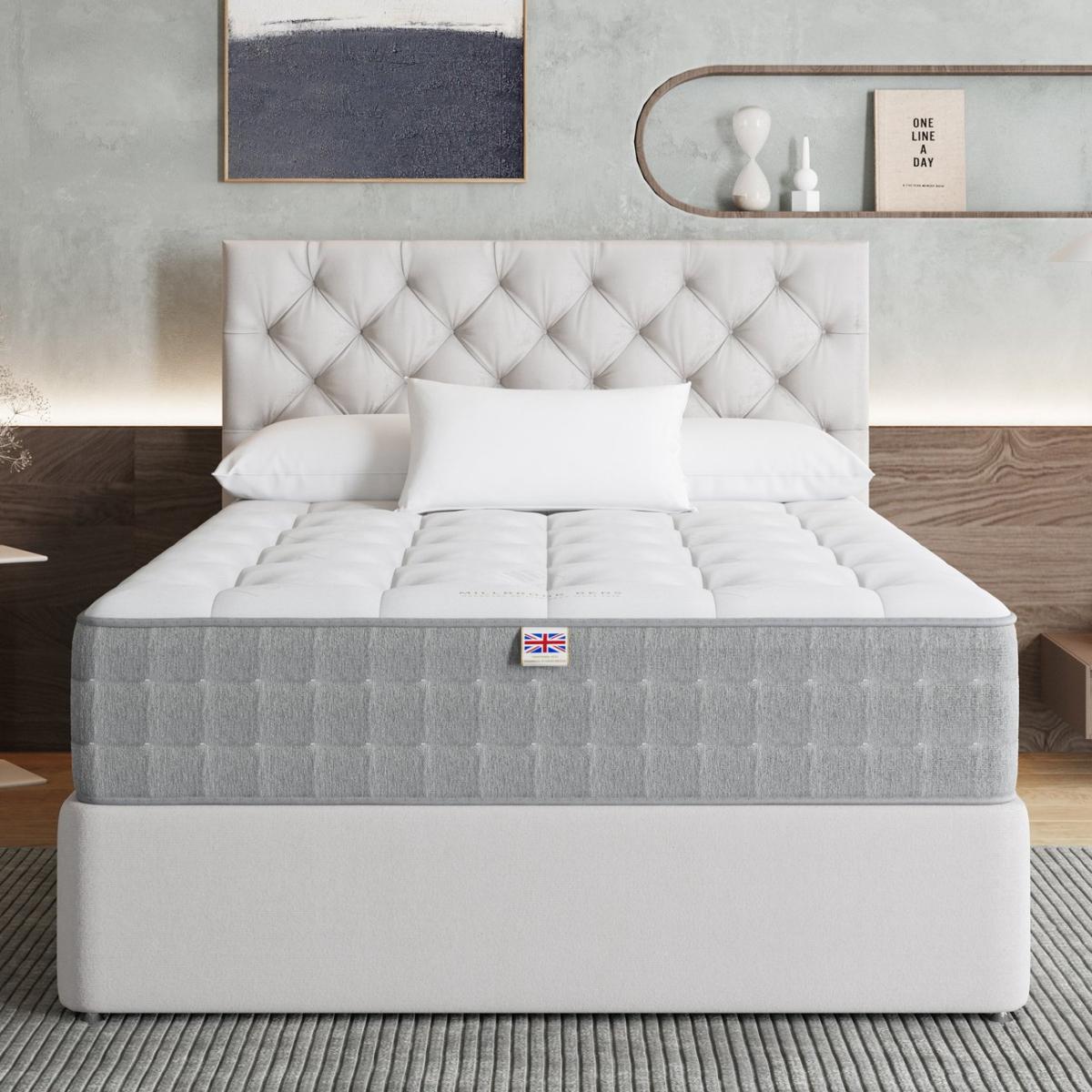 The Millbrook Beds Elysian 4000 mattress blends premium materials with advanced tech for luxury support and comfort. Our Smooth Tech tuft-free cover removes lumps, ensuring a plush, even surface. With 4000 pocket springs and Ultra Edge border tech, and 2 rows of side stitching it delivers edge-to-edge support. Made with 100% natural fillings, including English Spun Cotton and Hampshire wool, it enhances deep, uninterrupted sleep. A perfect balance of luxury, durability, and relaxation. Sumptuous, chemical-free unique Millbrook Smooth-Tech tuft free sleeping surface. Part of the Elysian collection. Medium feel. Pocket sprung mattress with 4000 springs. Damask cover with tufted finish. No roll together. Mattress size W135, L190, D30cm. Mattress Weight 46kg. No-turn mattress. Rotate mattress regularly. Made in the UK. Package Dimensions: Package 1 dimensions: H30, W140, D195cm. Package 1 weight: 44kg. General information: Manufacturer's 5 year guarantee.