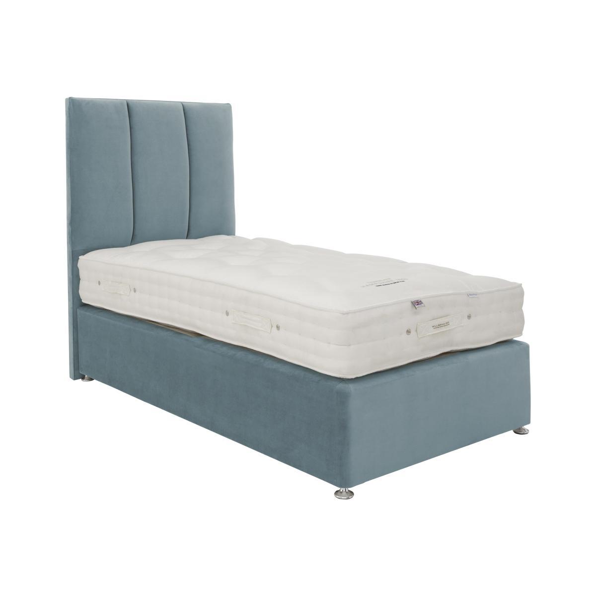 Beautifully handmade in Britain by Millbrook Beds, the great value Millbrook Beds Hampshire collection features a choice of luxurious mattresses and divan sets. Mattresses are available in a range of firmness ratings for more personalised sleeping comfort, and have layers of wonderful natural fillings that include Egyptian cotton, English cotton, Hampshire wool, silk and cashgora. Pocket sprung for extra support, the platform-top divan bases are available in a choice of upholstery fabrics and have optional storage drawers. The Millbrook Beds Hampshire collection is exclusively available at Furniture Village. Millbrook Beds is a National Bed Federation bed manufacturer of the year for 2018-2019. Handmade in Britain with cotton, Hampshire wool and silk. 4000 pocket springs in king size in a choice of firmness. Pocket-sprung divan base in a choice of fabrics. Beautifully handcrafted in Britain, the Millbrook Beds Hampshire 4000 divan set is a luxurious choice and is, unusually, available in a wide choice of comfort ratings so you can find the one that’s perfect for you. The fabulous mattress is 28 cm deep and has 4000 pocket springs in king size, layered with natural Egyptian cotton, English cotton, Hampshire wool and silk. It’s hand taped, hand tufted and finished with cotton viscose cover. Eight handles make turning and rotating easy. The platform-top, firm-edge divan base has 1000 pocket springs in king size, so it’s very supportive. It’s offered with optional storage drawers, available in a range of configurations. For the perfect finishing touch, pair this divan set with the Millbrook Beds Alton floor standing headboard. The great value Millbrook Beds Hampshire 4000 divan set is part of the Millbrook Beds Hampshire 4000 collection. Millbrook Beds is a National Bed Federation bed manufacturer of the year for 2018-2019. A Furniture Village exclusive. Headboard is an optional extra. Product images are representative. Find out more. Please note. The mattress should be aired for four hours after delivery to freshen and remove any aroma from storage. It may take time for your mattress to attain its full size once the springs have settled to the correct position. This is due to the mattress being upright during transit. Settlement of fillings and indentations caused by body weight compressing the fillings are natural and not considered defects. This can be minimised by regular rotating (unless yours is a dual tension mattress). We recommend the use of a mattress protector.