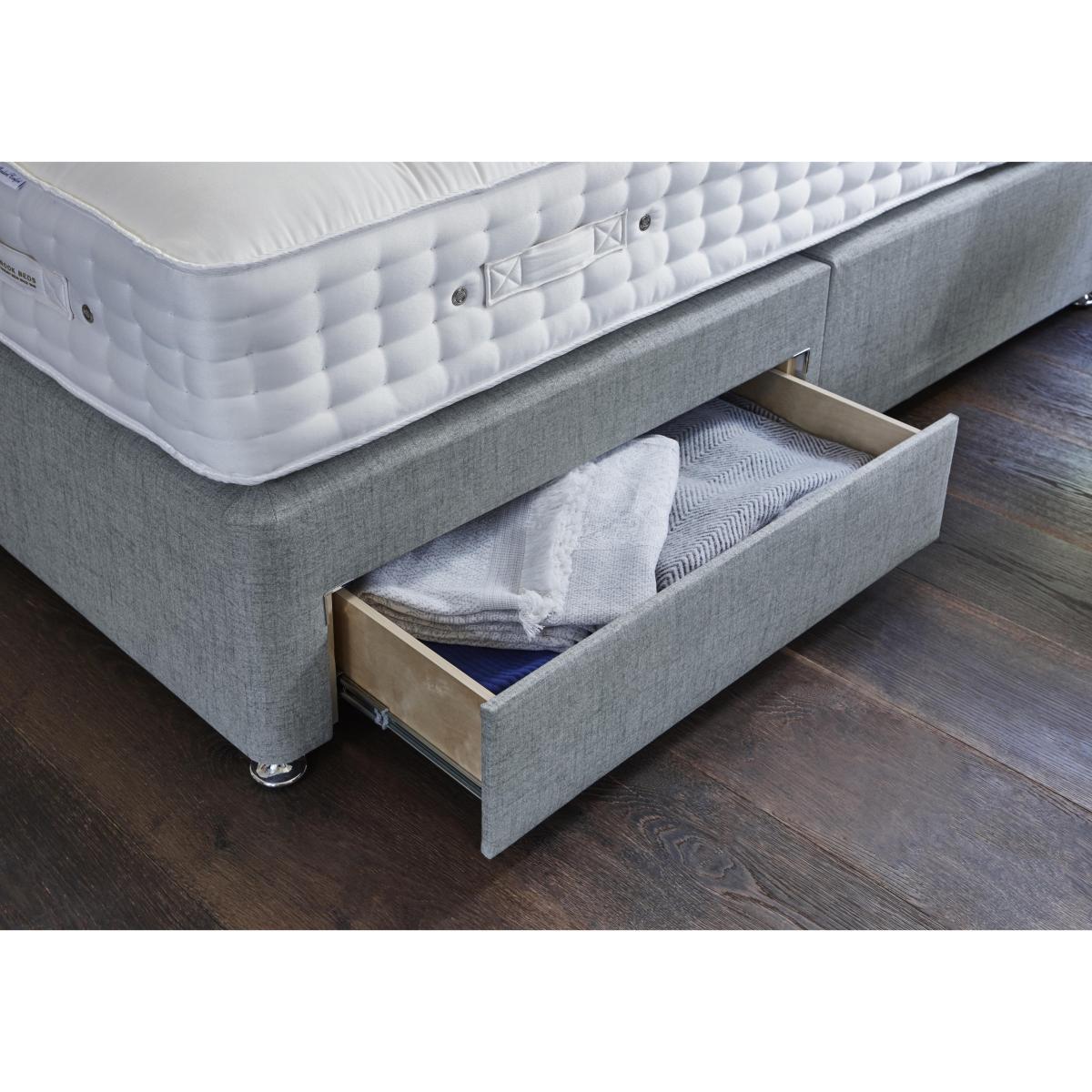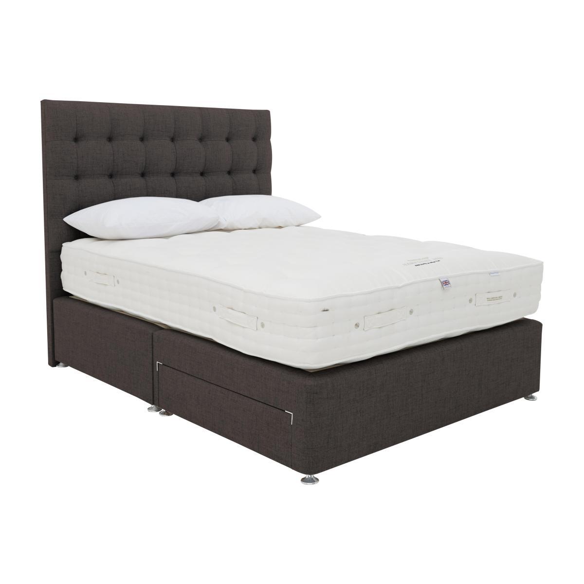 Beautifully handmade in Britain by Millbrook Beds, the great value Millbrook Beds Hampshire collection features a choice of luxurious mattresses and divan sets. Mattresses are available in a range of firmness ratings for more personalised sleeping comfort, and have layers of wonderful natural fillings that include Egyptian cotton, English cotton, Hampshire wool, silk and cashgora. Pocket sprung for extra support, the platform-top divan bases are available in a choice of upholstery fabrics and have optional storage drawers. The Millbrook Beds Hampshire collection is exclusively available at Furniture Village. Millbrook Beds is a National Bed Federation bed manufacturer of the year for 2018-2019. Handmade in Britain with cotton, wool, silk and cashgora. 6000 pocket springs in king size in a choice of firmness. Pocket-sprung divan base in a choice of fabrics. Treat yourself to a luxurious night’s sleep, every night, with the British-made Millbrook Beds Hampshire 6000 divan set. Handcrafted in England, this fabulous mattress and divan base set includes a 32 cm mattress with 6000 pocket springs in king size and all-natural fillings of cotton, Hampshire wool, silk, and cashgora – an ultra-soft fibre that’s a cross between angora and cashmere. Even better, it’s available in your choice of firmness so you can select the mattress comfort that’s right for you. It’s hand-tufted and hand-taped, finished with a cotton viscose cover, and has eight handles for easy turning and rotating. The firm-edge divan base has 1000 supportive pocket springs in king size and optional storage drawers. Complete the look with the stunning Millbrook Beds Stroud floor standing headboard. The great value Millbrook Beds Hampshire 6000 divan set is part of the Millbrook Beds Hampshire 6000 collection. Millbrook Beds is a National Bed Federation bed manufacturer of the year for 2018-19. Only at Furniture Village. Product images are representative. Find out more. Headboard is an optional extra. Please note. The mattress should be aired for four hours after delivery to freshen and remove any aroma from storage. It may take time for your mattress to attain its full size once the springs have settled to the correct position. This is due to the mattress being upright during transit. Settlement of fillings and indentations caused by body weight compressing the fillings are natural and not considered defects. This can be minimised by regular rotating (unless yours is a dual tension mattress). We recommend the use of a mattress protector.