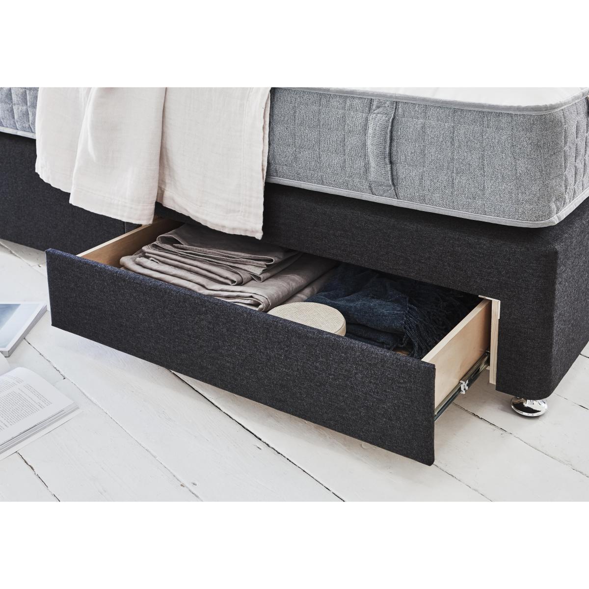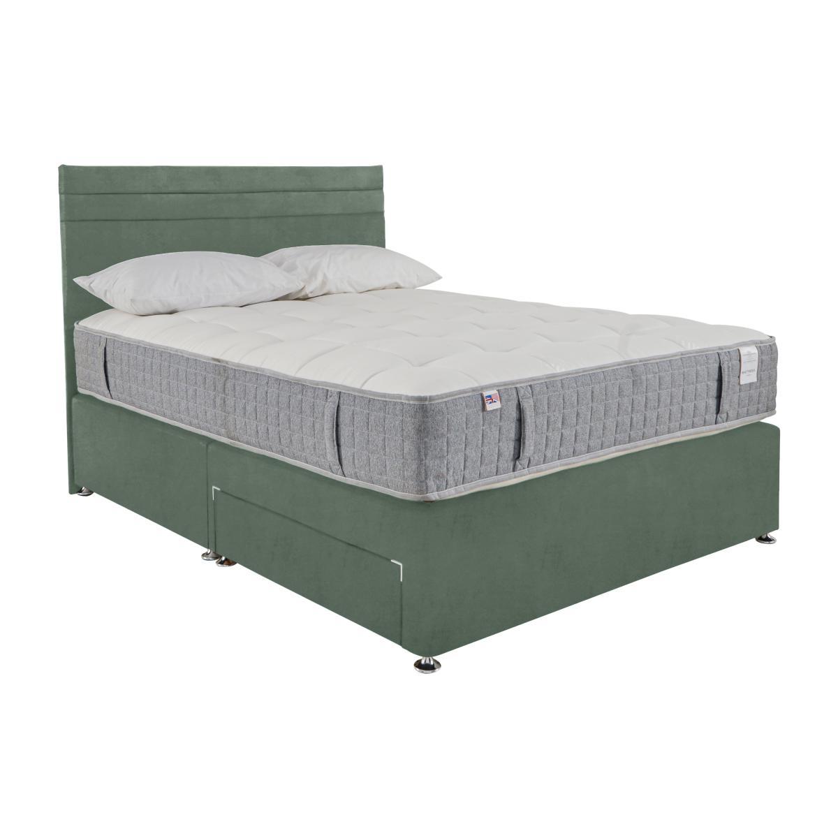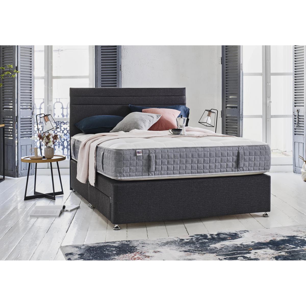 A stylish divan base in a wide choice of colours, with a comfy, cooling eco-friendly mattress using recycled plastic bottles instead of foam, saving them from landfill. Headboard shown available separately. Why you'll love it. Luxurious modern divan set from Millbrook Beds. With a breathable, supportive sprung mattress. Mattress is eco-friendly, 100% recyclable and foam free. 1000 encapsulated pocket springs in king size. Layers of cooling Hampshire wool and English spun cotton. Mattress fillings encased in revolutionary Nemoflex®. A yarn and fibre blend made from recycled plastic bottles. Hidden tufting for a smooth, flat sleeping surface. Contemporary divan base in a wide choice of colours. With the option of drawer storage. Handmade in the UK, exclusively for Furniture Village. What you need to know. Mattress type: Pocket spring. Mattress depth: 29 cm. Firmness: Medium feel. Springs: 1000 pocket springs in king size. Pillow top: No. Fillings: Breathable Nemoflex® recycled yarn and fibre, temperature regulating Hampshire Wool, English spun-cotton. Borders: Nemoflex® which promotes airflow. Vertical carry handles. Edge support: Pocket springs and reinforced border for edge to edge support. Cover: Soft, chemical free, viscose cotton. Requires turning: No. Sizes: Single, double, king, super king. Drawer configurations available: 2 drawer, 4 drawer, 2+2 drawer. Double, king and super king divan bases are delivered in two pieces for ease of delivery. Mattress care: Air for 4 hours before using to remove any odour. Indentations caused by settlement of fillings or body weight are normal and are not considered defects. If used on a slatted bed frame, slats must be no more than 7 cm apart. Rotate regularly. We recommend the use of a mattress protector.
