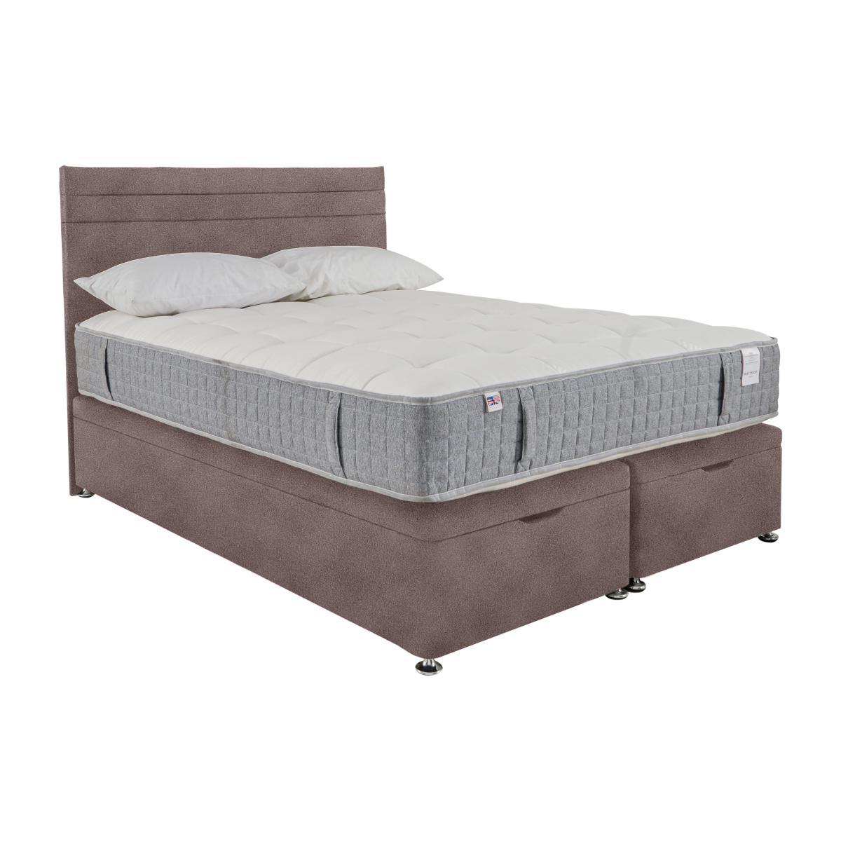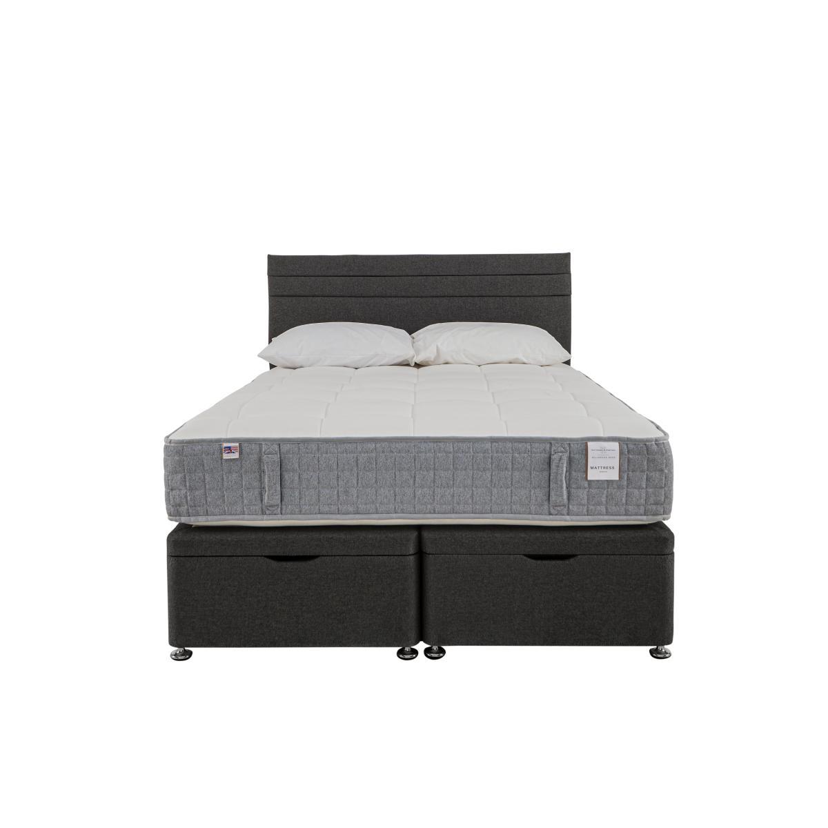 Ottoman divan base in a wide choice of colours, with a comfy, cooling mattress which uses a pioneering eco-friendly material instead of foam, saving bottles from landfill. Headboard shown available separately. Why you'll love it. Luxurious modern divan set from Millbrook Beds. With a breathable, supportive sprung mattress. Mattress is eco-friendly, 100% recyclable and foam free. 1000 encapsulated pocket springs in king size. Layers of cooling Hampshire wool and English spun cotton. Mattress fillings encased in revolutionary Nemoflex®. A yarn and fibre blend made from recycled plastic bottles. Hidden tufting for a smooth, flat sleeping surface. Contemporary divan base in a wide choice of colours. Piston-assisted end lift ottoman, easy to open. Handmade in the UK, exclusively for Furniture Village. What you need to know. Mattress type: Pocket spring. Mattress depth: 29 cm. Firmness: Medium feel. Springs: 1000 pocket springs in king size. Pillow top: No. Fillings: Breathable Nemoflex® recycled yarn and fibre, temperature regulating Hampshire Wool, English spun-cotton. Borders: Nemoflex® which promotes airflow. Vertical carry handles. ???. Edge support: Pocket springs and reinforced border for edge to edge support. Cover: Soft, chemical free, viscose cotton. Requires turning: No. Sizes: Single, double, king, super king. Please take care opening and closing the ottoman. Double, king and super king divan bases are delivered in two pieces for ease of delivery. Mattress care: Air for 4 hours before using to remove any odour. Indentations caused by settlement of fillings or body weight are normal and are not considered defects. If used on a slatted bed frame, slats must be no more than 7 cm apart. Rotate regularly. We recommend the use of a mattress protector.