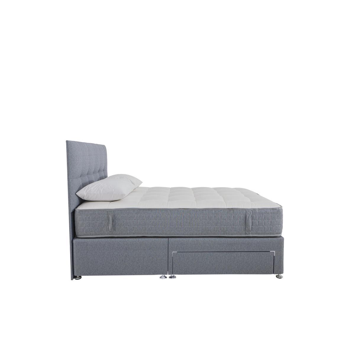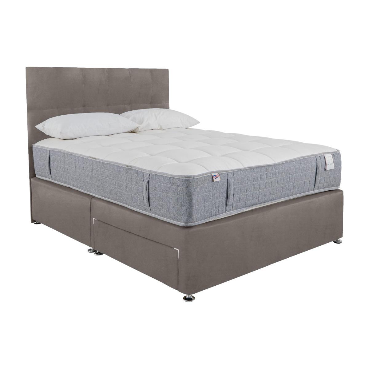 Stylish, comfortable and eco-friendly divan bed with a base in a wide choice of upholstery. The sprung mattress replaces foam with a pioneering recycled material. Headboard shown available separately. Why you'll love it. Luxurious modern divan set from Millbrook Beds. With a breathable, supportive sprung mattress. Mattress is eco-friendly, 100% recyclable and foam free. 1000 encapsulated pocket springs in king size. Layers of cooling Hampshire wool and English spun cotton. Mattress fillings encased in revolutionary Nemoflex®. A yarn and fibre blend made from recycled plastic bottles. Hidden tufting for a smooth, flat sleeping surface. Contemporary divan base in a wide choice of colours. With the option of drawer storage. Handmade in the UK, exclusively for Furniture Village. What you need to know. Mattress type: Pocket spring. Mattress depth: 30 cm. Firmness: Medium feel. Springs: 2000 pocket springs in king size. Pillow top: No. Fillings: Breathable Nemoflex® recycled yarn and fibre, temperature regulating Hampshire Wool, English spun-cotton. Borders: Nemoflex® which promotes airflow. Vertical carry handles. ???. Edge support: Pocket springs and reinforced border for edge to edge support. Cover: Viscose cotton. Requires turning: No. Sizes: Single, double, king, super king. Drawer configurations available: 2 drawer, 4 drawer, 2+2 drawer. Double, king and super king divan bases are delivered in two pieces for ease of delivery. Mattress care: Air for 4 hours before using to remove any odour. Indentations caused by settlement of fillings or body weight are normal and are not considered defects. If used on a slatted bed frame, slats must be no more than 7 cm apart. Rotate regularly. We recommend the use of a mattress protector.