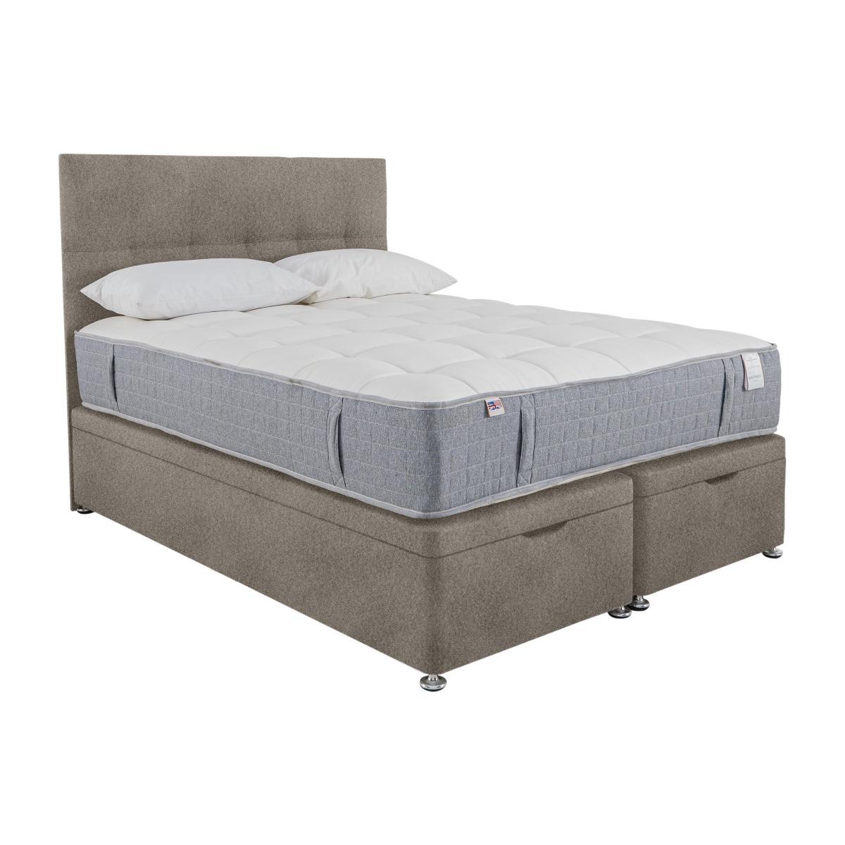Stylish divan with a comfy, cooling sprung mattress replacing foam with a pioneering recycled material. The ottoman divan base comes in a wide choice of colours. Headboard shown available separately. Why you'll love it. Luxurious modern divan set from Millbrook Beds. With a breathable, supportive sprung mattress. Mattress is eco-friendly, 100% recyclable and foam free. 2000 encapsulated pocket springs in king size. Layers of cooling Hampshire wool and English spun cotton. Mattress fillings encased in revolutionary Nemoflex®. A yarn and fibre blend made from recycled plastic bottles. Hidden tufting for a smooth, flat sleeping surface. Contemporary divan base in a wide choice of colours. Piston-assisted end lift ottoman, easy to open. Handmade in the UK, exclusively for Furniture Village. What you need to know. Mattress type: Pocket spring. Mattress depth: 30 cm. Firmness: Medium feel. Springs: 2000 pocket springs in king size. Pillow top: No. Fillings: Breathable Nemoflex® recycled yarn and fibre, temperature regulating Hampshire Wool, English spun-cotton. Borders: Nemoflex® which promotes airflow. Vertical carry handles. ???. Edge support: Pocket springs and reinforced border for edge to edge support. Cover: Viscose cotton. Requires turning: No. Sizes: Single, double, king, super king. Please take care opening and closing the ottoman. Double, king and super king divan bases are delivered in two pieces for ease of delivery. Mattress care: Air for 4 hours before using to remove any odour. Indentations caused by settlement of fillings or body weight are normal and are not considered defects. If used on a slatted bed frame, slats must be no more than 7 cm apart. Rotate regularly. We recommend the use of a mattress protector.
