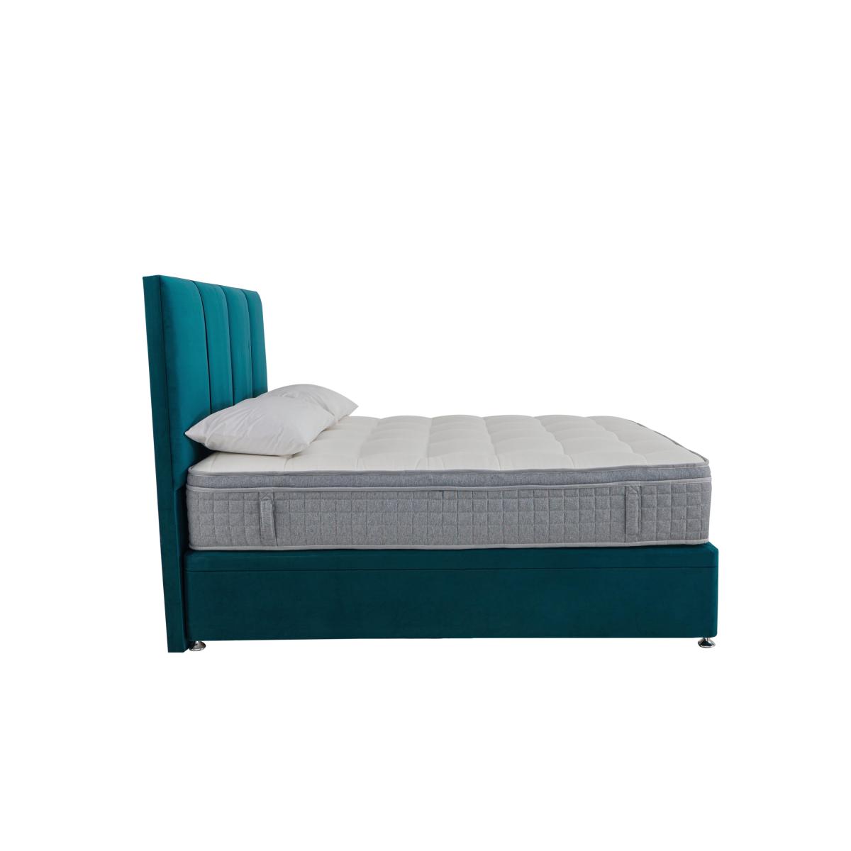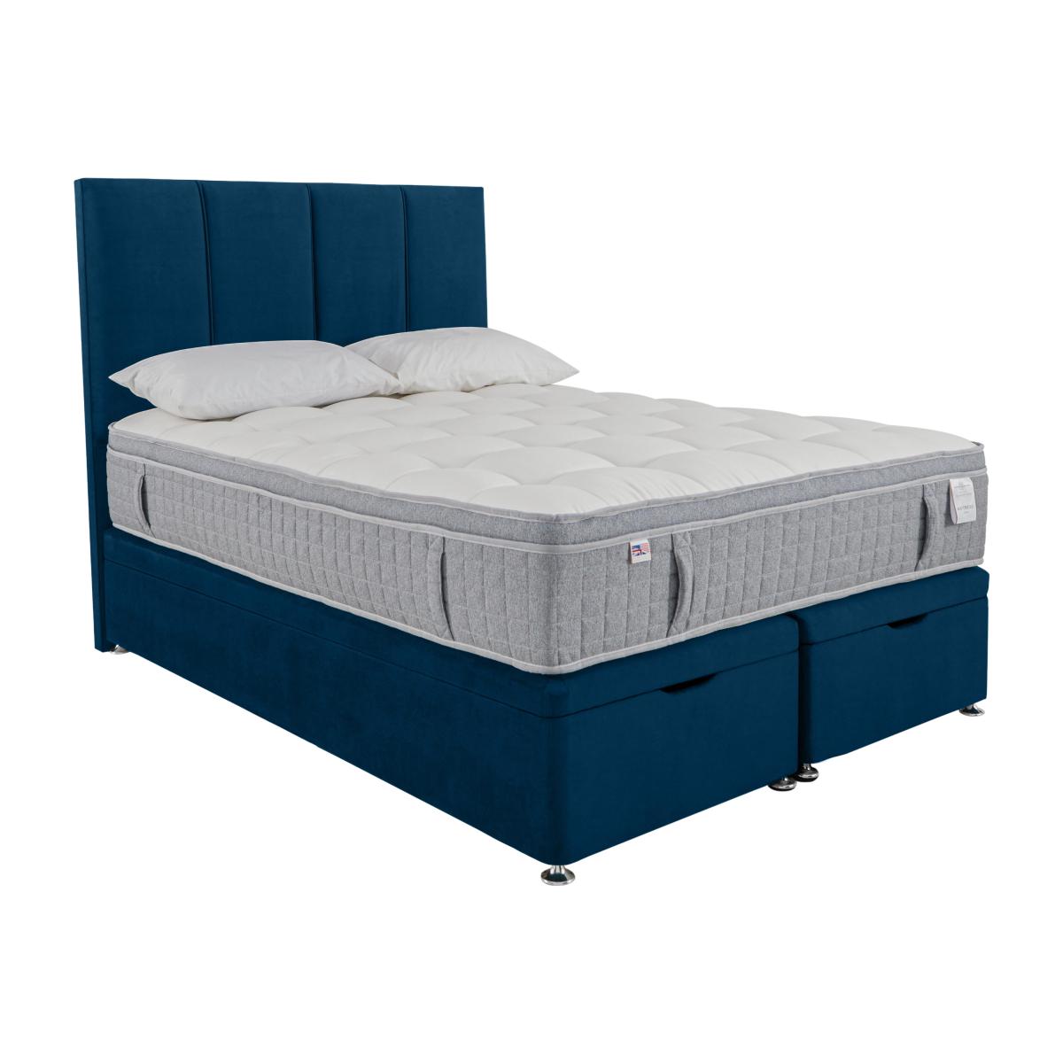 The Pure. Tech 3000 pillow top end ottoman divan set offers spacious storage, sprung and sumptuous comfort and impressive eco-credentials. The mattress uses recycled bottles instead of foam. Headboard shown available separately. Why you'll love it. Luxurious modern divan set from Millbrook Beds. With a breathable, supportive sprung mattress. Hampshire wool, silk, spun cotton and cashmere pillow top. Mattress is eco-friendly, 100% recyclable and foam free. 3000 encapsulated pocket springs in king size. Layers of cooling Hampshire wool and English spun cotton. Mattress fillings encased in revolutionary Nemoflex®. A yarn and fibre blend made from recycled plastic bottles. Hidden tufting for a smooth, flat sleeping surface. Contemporary divan base in a wide choice of colours. Piston-assisted end lift ottoman, easy to open. Handmade in the UK, exclusively for Furniture Village. What you need to know. Mattress type: Pocket spring. Mattresss depth: 32 cm. Firmness: Medium feel. Springs: 3000 pocket springs in king size. Pillow top: Yes. Fillings: Breathable Nemoflex® recycled yarn and fibre, temperature regulating Hampshire Wool, English spun-cotton. Borders: Nemoflex® which promotes airflow. Vertical carry handles. ???. Edge support: Pocket springs and reinforced border for edge to edge support. Cover: Viscose cotton. Requires turning: No. Sizes: Single, double, king, super king. Please take care opening and closing the ottoman. Double, king and super king divan bases are delivered in two pieces for ease of delivery. Mattress care: Air for 4 hours before using to remove any odour. Indentations caused by settlement of fillings or body weight are normal and are not considered defects. If used on a slatted bed frame, slats must be no more than 7 cm apart. Rotate regularly. We recommend the use of a mattress protector.
