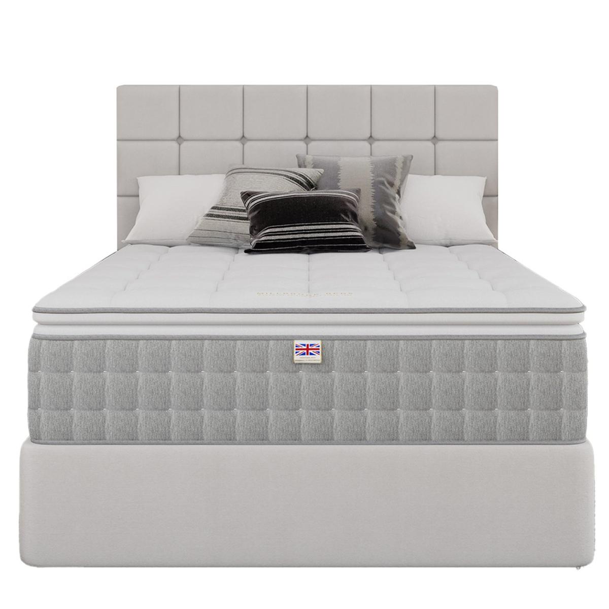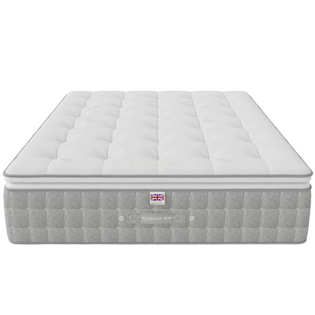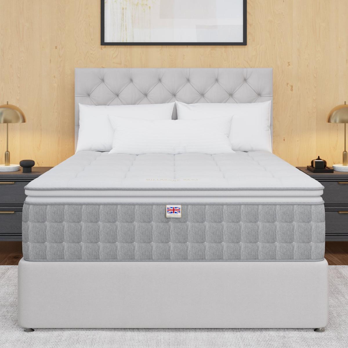 The Millbrook Beds Serenade 5000 Pillow Top offers unmatched luxury with an extra layer of luxurious, cushioned comfort that cradles your body for a restful sleep. Our Smooth Tech tuft free cover removes lumps, ensuring a plush surface. Featuring 5000 pocket springs and Ultra Edge border tech, and 2 rows of side stitching provides edge-to-edge support. Made with 100% natural fillings, including English Spun Cotton and Hampshire wool, it enhances deep, uninterrupted sleep, offering the perfect balance of luxury, comfort, and relaxation. Part of the Serenade collection. Medium feel. Pocket sprung mattress with 5000 springs. Damask cover with tufted finish. No roll together. Mattress size W135, L190, D36cm. Mattress Weight 46kg. No-turn mattress. Rotate mattress regularly. Made in the UK. Package Dimensions: Package 1 dimensions: H33, W140, D195cm. Package 1 weight: 44kg. General information: Manufacturer's 5 year guarantee.
