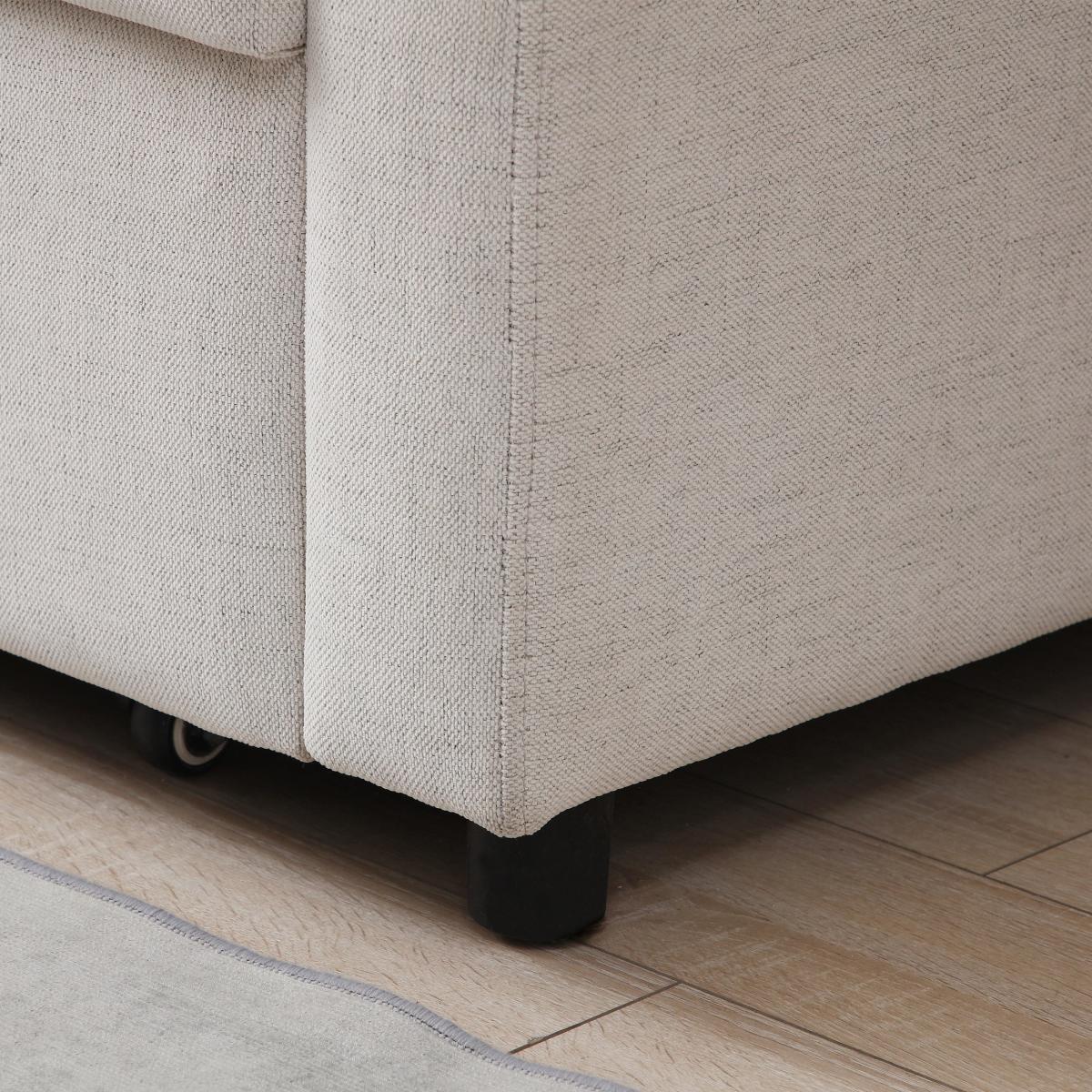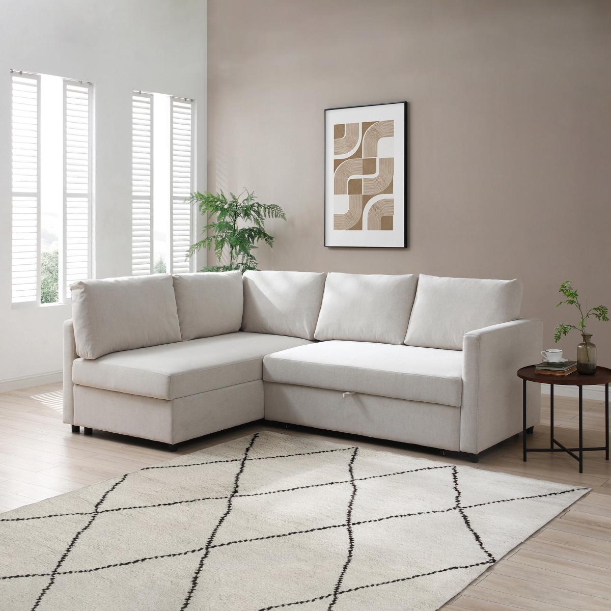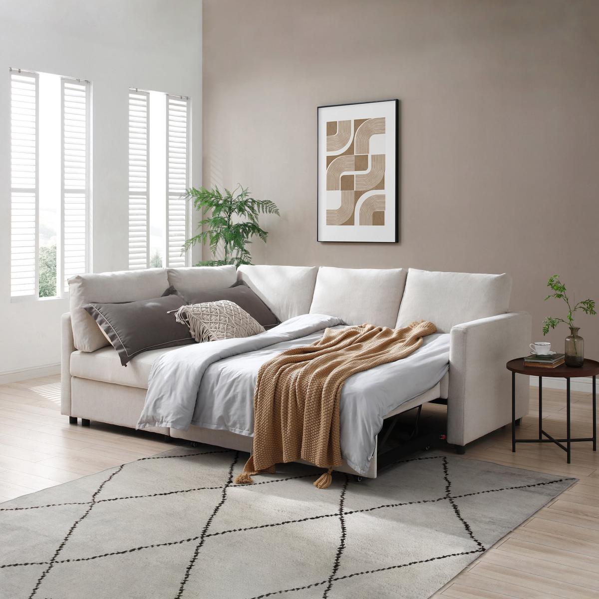 I really like this corner sofa bed for its versatility and neutral palette, making it easy to style in a range of interiors. The natural tone provides warmth and blends seamlessly with both modern and Scandinavian-inspired spaces. It works well in open-plan living rooms or guest areas, offering practical comfort during the day and a cosy sleeping spot at night. To style it effectively, consider layering with textured cushions and throws in subtle colours or muted patterns for added visual interest. Pairing it with a simple rug, like the one in the picture, helps anchor the space, while sleek side tables provide functional surface area without cluttering. Its adaptable form makes it an excellent choice for those looking to maximise space without compromising on style.