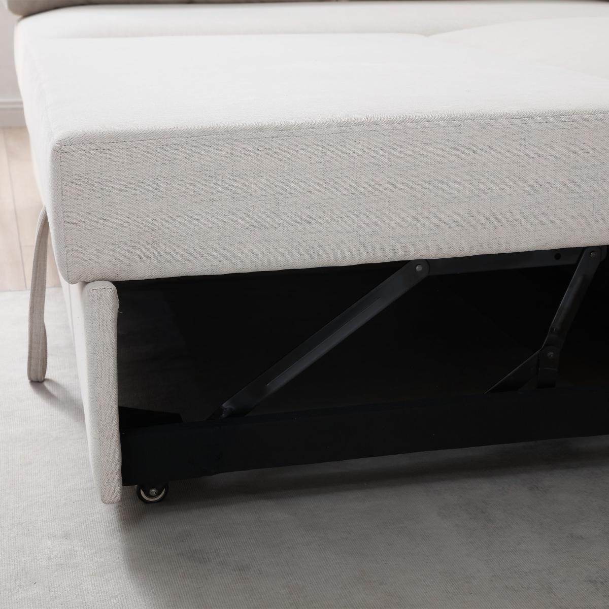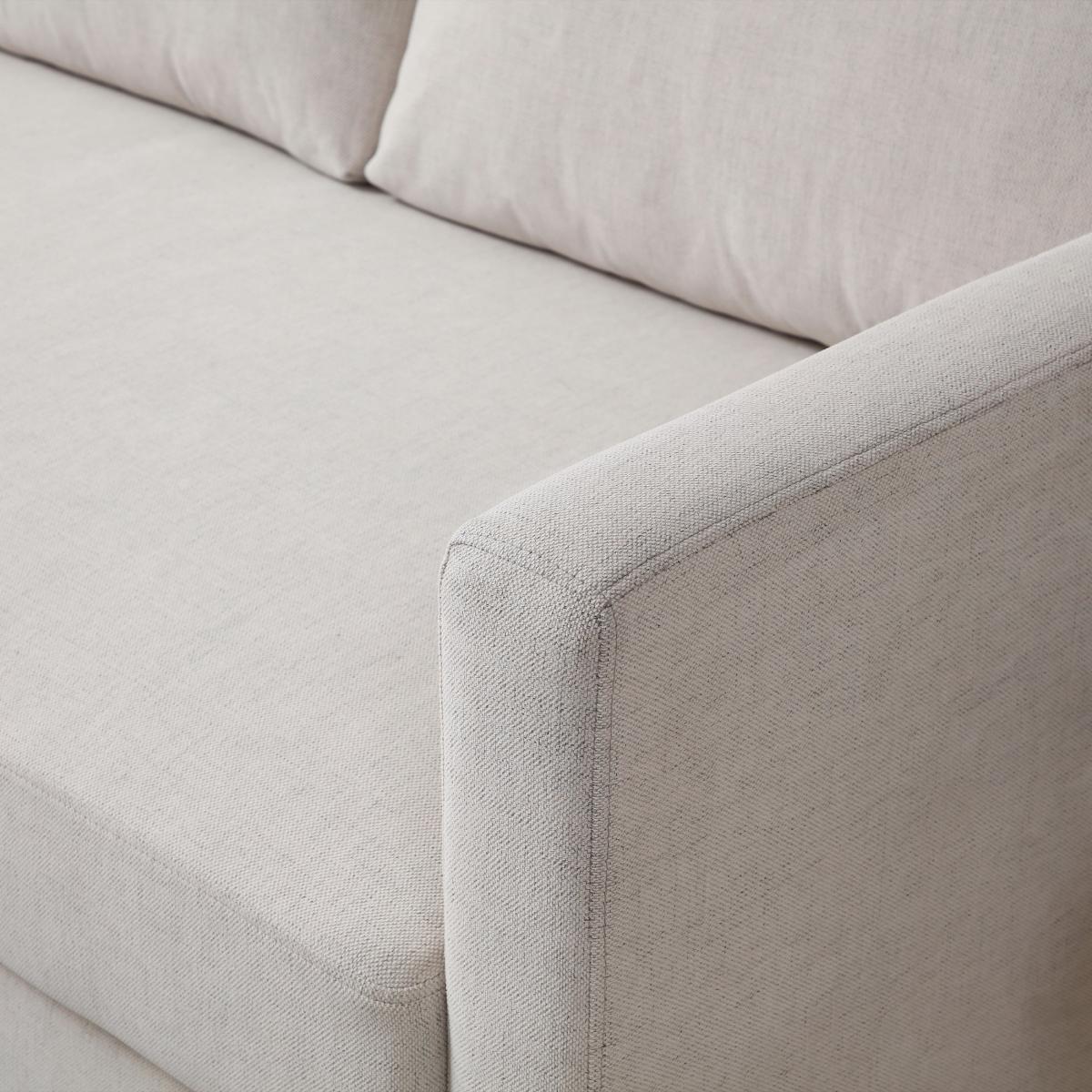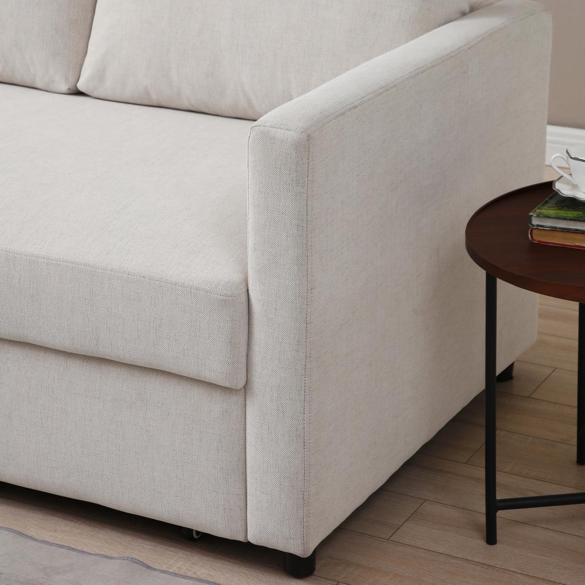 I really like this corner sofa bed for its versatility and neutral palette, making it easy to style in a range of interiors. The natural tone provides warmth and blends seamlessly with both modern and Scandinavian-inspired spaces. It works well in open-plan living rooms or guest areas, offering practical comfort during the day and a cosy sleeping spot at night. To style it effectively, consider layering with textured cushions and throws in subtle colours or muted patterns for added visual interest. Pairing it with a simple rug, like the one in the picture, helps anchor the space, while sleek side tables provide functional surface area without cluttering. Its adaptable form makes it an excellent choice for those looking to maximise space without compromising on style.