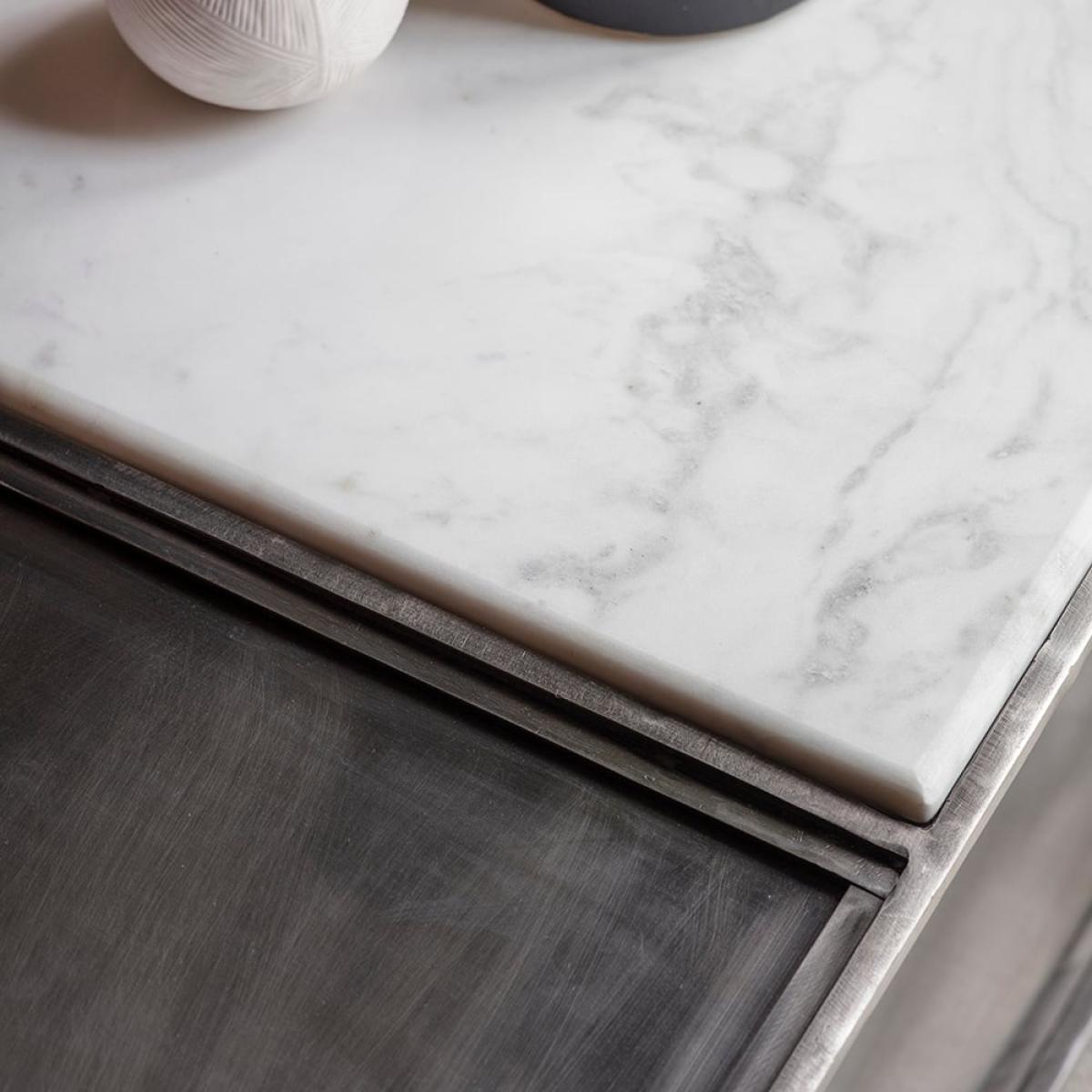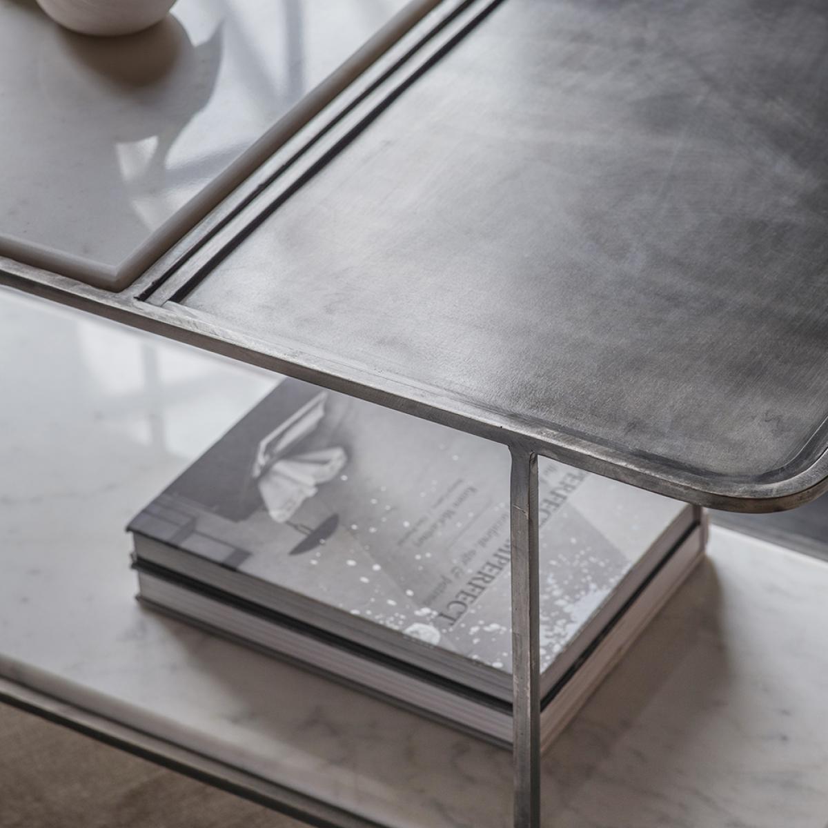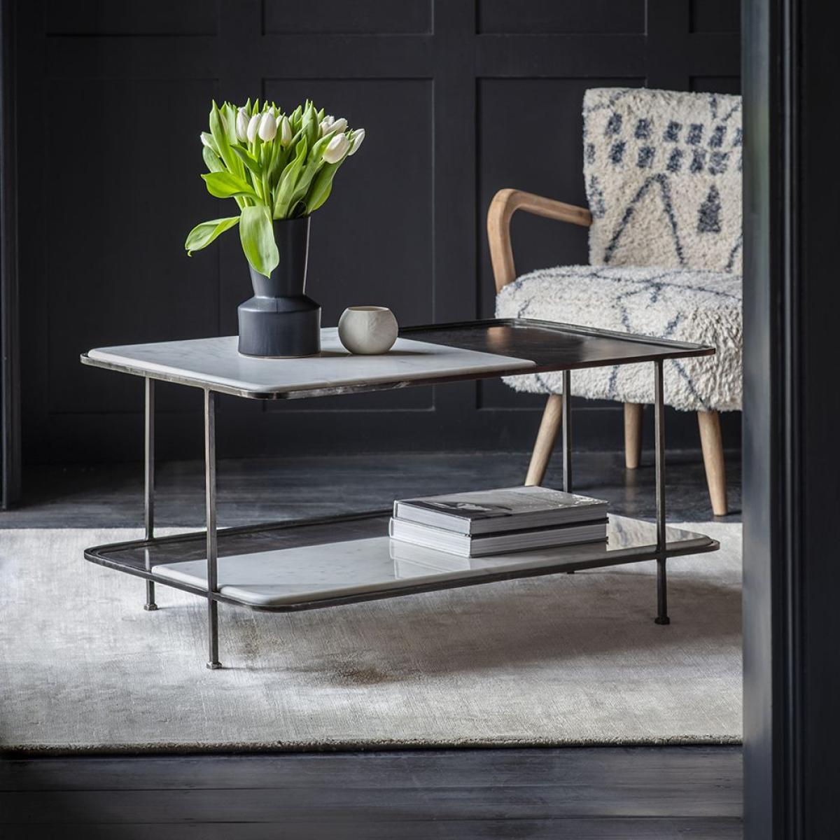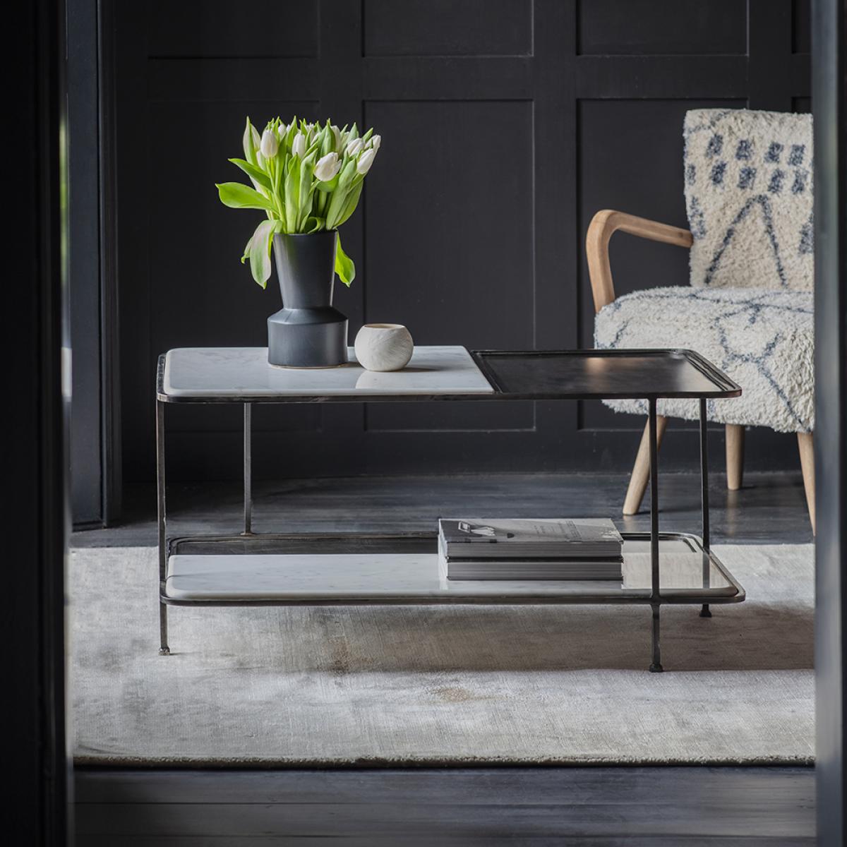 An industrial-style coffee table perfect for perching drinks and snacks on in a living area or open-plan space, our Miller Marble and Metal Coffee Table is crafted from a combination of cool white marble and metal with a gun metal polished finish. This two tier coffee table has a table top plus an additional shelf below for maximum storage. Offering a softer take on the industrial look, the table corners have a soft radius, which give it a sleek silhouette, and the gun metal has a soft matt finish that lets it easily sit in glamorous or laid back room schemes. Robust and durable, this marble and metal coffee table is built to last and is an ideal occasional table for any interior.