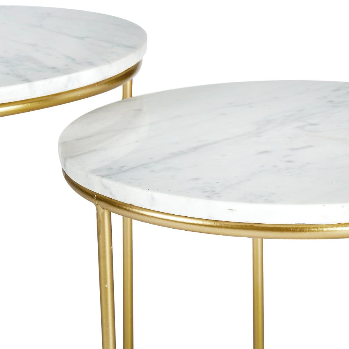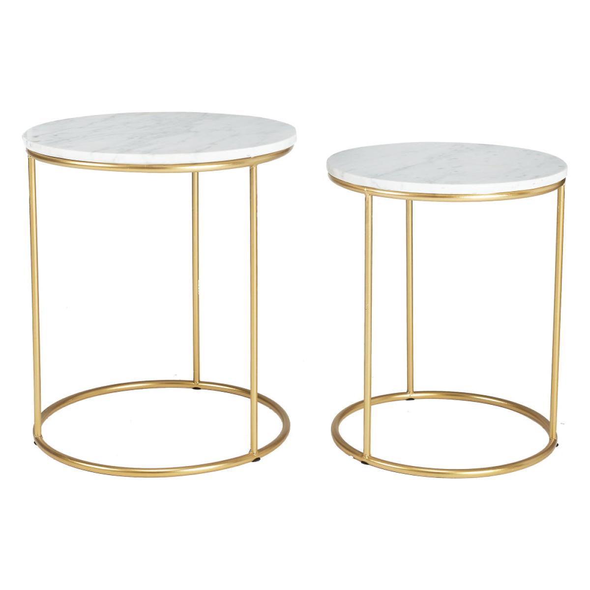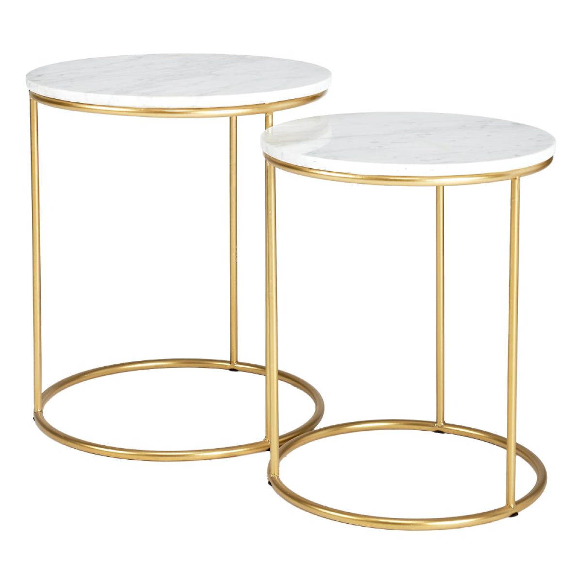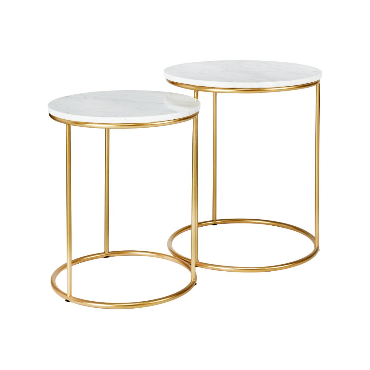 The are crafted with elegant champagne gold metal legs, which complement the striking white marble top perfectly. The mix of materials, colours and simple style of these tables make the perfect addition to your living space. They are both beautiful and practical. Use as separate tables or sit together for extra, multi levelled surface space.