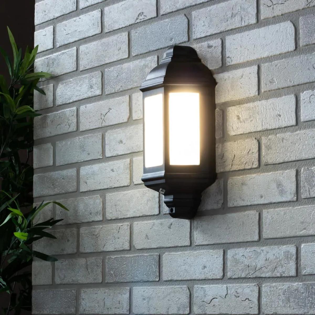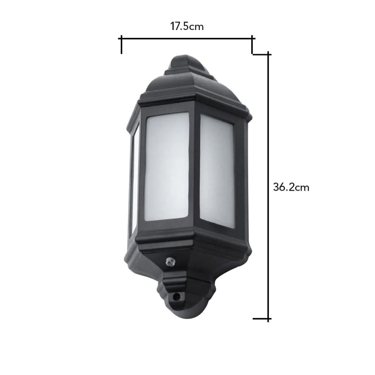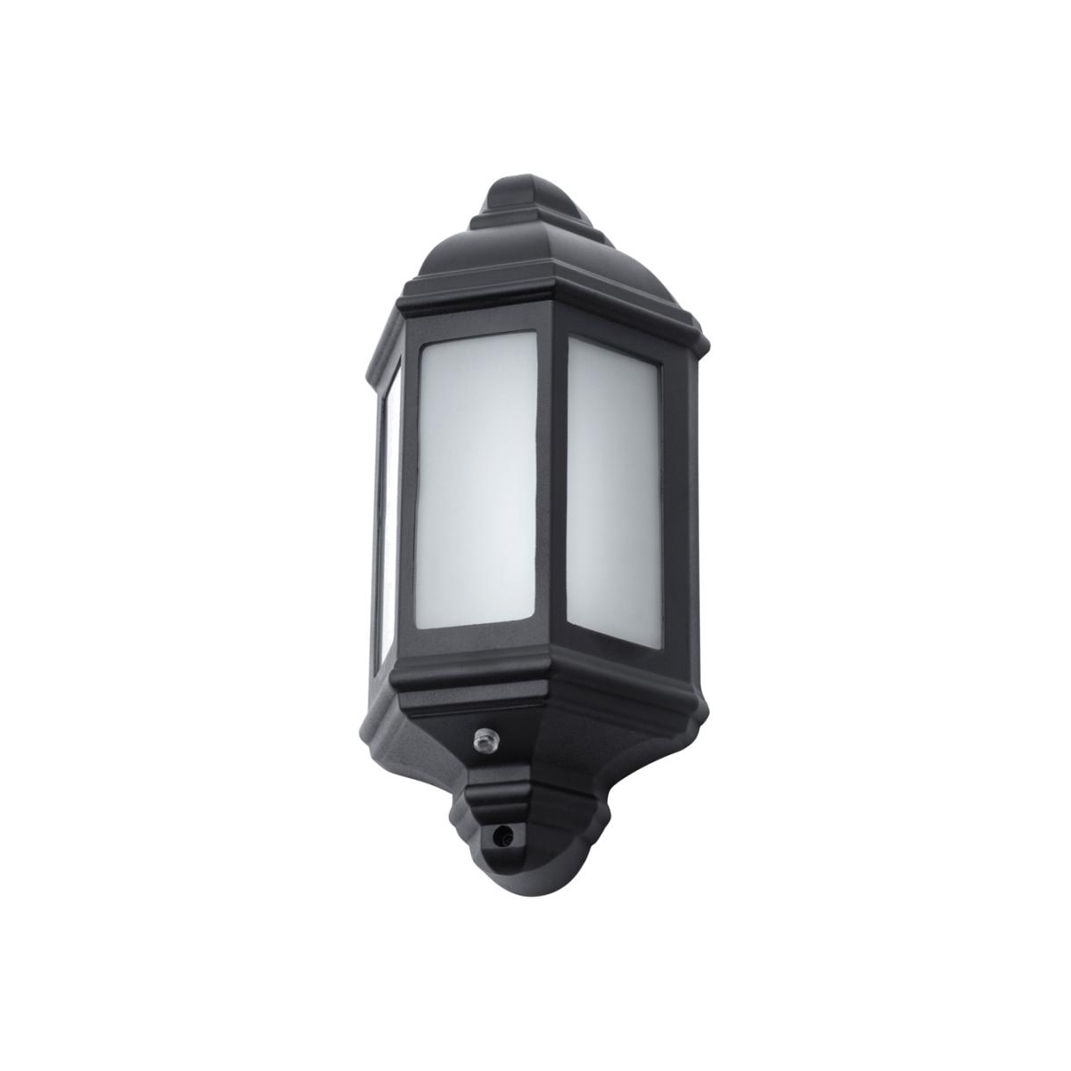 Make an innovative lighting addition to your home with the Milne Outdoor LED Half Wall Lantern. This wall light features photocell technology meaning that it can detect when there are lower natural light levels outside and brighten up accordingly. It also has a modern black finish, a traditional lantern design and 3 beautiful frosted glass panes which diffuse a gorgeous glow onto the exterior of your home.