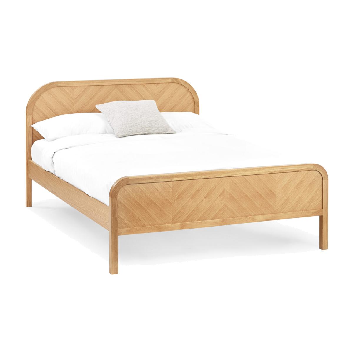 Bring a touch of character to your bedroom with this 150cm oak chevron bed. The standout headboard and footboard showcase a chevron design that adds texture and interest, while the gently rounded corners give it a softer, more welcoming feel. Made from solid oak, the frame highlights the wood's natural grain, bringing warmth and long-lasting quality. The legs provide sturdy support and a clean, classic finish, while the slatted base ensures your mattress is well supported. Full assembly required. Mattress sold separately.