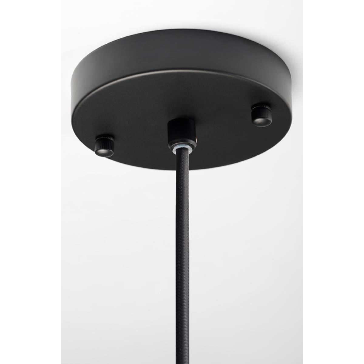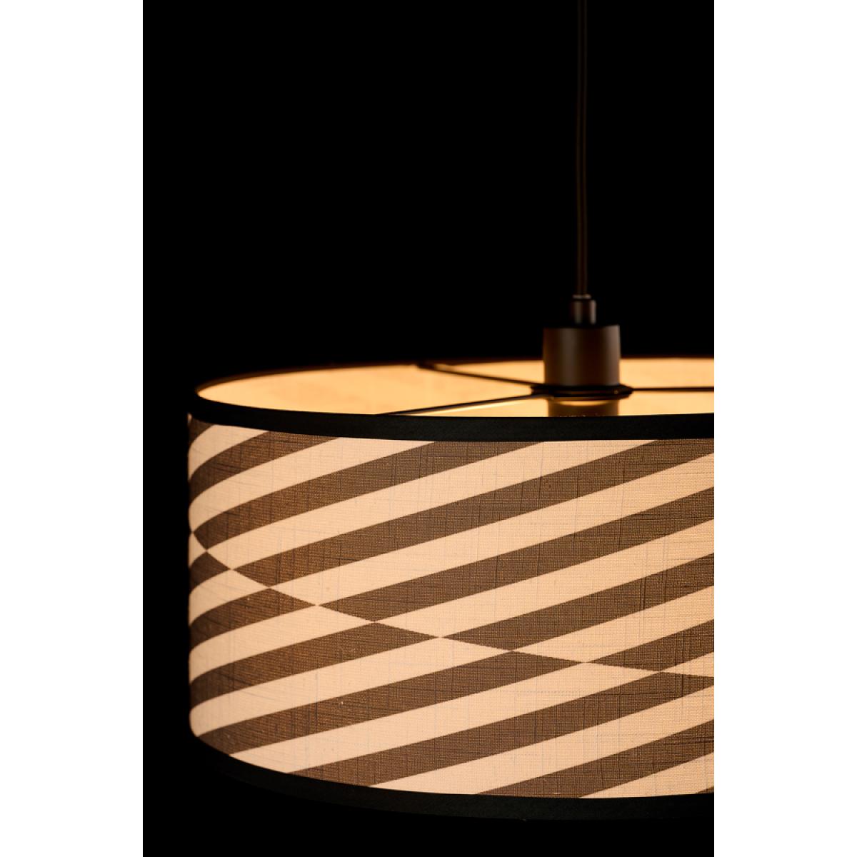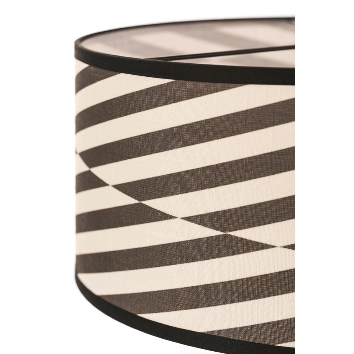 Contemporary light fitting featuring a drum shade with a bold printed stripe design and neat black edging tape. Black woven cable. Matt black metal ceiling rose and bulb holder. Supplied complete with E27 40W globe bulb. Height adjustable prior to installation.
