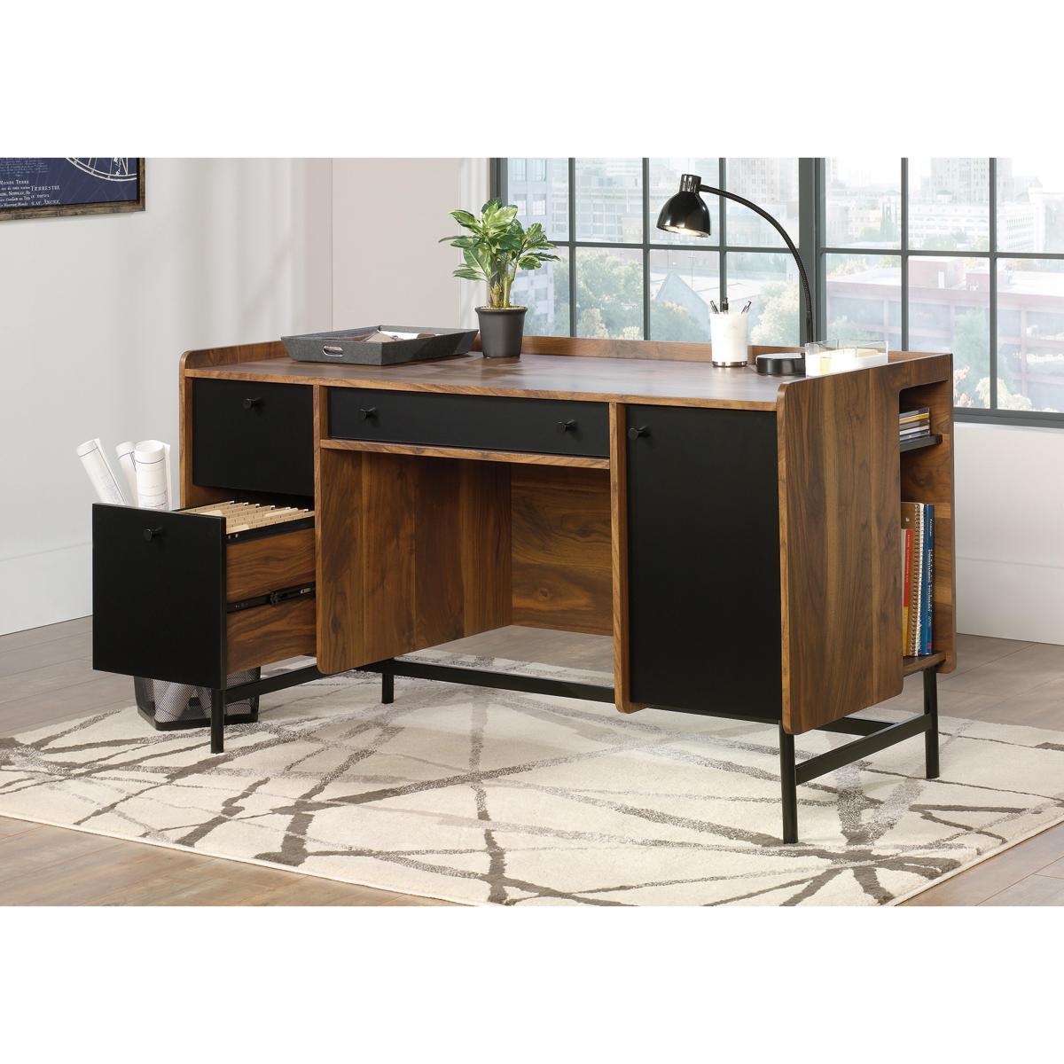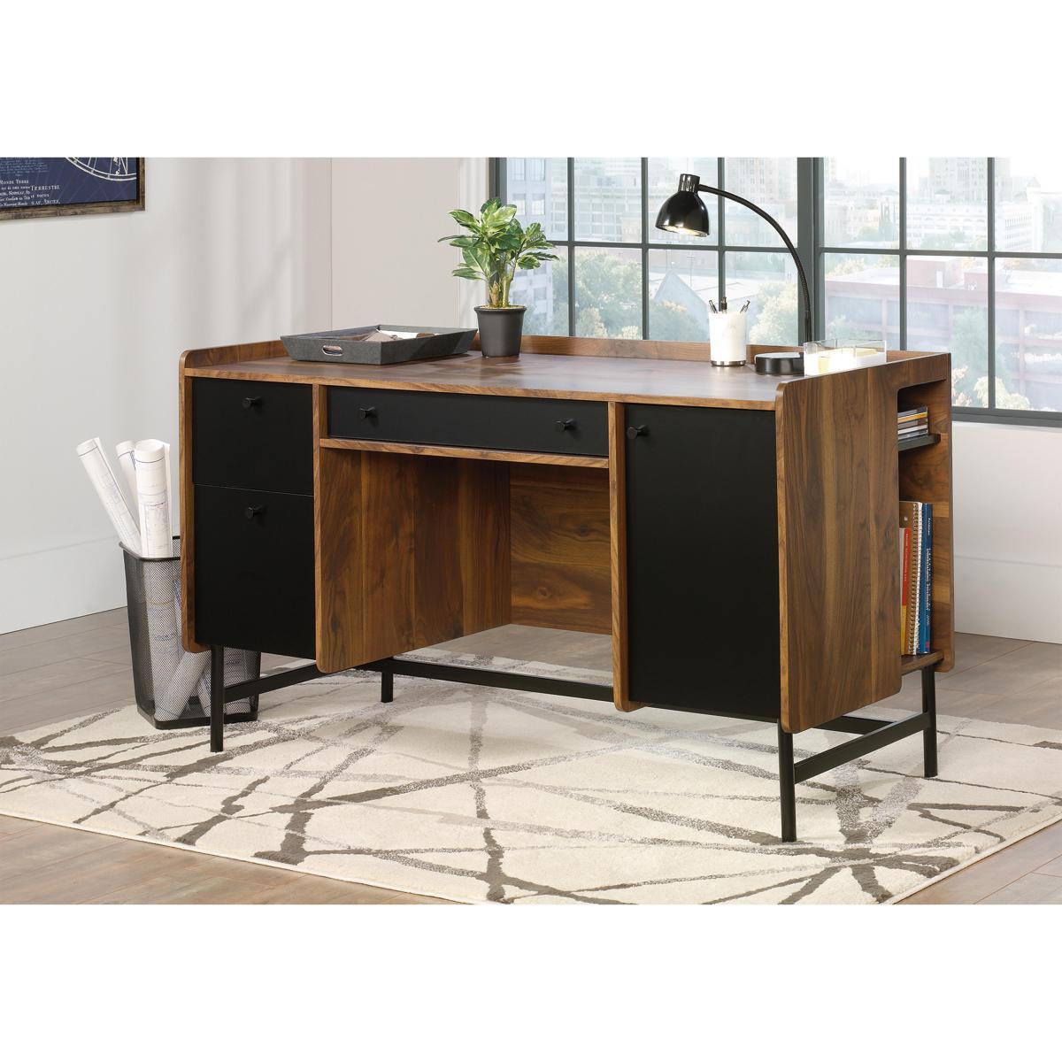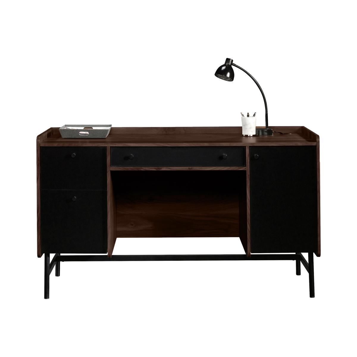 A winning combination of mid-century sophistication and space-saving storage, the Milo range is for people who like to organise and work in style. Instantly elevate your office space with these beautiful designs that exude elegance and brim with spacious storage. Enjoy the ease of roomy storage compartments, cable management ports, A4 hanging file drawers and adjustable shelving. Each design has a beautiful 360-degree grand walnut finish so you can place it freestanding or against a wall as you prefer and is elegantly contrasted with modern black accent panels or powder-coated metal frames for a look of smart sophistication. With the Milo range it’s easy to create a beautiful workspace you love working in. Beautiful and sophisticated mid-century style. Grand walnut effect finish and powder-coated metal frame. Simple self-assembly. For an elegant and sophisticated office space, you can’t go wrong with the beautiful Milo Standard Desk. Its clean lines and classic mid-century style instantly revive spaces while its grand walnut effect finish and power-coated frame and panels bring a smart, modern feel to its stylish design. This lovely desk has a 360 degree all round finish so looks equally stunning freestanding or placed against a wall. With plenty of work surface and storage space, this desk is a dream for those who like to be organised with a place for everything. There’s a spacious filing drawer for A4 hanging files, a central stationery drawer, an adjustable shelf inside the cupboard and a deep storage drawer for bigger items. Plus, say goodbye to tangled cables thanks to the cable port. Simple self-assembly is required. It can be set up in just 1 hour 30 minutes by one person. The Milo Standard Desk is part of the beautifully designed and sophisticated mid-century Milo range. Pair with the Milo Storage Stand for extra storage or organise your books neatly in the Milo Narrow Bookcase. This product requires self assembly. Please remember it is important to follow the assembly instructions precisely. Lines are open Monday to Friday, 9am to 5pm. WARNING!. Furniture can tip over unexpectedly and cause injury. This item shall be fixed to a wall using the anti-tip kit provided with the furniture. Be sure to use the correct wall fixings suitable for the walls in your home.