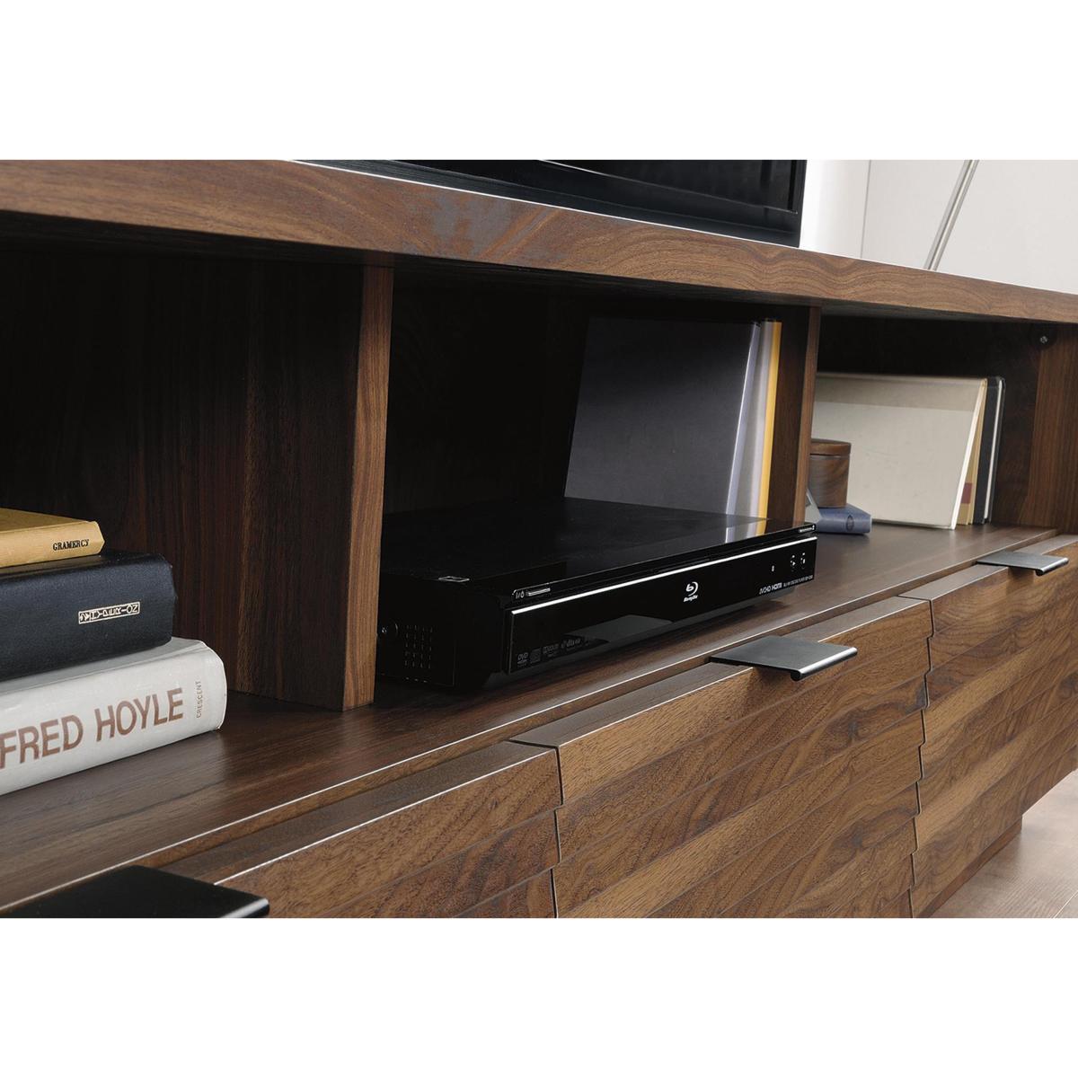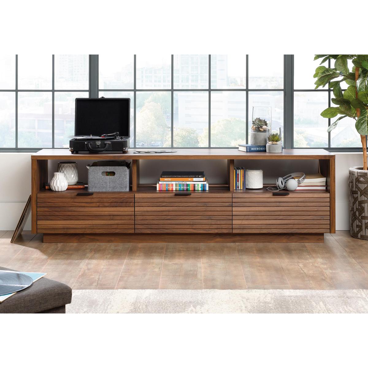 A winning combination of mid-century sophistication and space-saving storage, the Milo range is for people who like to organise and work in style. Instantly elevate your office space with these beautiful designs that exude elegance and brim with spacious storage. Enjoy the ease of roomy storage compartments, cable management ports, A4 hanging file drawers and adjustable shelving. Each design has a beautiful 360-degree grand walnut finish so you can place it freestanding or against a wall as you prefer and is elegantly contrasted with modern black accent panels or powder-coated metal frames for a look of smart sophistication. With the Milo range it’s easy to create a beautiful workspace you love working in. A striking piece of furniture in any setting, our Milo TV cabinet channels mid-century style with a hefty helping of modern functionality. Gorgeous walnut-effect slatted finish. Why you'll love it Stunning TV cabinet is designed for functionality as well as style. Classic mid-century look with a beautiful walnut-effect finish. Versatile open and closed storage. 3 storage cubbies. 3 smooth-glide drawers for media equipment. Made in the US. This TV cabinet is part of the Milo range. What you need to know Can accommodate TVs of up to 70 in. Item code: M-LOTVST--001