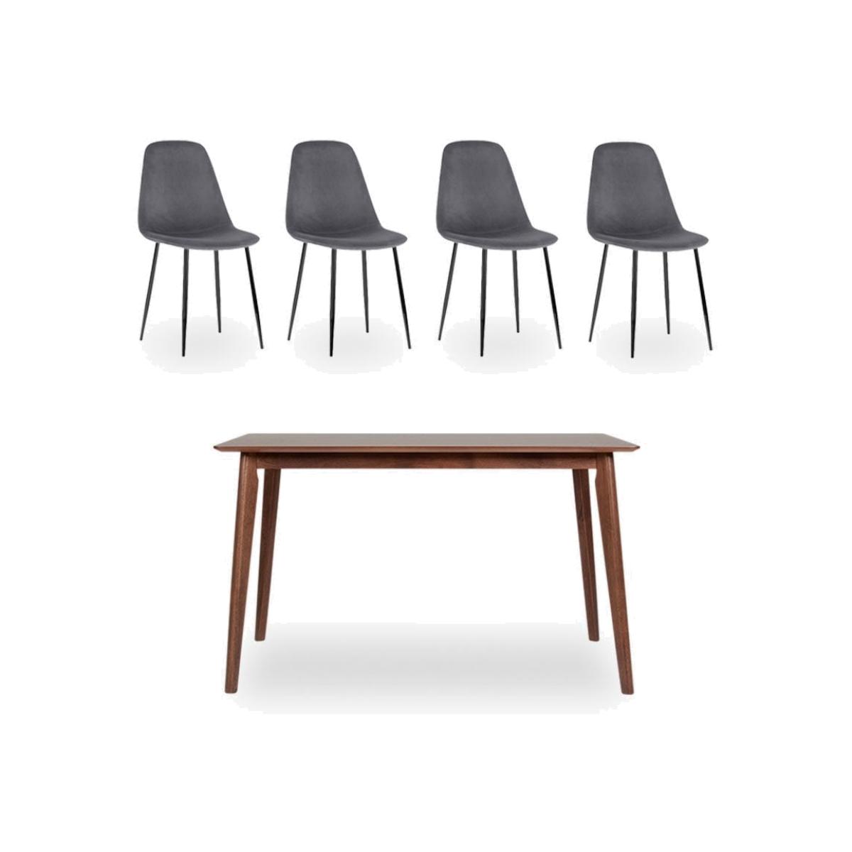 With the effortless styles of the Milton table and Rayner chairs, it only made sense to combine them for a contemporary and convenient set for your dining room. Featuring 1 Milton dining table and 4 Rayner chairs upholstered in soft grey velvet, at Cult, we have designed this especially to suit your modern home. The Rayner dining chairs are finished in black powder-coated legs and fit perfectly around the Milton 4-seater dining table. The Milton table has a rich subtle walnut-stained wood finish. Combined, this ideal pairing has hints of simplistic Nordic design.