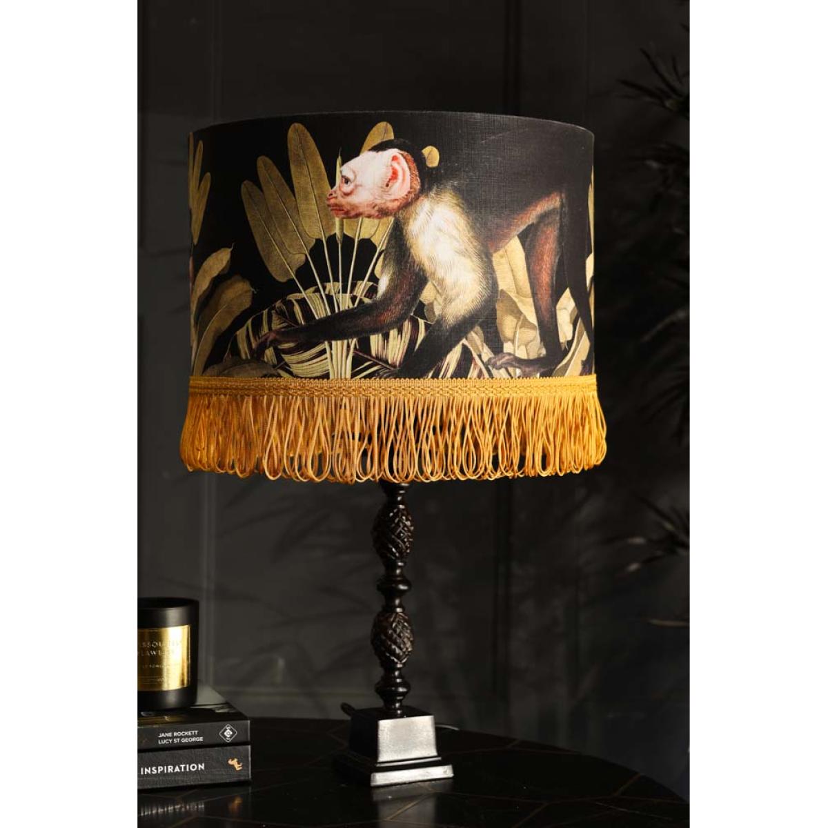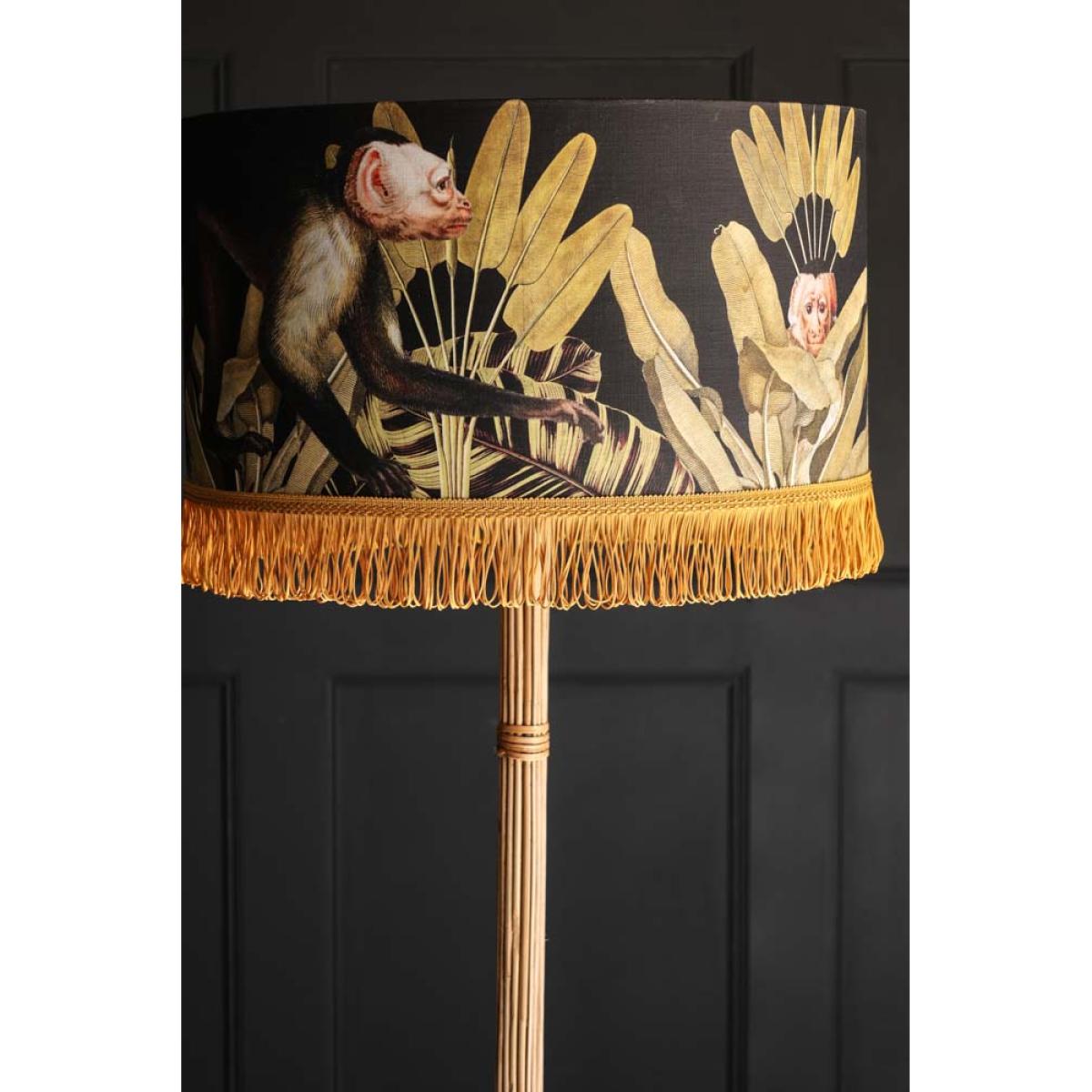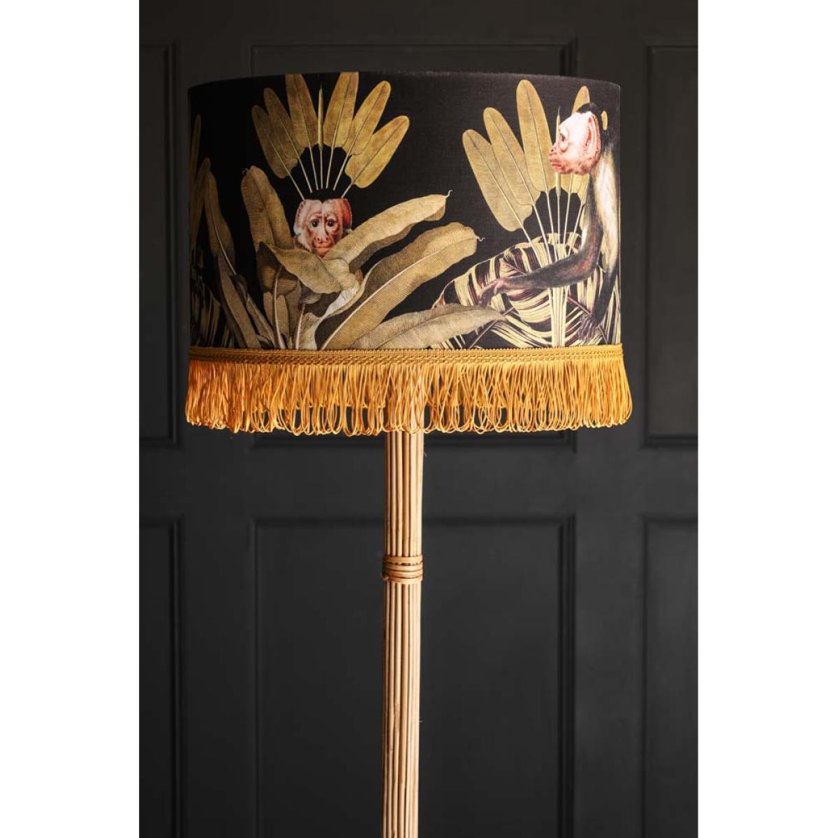 About The Mind The Gap Monkey Lamp ShadeAvailable in small, medium and large, the Mind The Gap Monkey Lamp Shade is a premium quality shade that’ll inject a tropical atmosphere into your interior scheme. Showcasing a lush design of an array of gold banana leaves and monkeys on a black background, this linen shade features a beautiful gold lining trim and assorted golden looped fringes. Why We Think You’ll Love The Tropical Lamp ShadeIf you like your interior to burst with quirky character then this unique lamp shade is the one for you. Showcasing a luxurious colour palette with luscious tropical print and elaborate fringe, this gold lamp shade dares to be different and will make a delightful impact in a living room scheme. How To Style The Linen Drum Lamp ShadePair this linen lamp shade with a beautiful dark and daring turned wood lamp base to accentuate the gold fringe and make the shade pop! Alternatively, why not up-cycle an existing lamp base by styling it with this quirky lamp shade. It’s a wonderful way to make use of what you already own while refreshing your decor with show-stopping style. Display this decorative lamp shade on a side table in a living room or next to a gorgeous armchair to liven up the space with a touch of quirky magic.