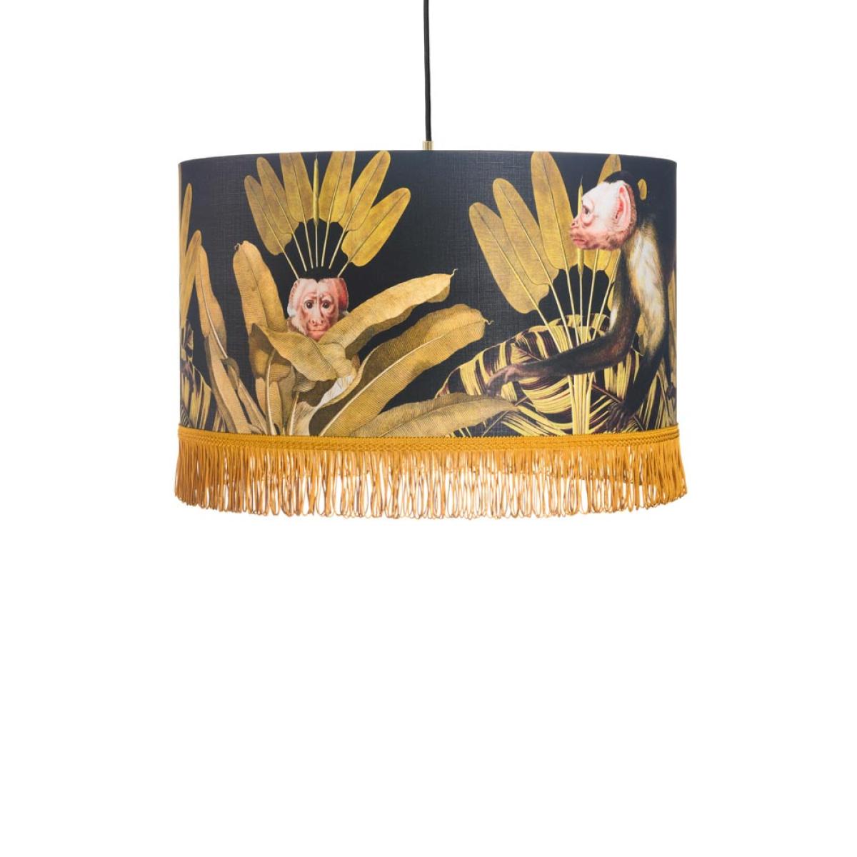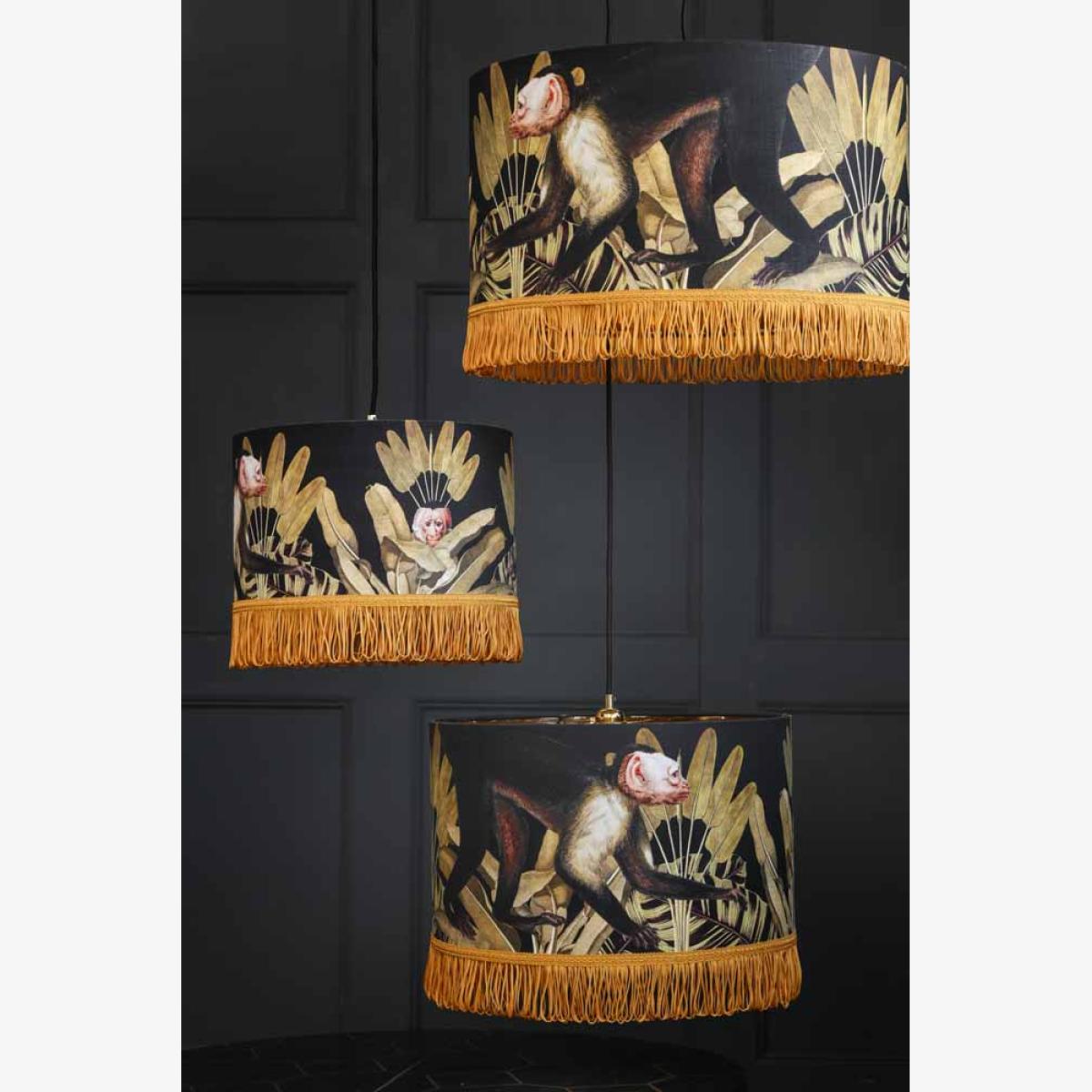 About The Mind The Gap Monkey Pendant Ceiling Light Available in small, medium and large, the Mind The Gap Monkey Pendant Ceiling Light will create a gorgeous tropical vibe in your home. Showcasing a warm colour palette, this linen ceiling light features a lush design of an array of gold banana leaves and monkeys on a striking black background. Elevating the luxuriousness of the piece, this statement ceiling light features gorgeous intricate gold lining and an elaborate golden looped fringe. Becoming a dramatic focal point in a living area, this gold pendant light offers a 2m black braided fabric cord and a metallic golden ceiling rose. Why We Think You’ll Love The Monkey Pendant Light At Rockett St George we love making bold statements with our interiors and this gold ceiling light fits the bill completely. Not only does it offer a strikingly quirky tropical design, but the gold looped fringe boasts of luxuriousness and glamour. And what’s more, the gold-lined interior will create the most gorgeous radiant glow throughout an interior. Where To Style The Monkey Ceiling Light Create a luscious, tropical living space by displaying this statement ceiling light as the focal point of your living room. Its boldly beautiful design will become a marvellous centrepiece in the space. To tie the room together, accessorise with gold accents using ornaments and tropical-inspired soft furnishings.