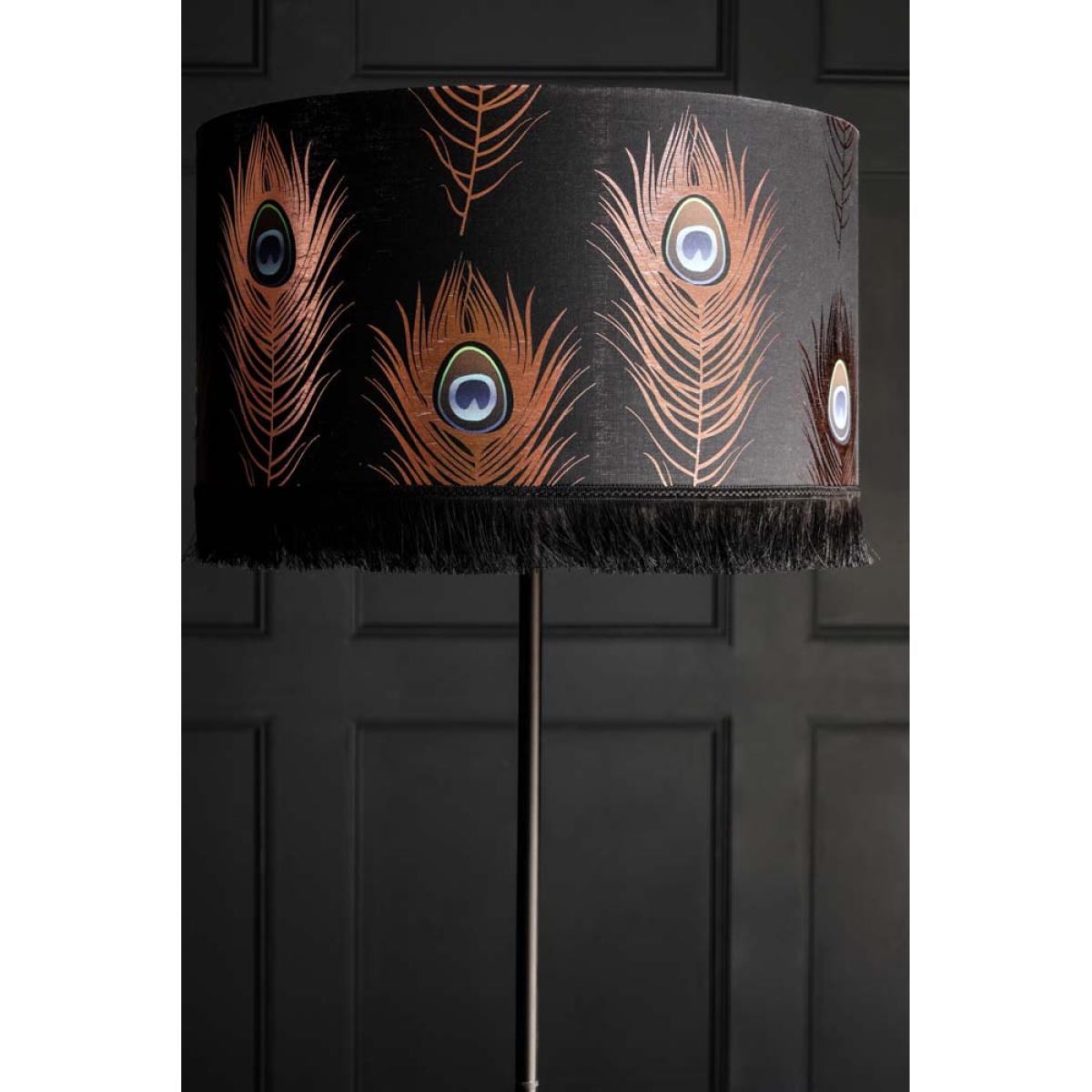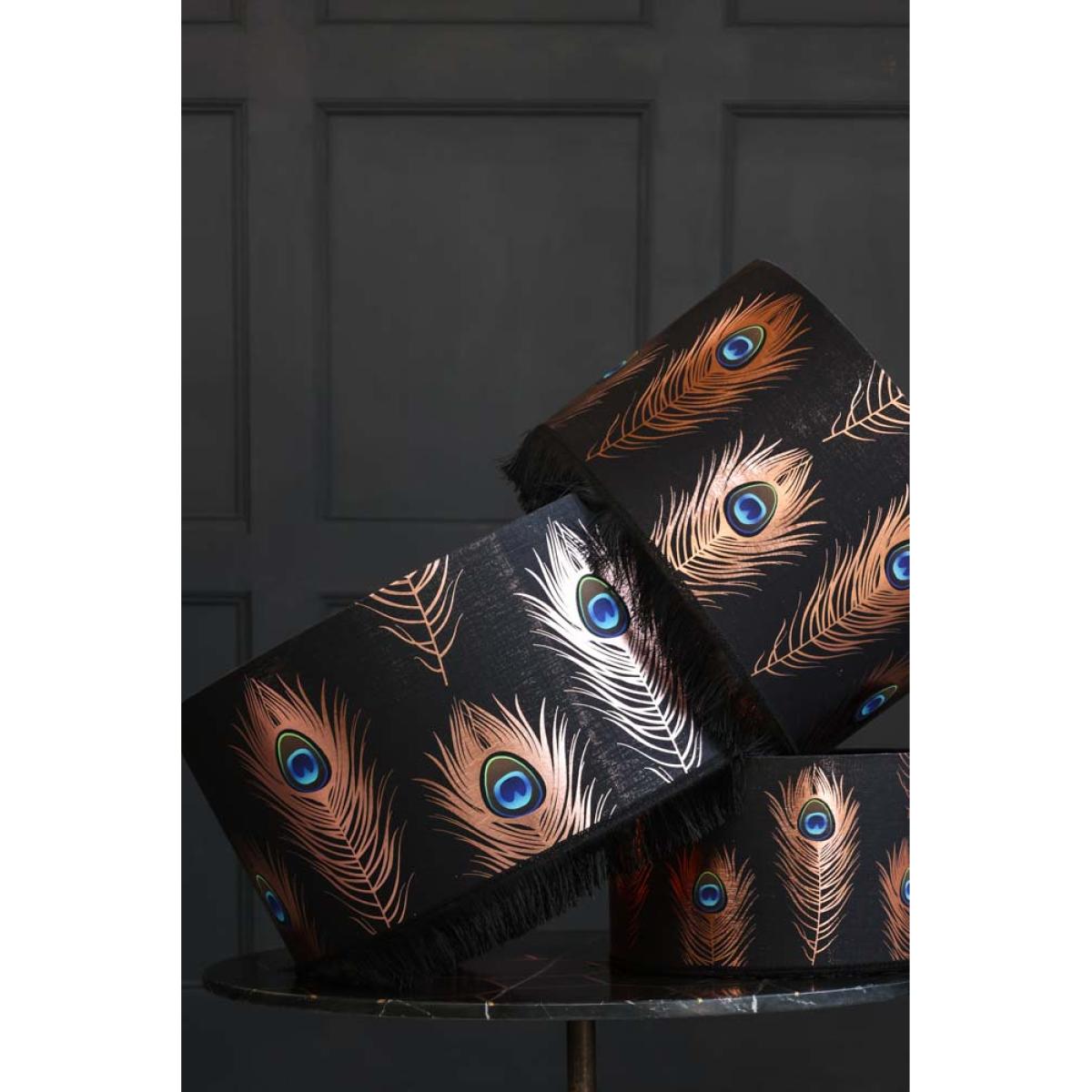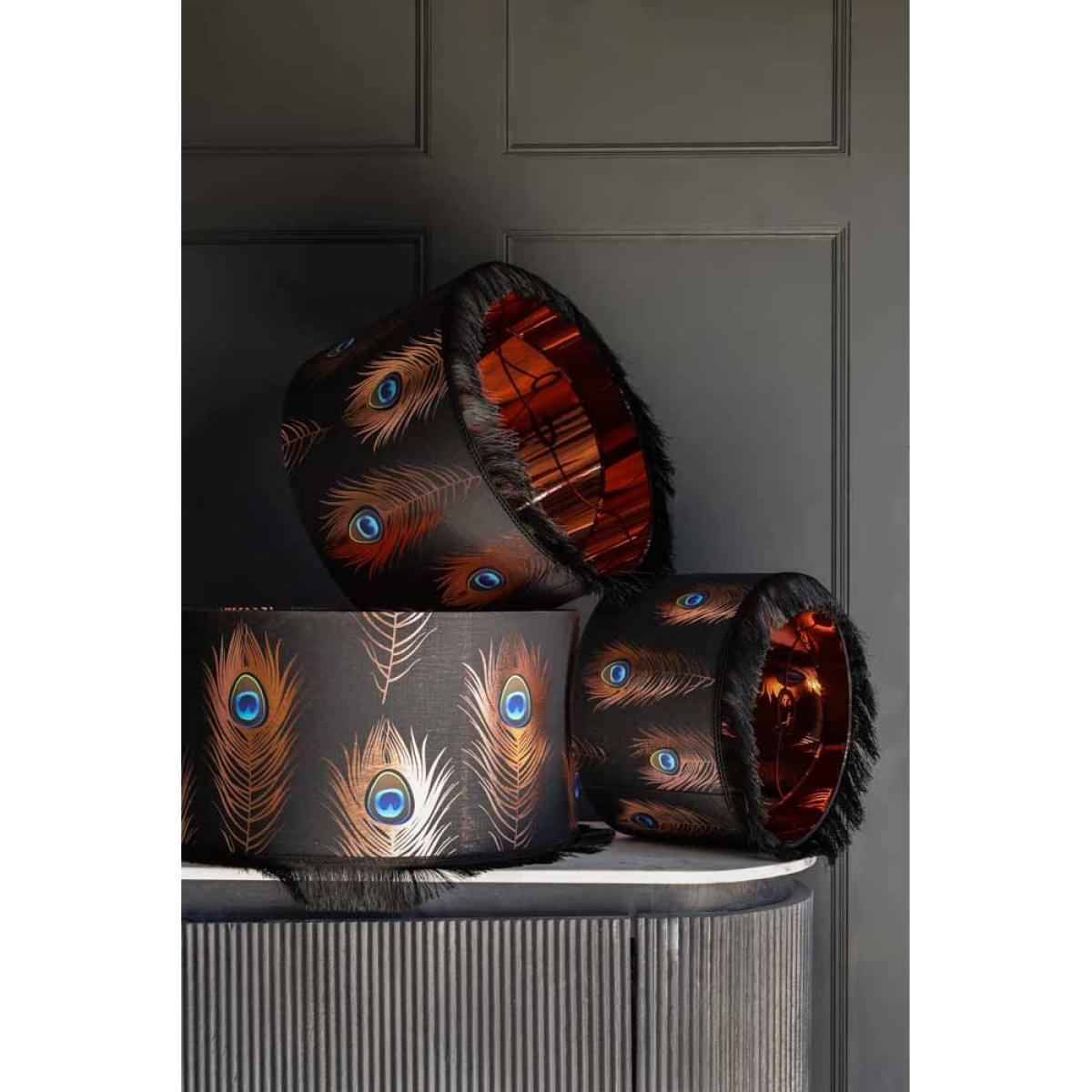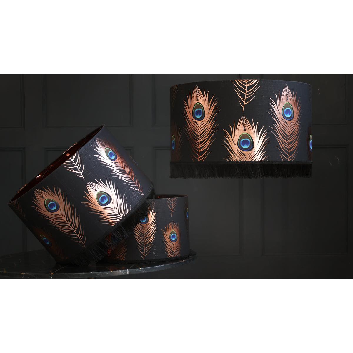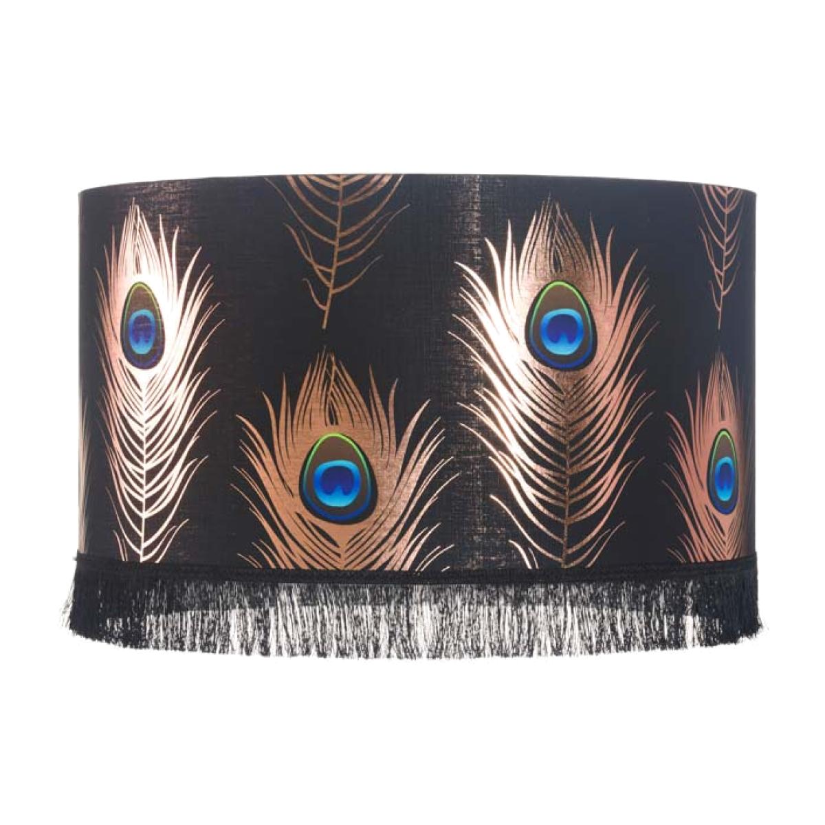About The Mind The Gap Peacock Feather Lamp ShadeAvailable in Small, Medium and Large sizes, the Mind The Gap Peacock Feather Lamp Shade is a delightfully elegant lamp shade. Showcasing a dazzling colour palette combining peacock blues and copper shades on a black linen background, this drum lamp shade features an utterly graceful print of beautiful plumes. This gorgeous linen lamp shade is finished with a long black fringe and offers a copper-lined interior which will emit the most radiant glow into the surrounding decor. Why We Think You’ll Love The Peacock Lamp ShadeAt Rockett St George, we love finding a delightfully unique lamp shade such as this one. It enables you to mix and match your style and display them on whatever quirky lamp bases you already own in your home. Combining a vivid colour palette with a delicate feather print, this unique lamp shade will become an opulent accent piece in a dark and daring interior scheme, so what’s not to love?!How To Style The Linen Drum Lamp ShadeThis decorative lamp shade will make a stunning statement styled on a side table, console table or sideboard. The serene design combined with the shaggy black trim exudes an appearance of tranquillity that would bode well in a living room or bedroom scheme. Save a pretty penny and upcycle and existing lamp base in your home by styling it with this unique lamp shade. It’s a creative way to make use of what you already own while refreshing your decor with unforgettable style.