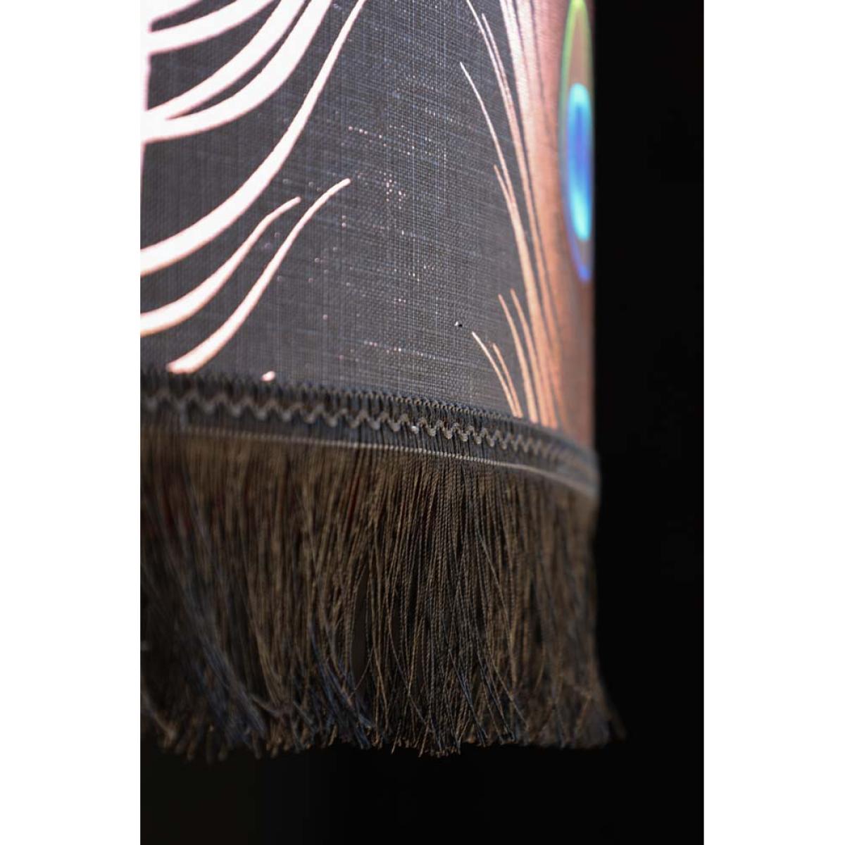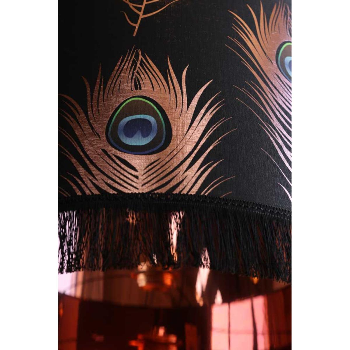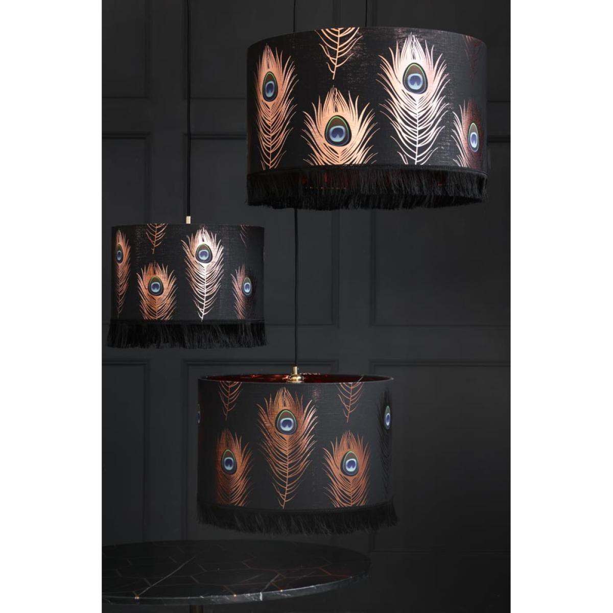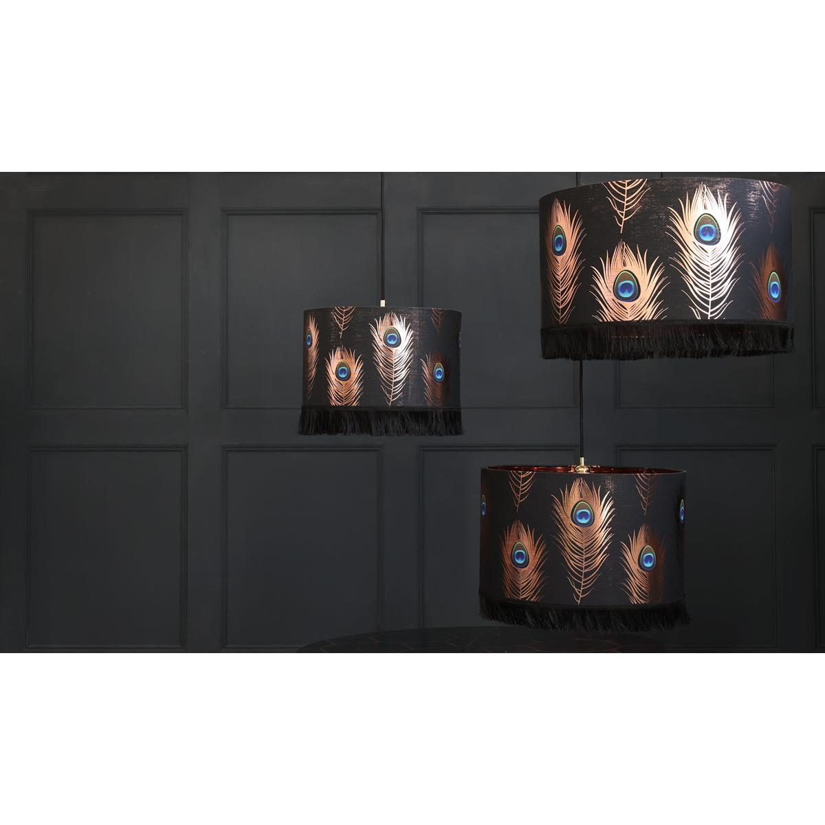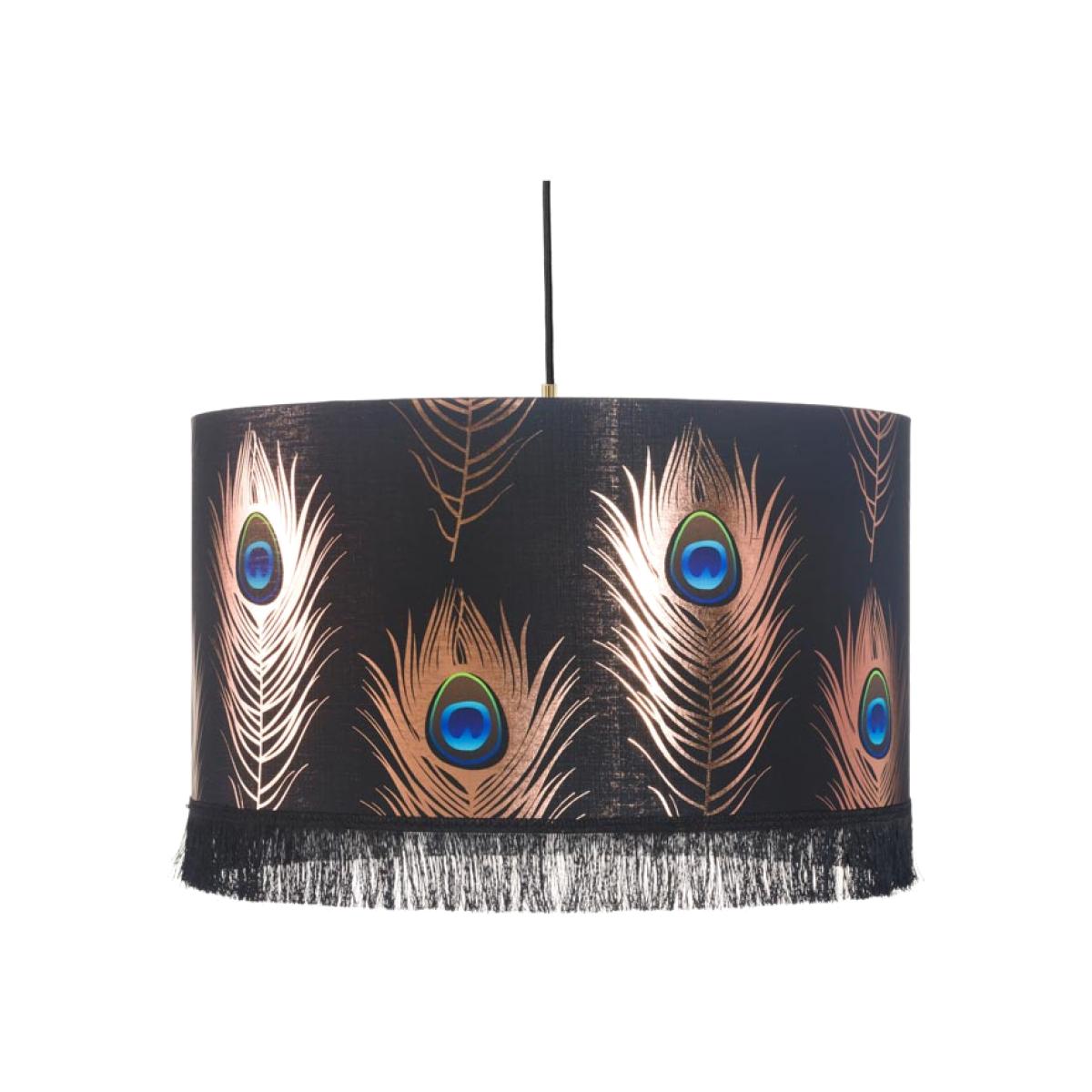 About The Mind The Gap Peacock Feather Pendant Ceiling LightAvailable in Small, Medium and Large sizes, the Mind The Gap Peacock Feather Pendant Ceiling Light will become an elegant focal point in a living room scheme. Showcasing a beautiful print of delicate peacock plumes in a dazzling colour palette of vibrant blues and striking copper shades printed on a black linen background. Finished with a braided trim and long black fringe, this drum pendant light is elevated by the copper-lined interior which will radiate the most glorious glow throughout your interior scheme. Strikingly luxurious, this statement pendant light features a 2m black braided cord a copper ceiling rose. Why We Think You’ll Love The Feather Pendant LightCombining a pop of colour with a graceful feather print, this drum ceiling light showcases a boldly beautiful style that’ll enhance your interior scheme with effortless elegance. What’s more, the striking copper lined interior will make for a glamorous aesthetic overhead in your interior scheme. This drum shade ceiling light exudes an utterly charming appearance, and we think it’s simply to die for!Where To Style The Feather Ceiling LightComing in three functional sizes, this quirky pendant light will look utterly magnificent in either a large or small room in your home. Create a quirky interior scheme by displaying this linen pendant light as the main light feature in a living room or bedroom scheme. Its divine beauty will become a striking centrepiece in your interior drawing the eye upwards.