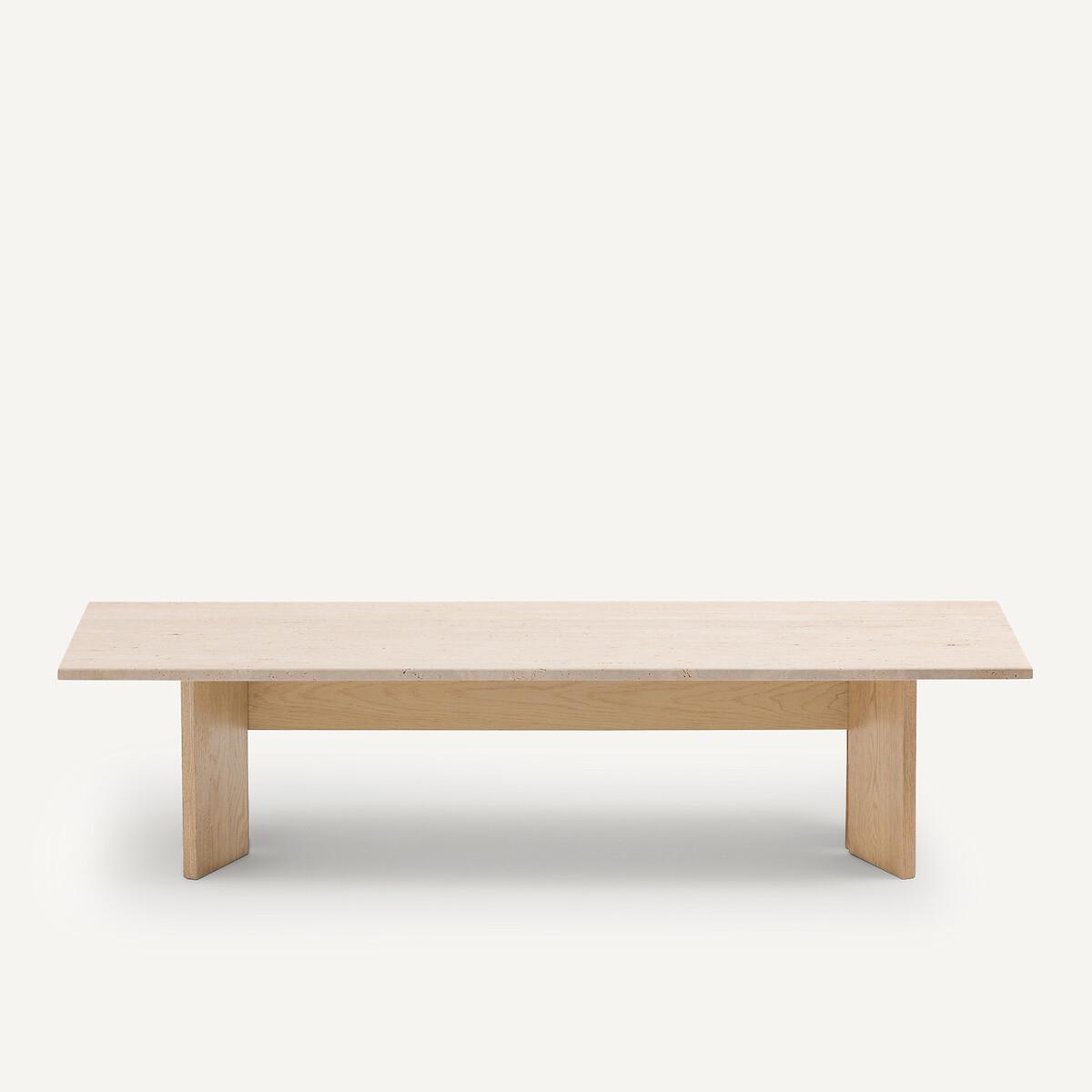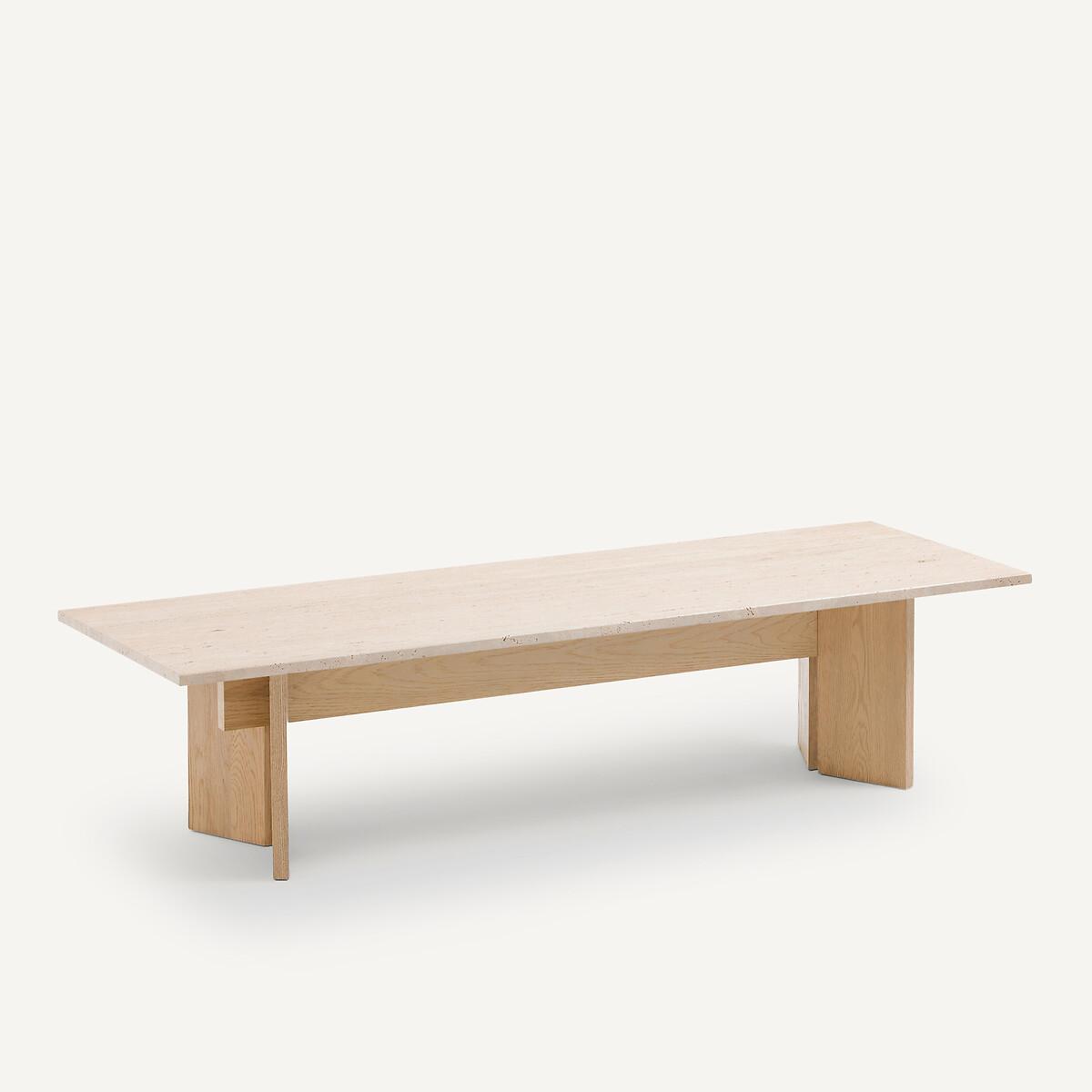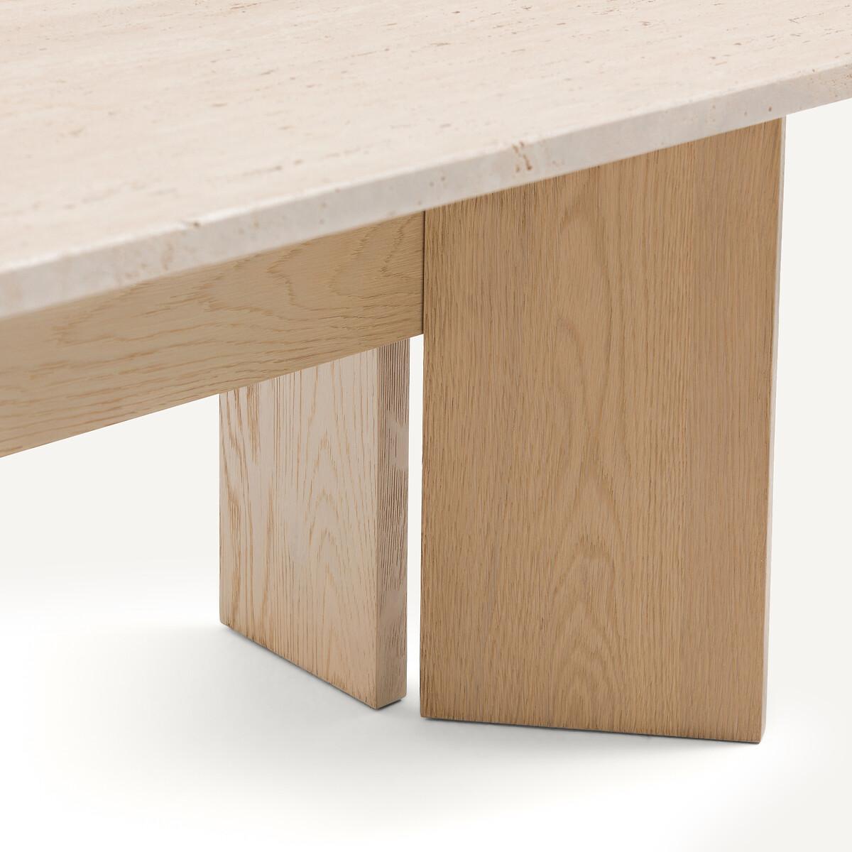 The aesthetics of a contemporary mineral top placed on an oak structure, in a compact format, makes Mindo a coffee table inspired by nature and architecture. The top is made of travertine from Italy, its edges are blunt. Slightly apart to let the light through, the solid white sandblasted oak leaf legs are connected by a spacer. Each piece is unique, a signature AMPM design. Product Details • Top in Romano travertine stone, from Italy, with pores filled with transparent resin. Rough edges and dull edges. Each piece is unique. • FSC®-certified white sanded solid oak base with spacer. Care Advice • Travertine is a porous and heat sensitive material. Care information: Immediately wipe up any spilled liquid with a white cloth dipped in lukewarm water and wrung out. Avoid placing hot objects on the surface. We recommend the use of coasters and placemats. Quality Info • Wood is a living material. The differences in shades, grains and knots reinforce its character and authenticity.. Over time it may crack slightly. It is a process caused by variations in temperature and humidity. Dimensions • Length: 150cm • Width: 50cm • Height: 37cm. Delivery: • Assembly required. Available for home delivery. Note! Please check that all access points are large enough to accommodate your delivery (doors, stairs, lifts). • WOOD FROM SUSTAINABLY MANAGED FORESTS. FSC® certified wood comes from forests that are environmentally, socially and economically well managed. Dimensions and weight of parcel • 3 parcels • L134 x D50 x H119cm, 20kg • L72 x D46 x H17cm, 5kg • L129 x D42 x H26cm, 15kg