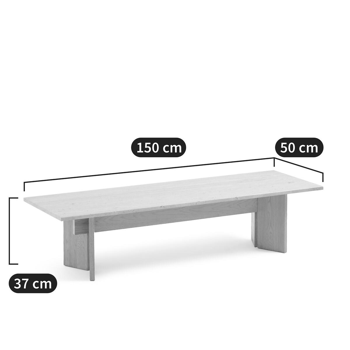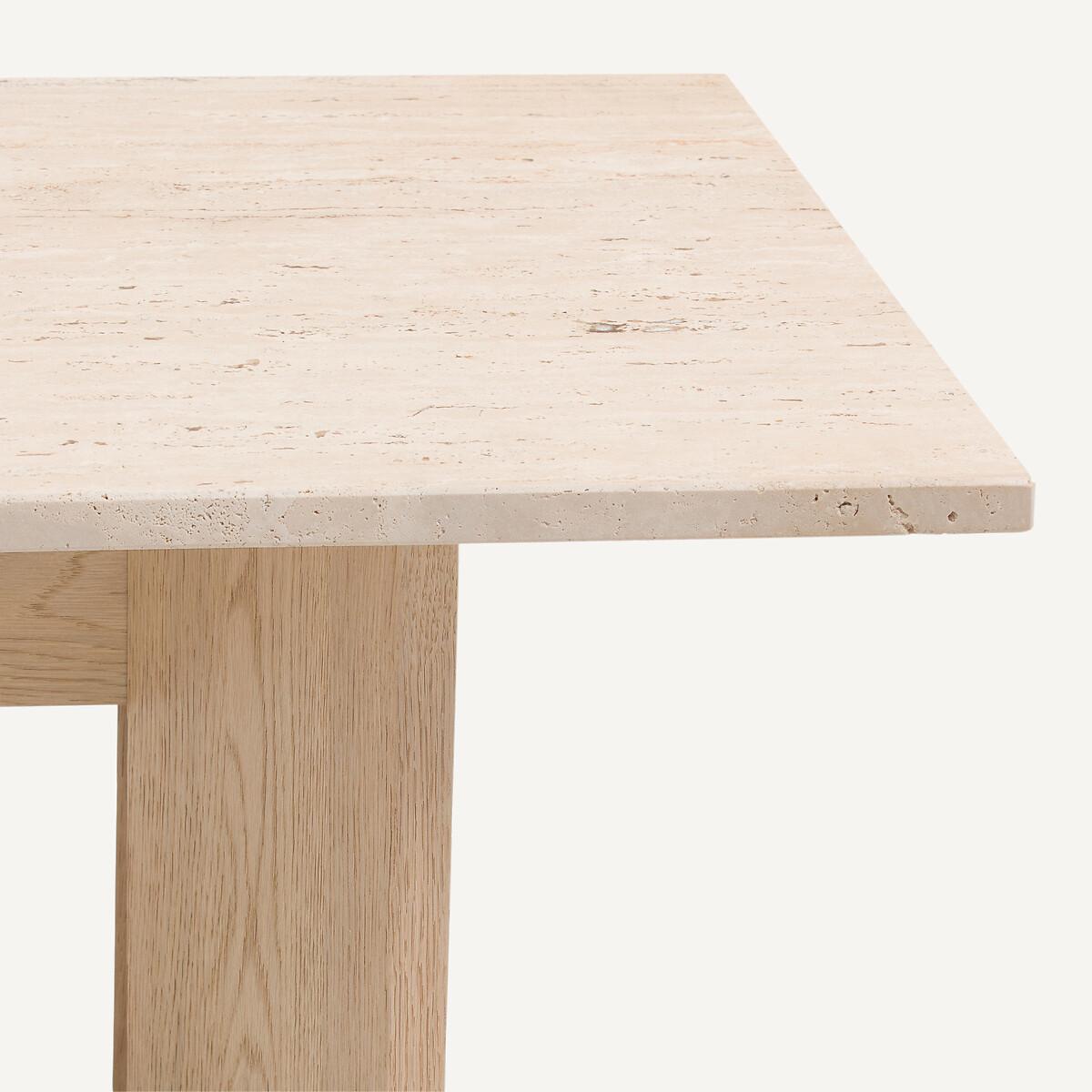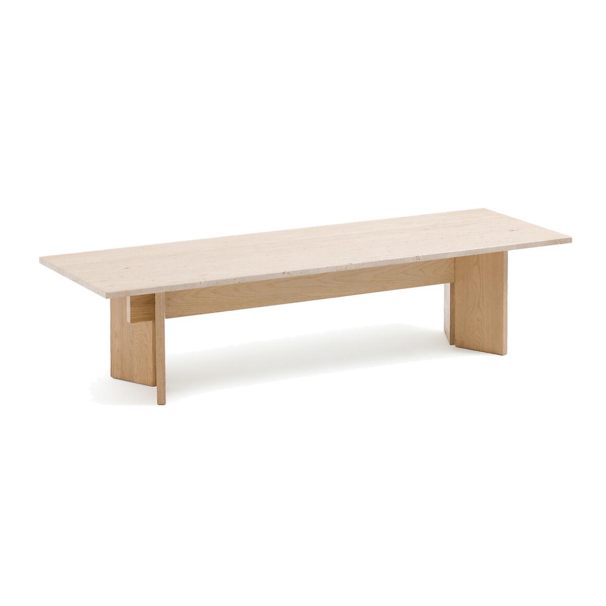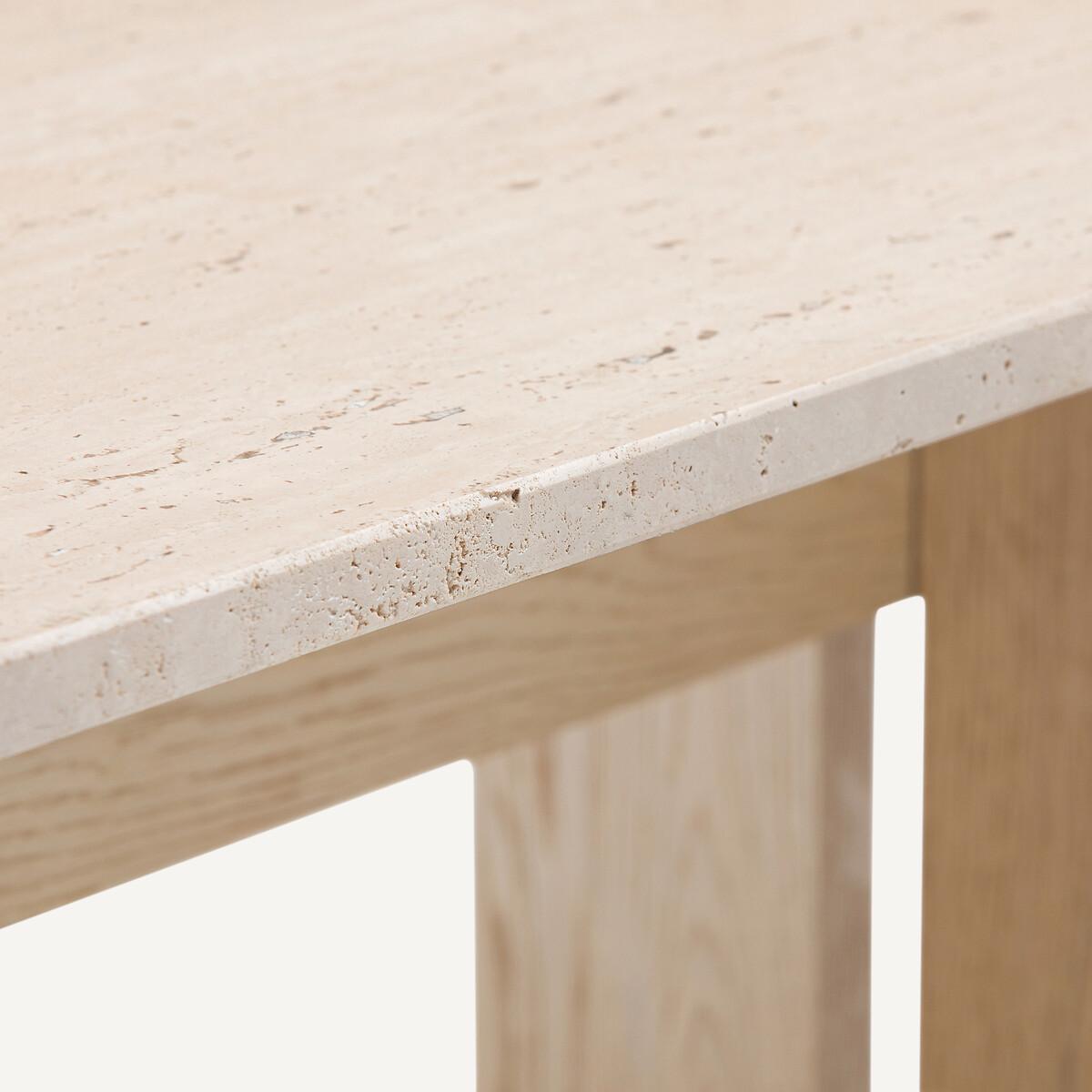 The aesthetics of a contemporary mineral top placed on an oak structure, in a compact format, makes Mindo a coffee table inspired by nature and architecture. The top is made of travertine from Italy, its edges are blunt. Slightly apart to let the light through, the solid white sandblasted oak leaf legs are connected by a spacer. Each piece is unique, a signature AMPM design. Product Details • Top in Romano travertine stone, from Italy, with pores filled with transparent resin. Rough edges and dull edges. Each piece is unique. • FSC®-certified white sanded solid oak base with spacer. Care Advice • Travertine is a porous and heat sensitive material. Care information: Immediately wipe up any spilled liquid with a white cloth dipped in lukewarm water and wrung out. Avoid placing hot objects on the surface. We recommend the use of coasters and placemats. Quality Info • Wood is a living material. The differences in shades, grains and knots reinforce its character and authenticity.. Over time it may crack slightly. It is a process caused by variations in temperature and humidity. Dimensions • Length: 150cm • Width: 50cm • Height: 37cm. Delivery: • Assembly required. Available for home delivery. Note! Please check that all access points are large enough to accommodate your delivery (doors, stairs, lifts). • WOOD FROM SUSTAINABLY MANAGED FORESTS. FSC® certified wood comes from forests that are environmentally, socially and economically well managed. Dimensions and weight of parcel • 3 parcels • L134 x D50 x H119cm, 20kg • L72 x D46 x H17cm, 5kg • L129 x D42 x H26cm, 15kg