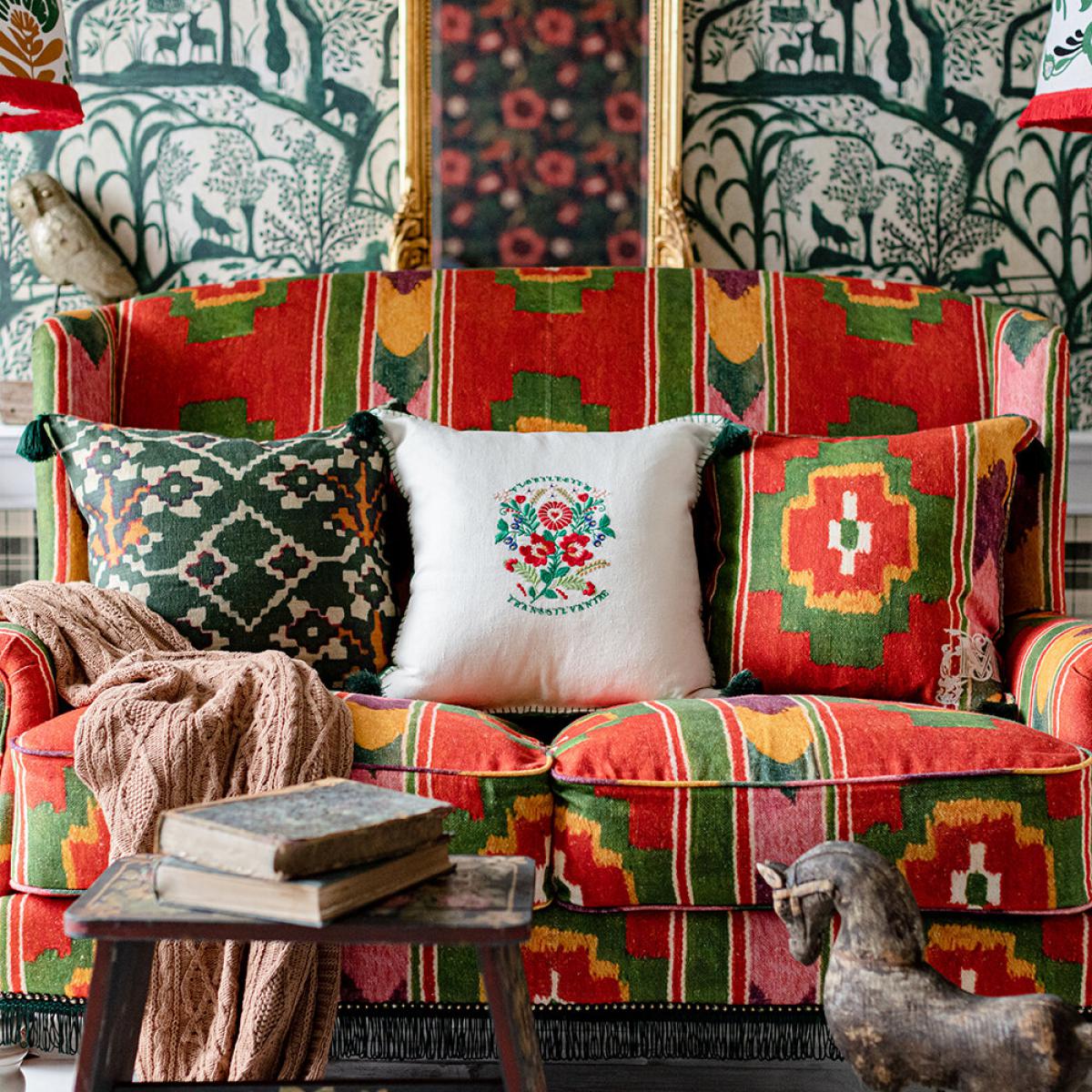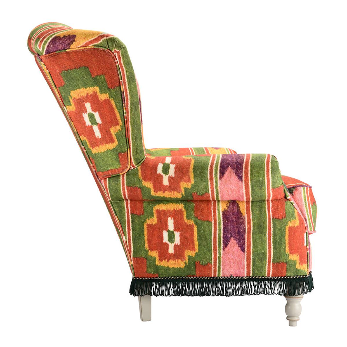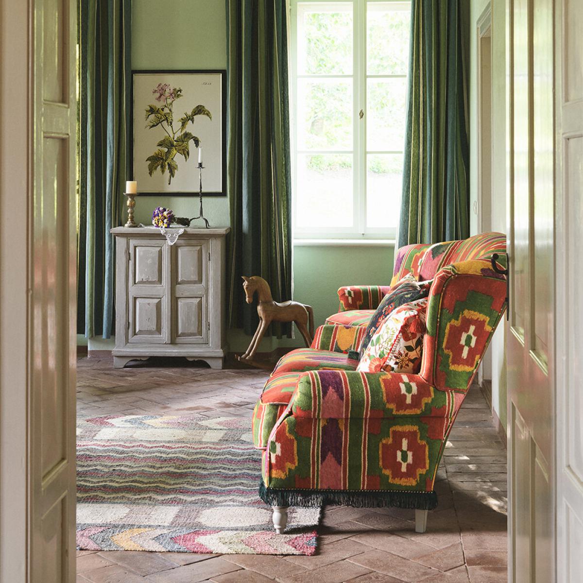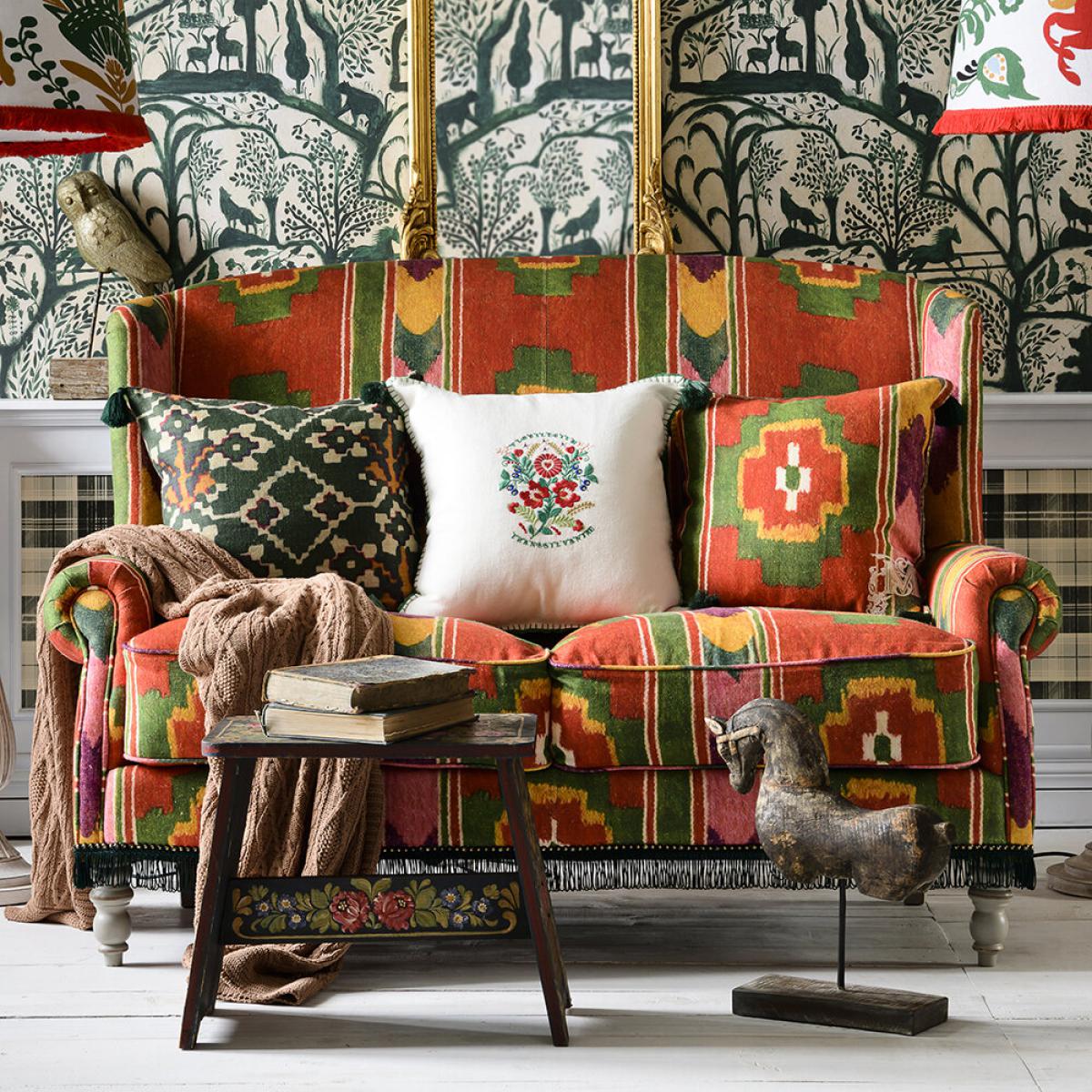 Give your home a vibrant touch with this Abigail sofa from MINDTHEGAP. A statement two-seater sofa with an upright back, rollover arms, and tapered legs. With a bold design featuring shapes in a range of colours, this contemporary piece is a must-have. Please note, due to the printing process, colours will fade when exposed to direct sunlight. For curtains, blinds, and draperies, we strongly recommend using a blackout lining.