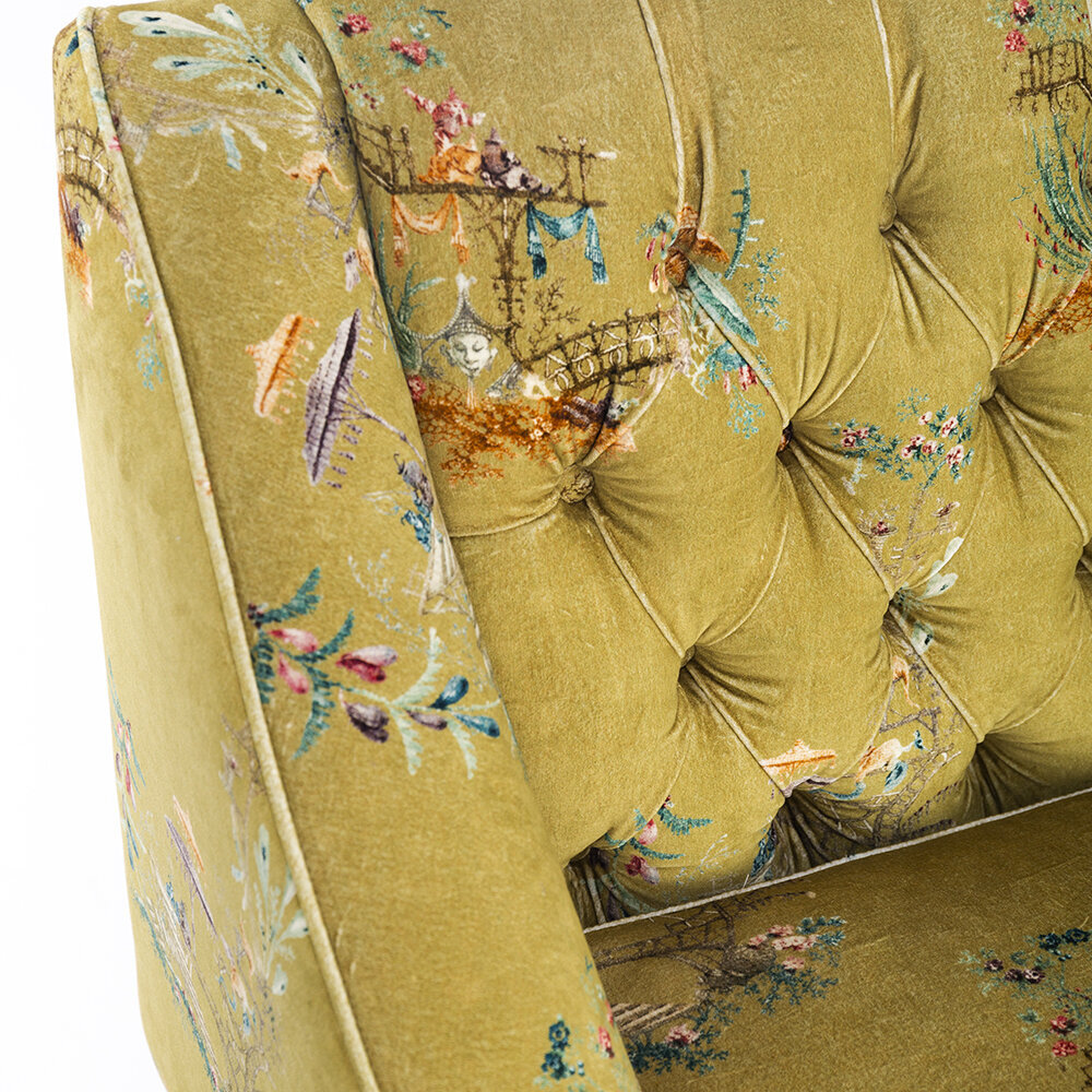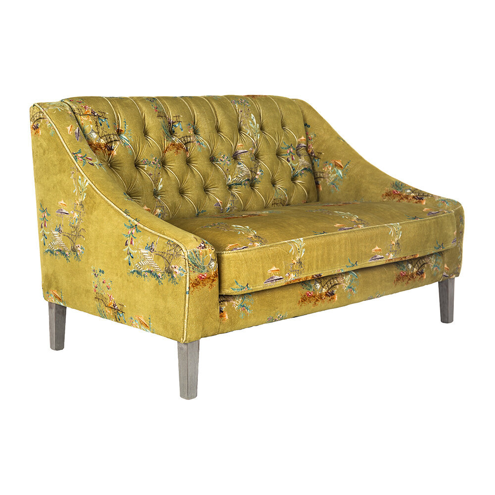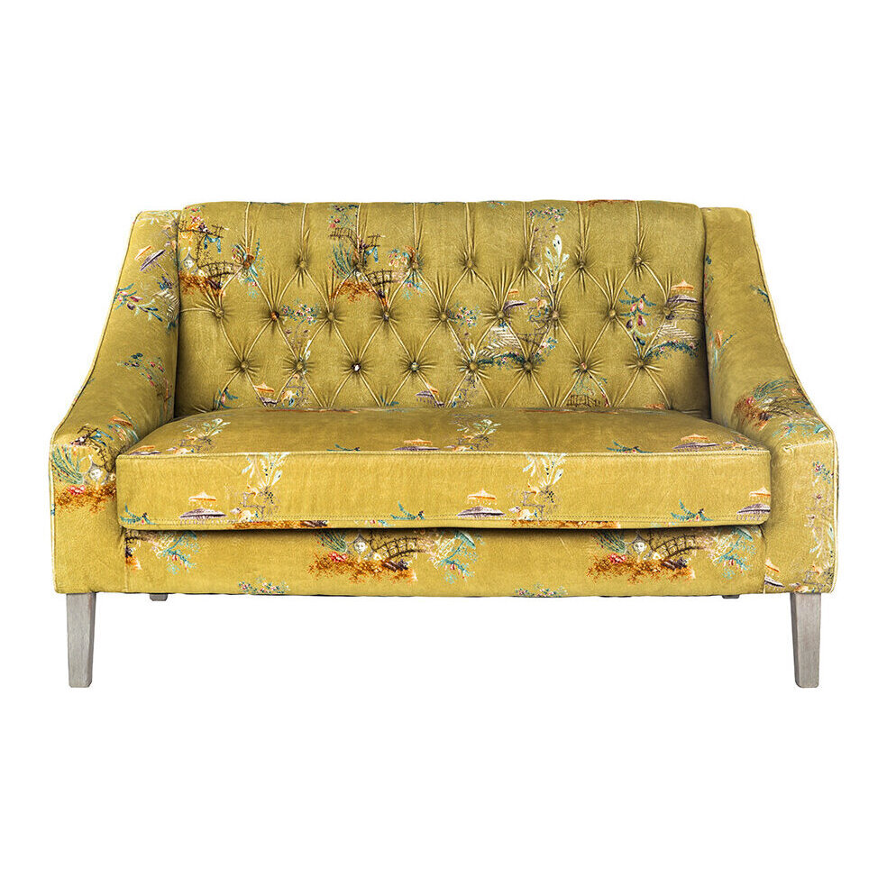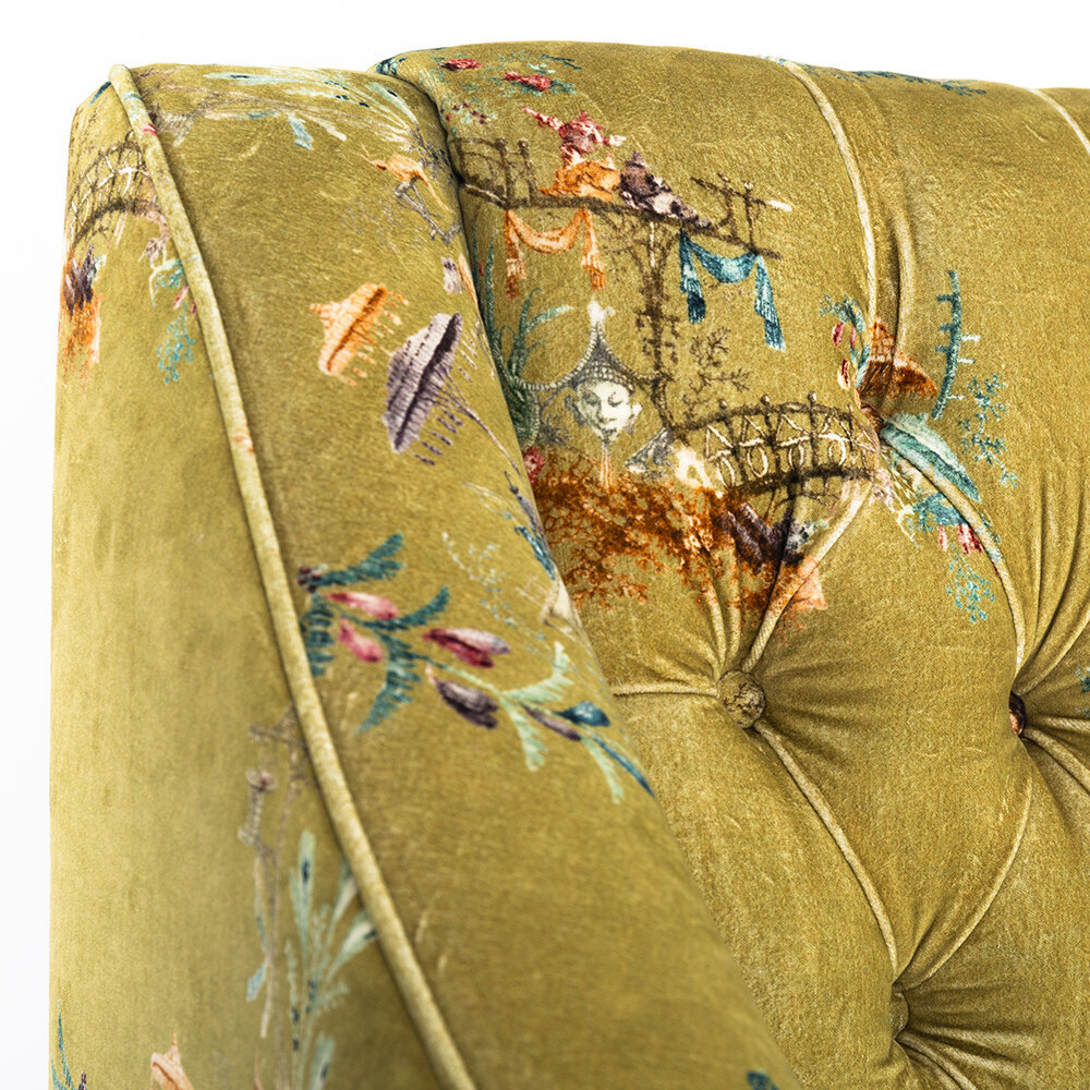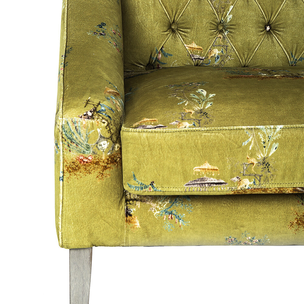 Sit back and relax with the vintage styled Baron tufted sofa from MINDTHEGAP. Upholstered in a green cotton velvet with a delicate floral pattern, this sofa will bring your living space to life. It features an upright button tufted back and crescent arms, and has a soft cushioned finish. With distressed tapered legs, this design exudes a vintage charm that will make a welcome addition to any home.