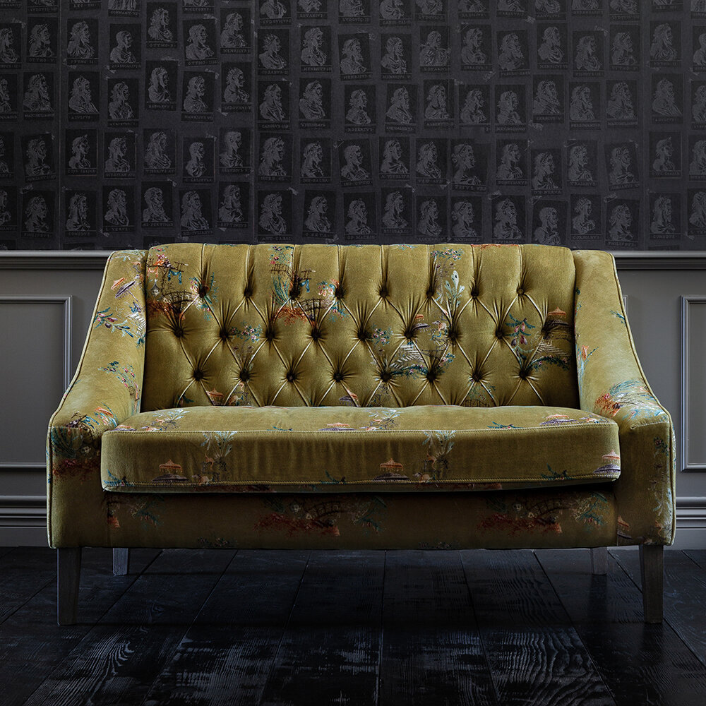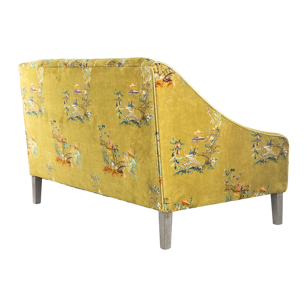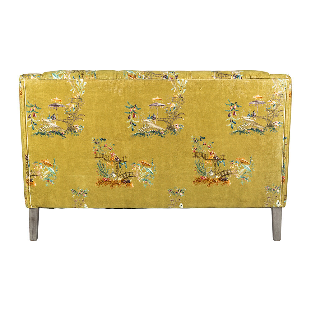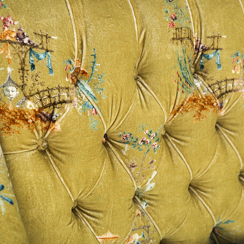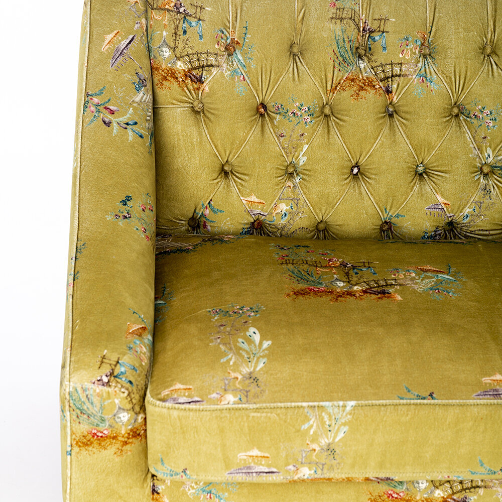 Sit back and relax with the vintage styled Baron tufted sofa from MINDTHEGAP. Upholstered in a green cotton velvet with a delicate floral pattern, this sofa will bring your living space to life. It features an upright button tufted back and crescent arms, and has a soft cushioned finish. With distressed tapered legs, this design exudes a vintage charm that will make a welcome addition to any home.