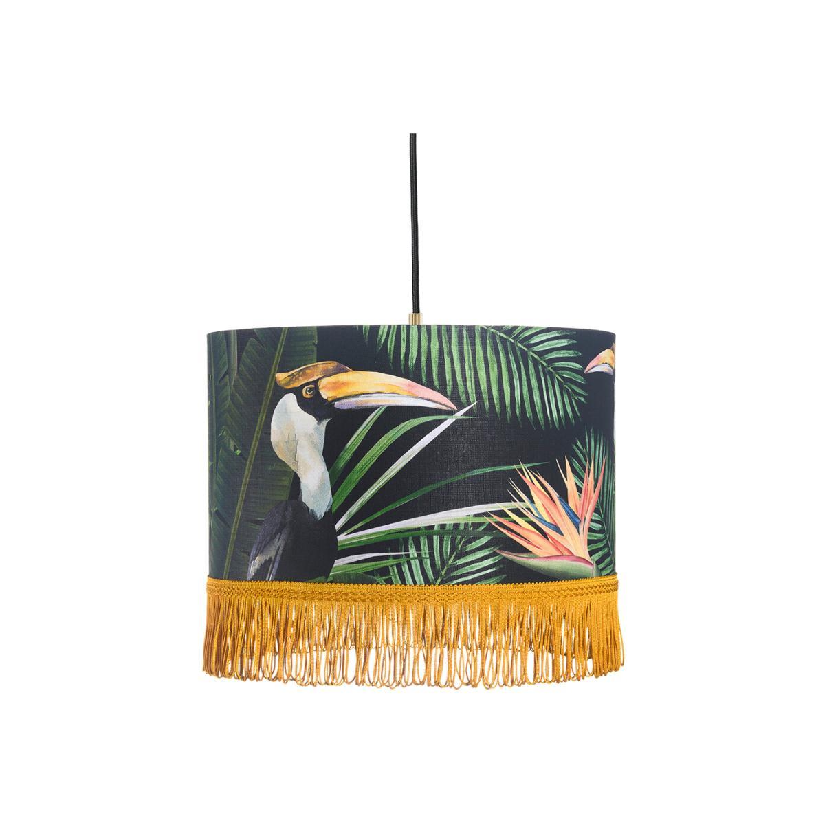 Turn your interior into a tropical oasis with this Birds of Paradise ceiling light from MINDTHEGAP. Vibrant and eccentric, this ceiling light is adorned with great hornbills and birds of paradise. Finished with a metallic gold lining for a luxe look, it's a one-of-a-kind statement making addition to any living space. Key features: * Ceiling light * Material: 100% linen * Dimensions: H22xØ35cm * Bulb required: E27 MAX 60W (not included) * Adorned with great hornbills and birds of paradise * Black background * Metallic gold lining * 2m black fabric cord * Metallic gold ceiling rose * Designed and manufactured in Transylvania