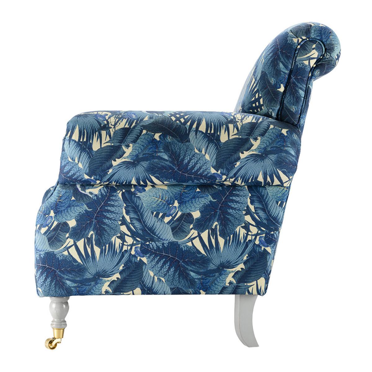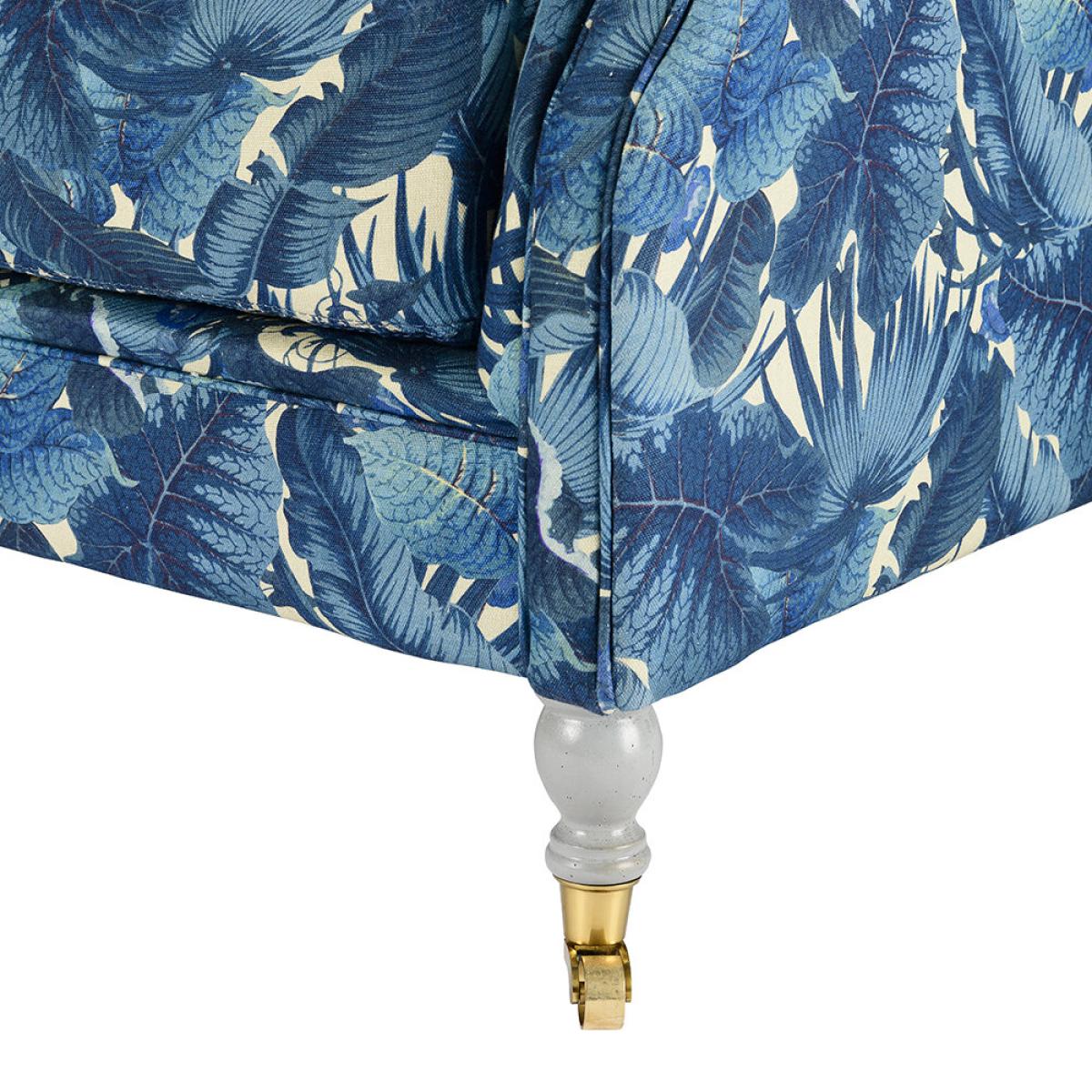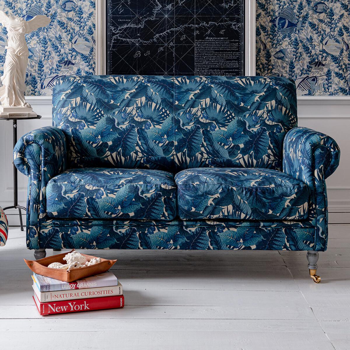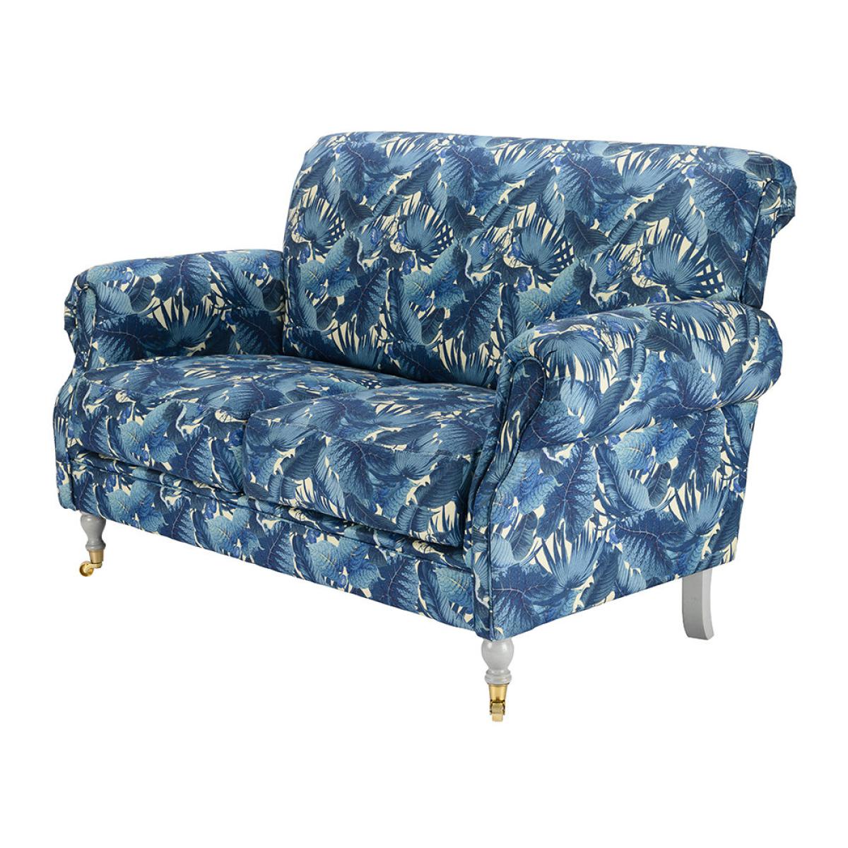 Make a statement in your living space with this Edinburgh sofa from MINDTHEGAP. Featuring a beautiful leaf print in blue tones, this eye-catching piece is features rollover arms, vintage painted wooden legs, and chic golden castors.
