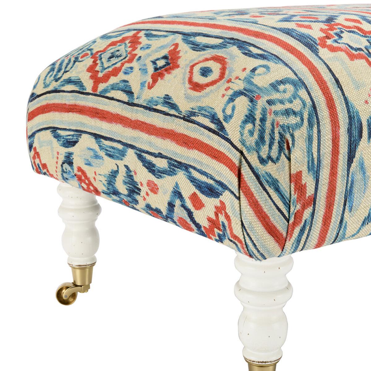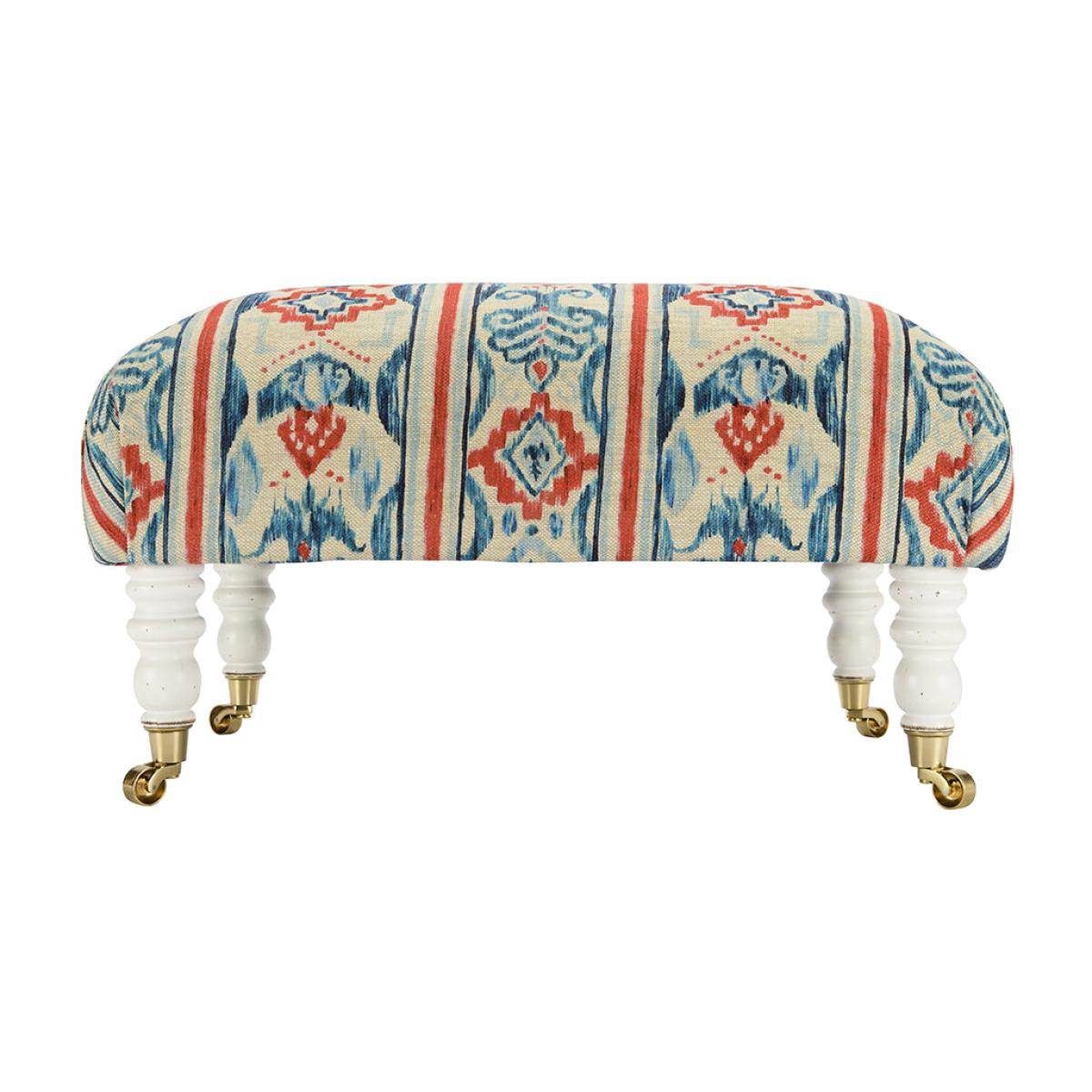Make a statement in the home with this Hudson stool from MINDTHEGAP. Upholstered in cotton with white wooden turned legs with gold castors, this beautiful stool is perfect for any living space.