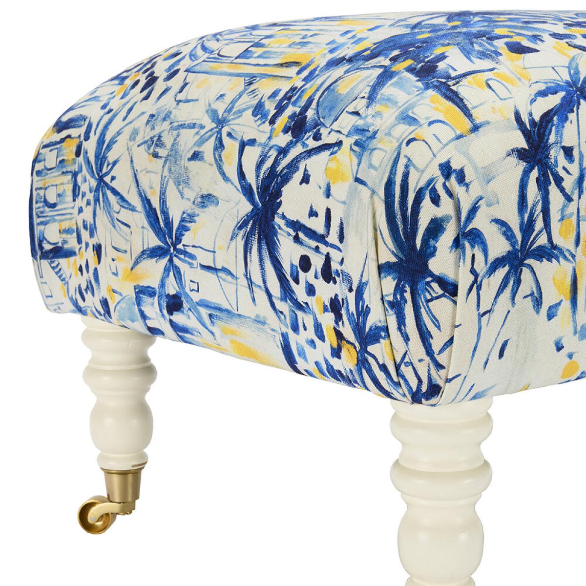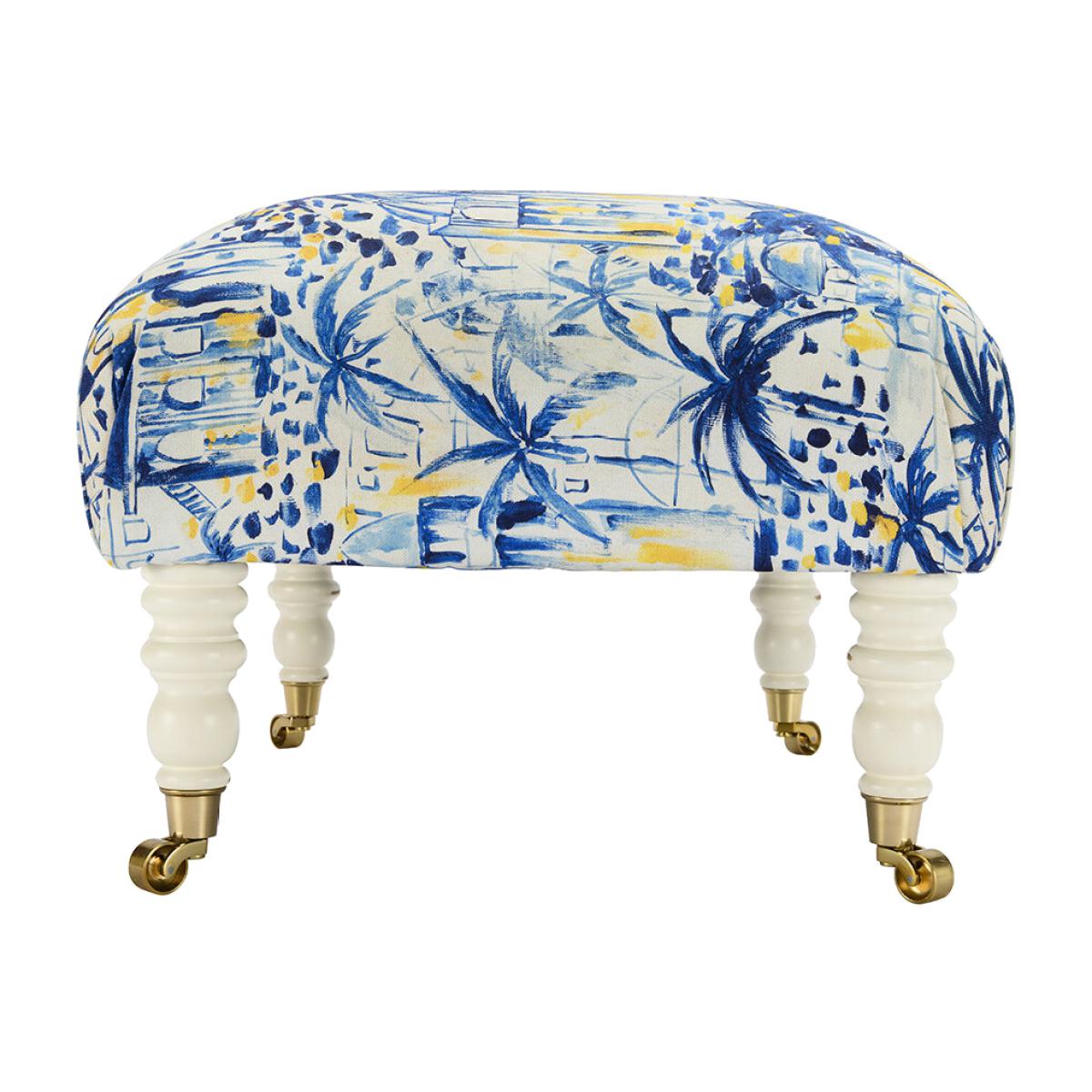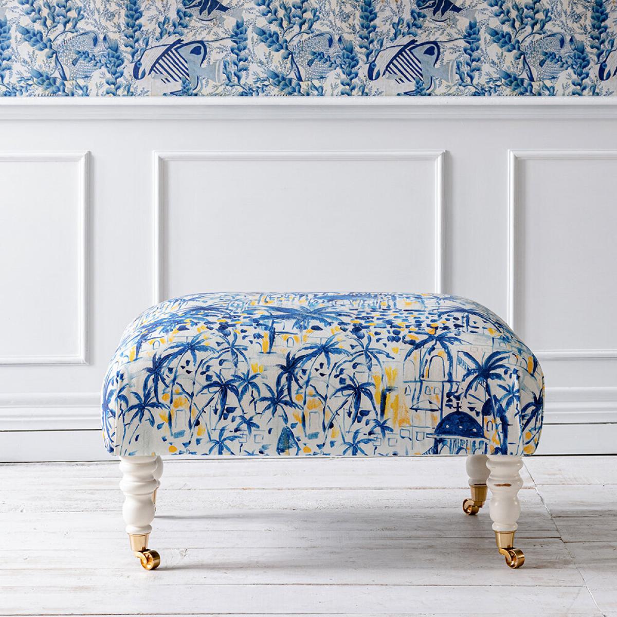 I love this little stool for its lively, textured fabric and versatile size, making it a great addition to both traditional and contemporary interiors. The Rhodes fabric adds a pop of colour and pattern that can energise a neutral space or complement a more eclectic look. Its compact form makes it perfect as a footrest, side table, or even extra seating when needed. To style it effectively, try placing it near a cosy armchair or by a bed for added comfort. It also works well in a coastal or botanical-inspired scheme, bringing a casual yet refined feel. Practical tip: its casters allow for easy repositioning, making it supremely functional in multi-use spaces.