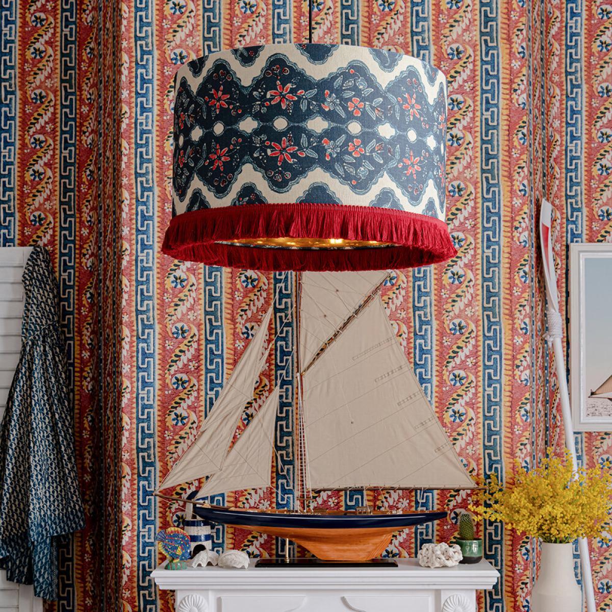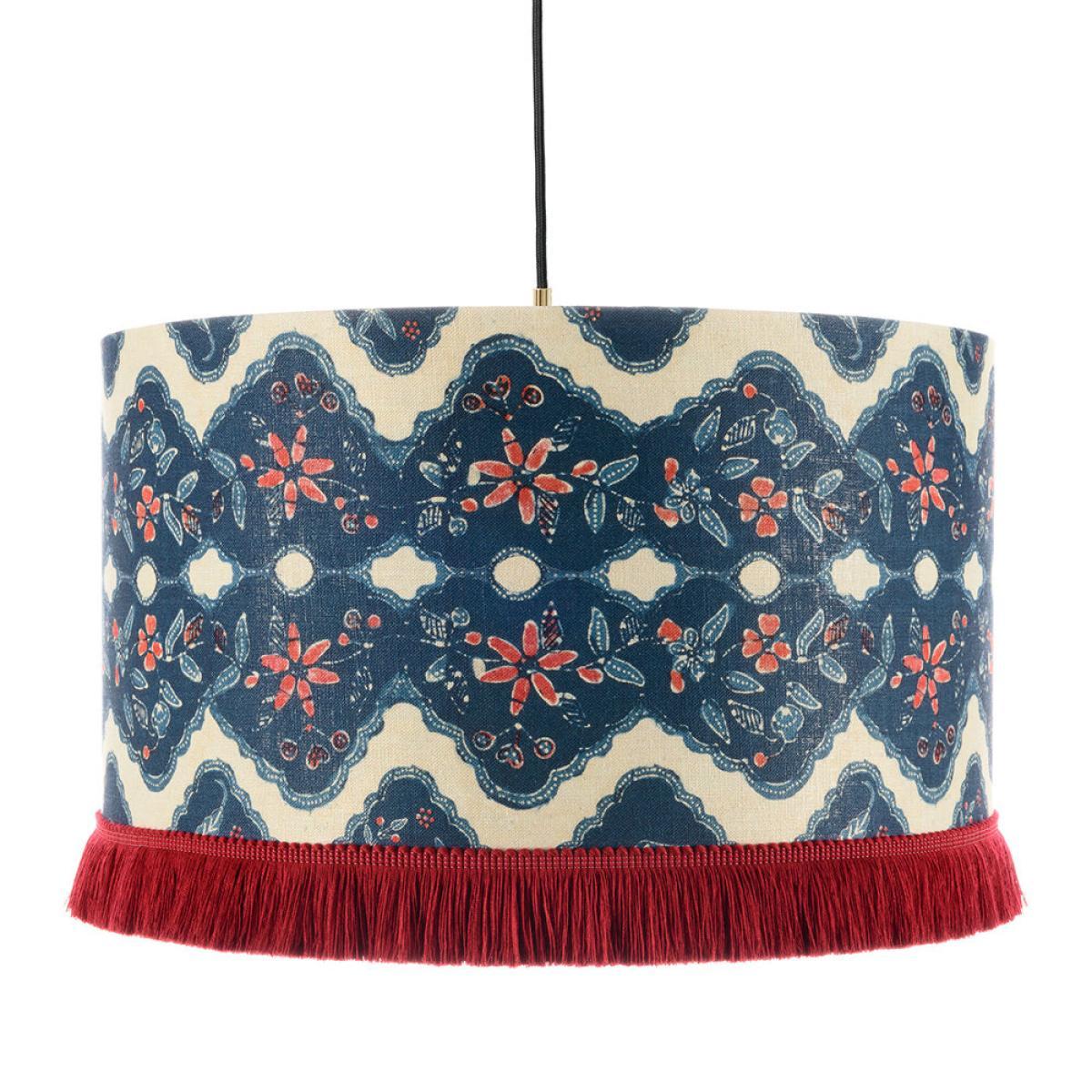 Update your interior with this Phoenicia Batik ceiling light from MINDTHEGAP. Made from linen, it features a beautiful floral pattern in blue, white, and red tones. Finished with a red cotton fringing and metallic gold interior, it comes with a gold ceiling rose and black fabric cord.