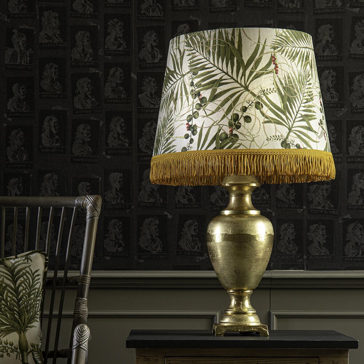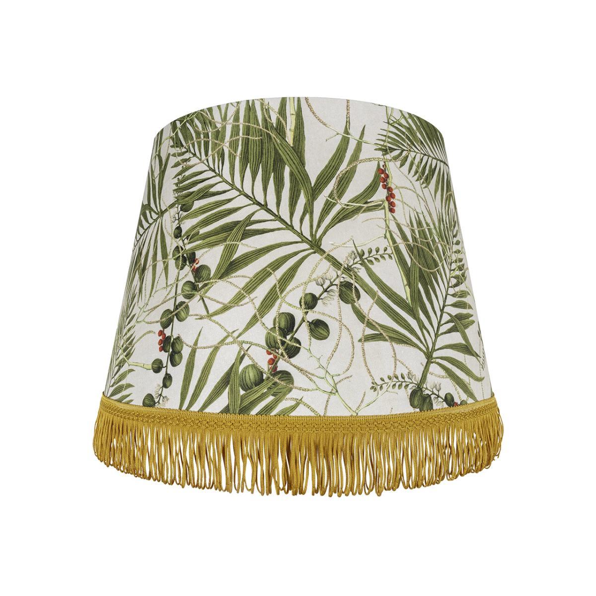 Bring tropical prints into your home with this cone lamp shade from MINDTHEGAP. In fresh green and white, it features a tropical leaves and flowers and is accented by golden looped fringes.