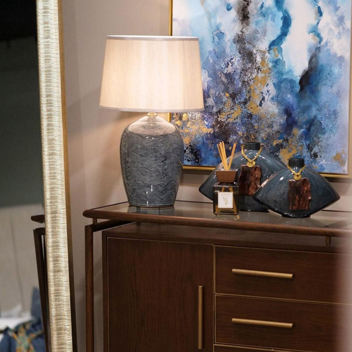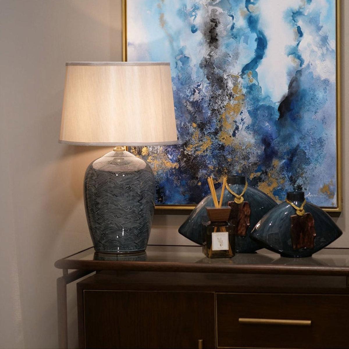 The magnificent Blue Waves table lamp commands attention in both style and size, it is 69cm in overall height and 48. 5cm in diameter. Its tumultuous textured surface displays a medley of ocean wave. View More. The magnificent Blue Waves table lamp commands attention in both style and size, it is 69cm in overall height and 48. 5cm in diameter. Its tumultuous textured surface displays a medley of ocean waves in a combination of blue and navy. They look better the closer you stand and recall traditional Japanese designs. The ensemble is topped by a faintly patterned linen shade in taupe, creating a refined and subtle colour combination eminently suited to modern homes. The Blue Waves lamp is ideal for creating toned-down lighting in the lounge or dining room. It looks extra superb when matched with other blue, water or ocean-themed items.