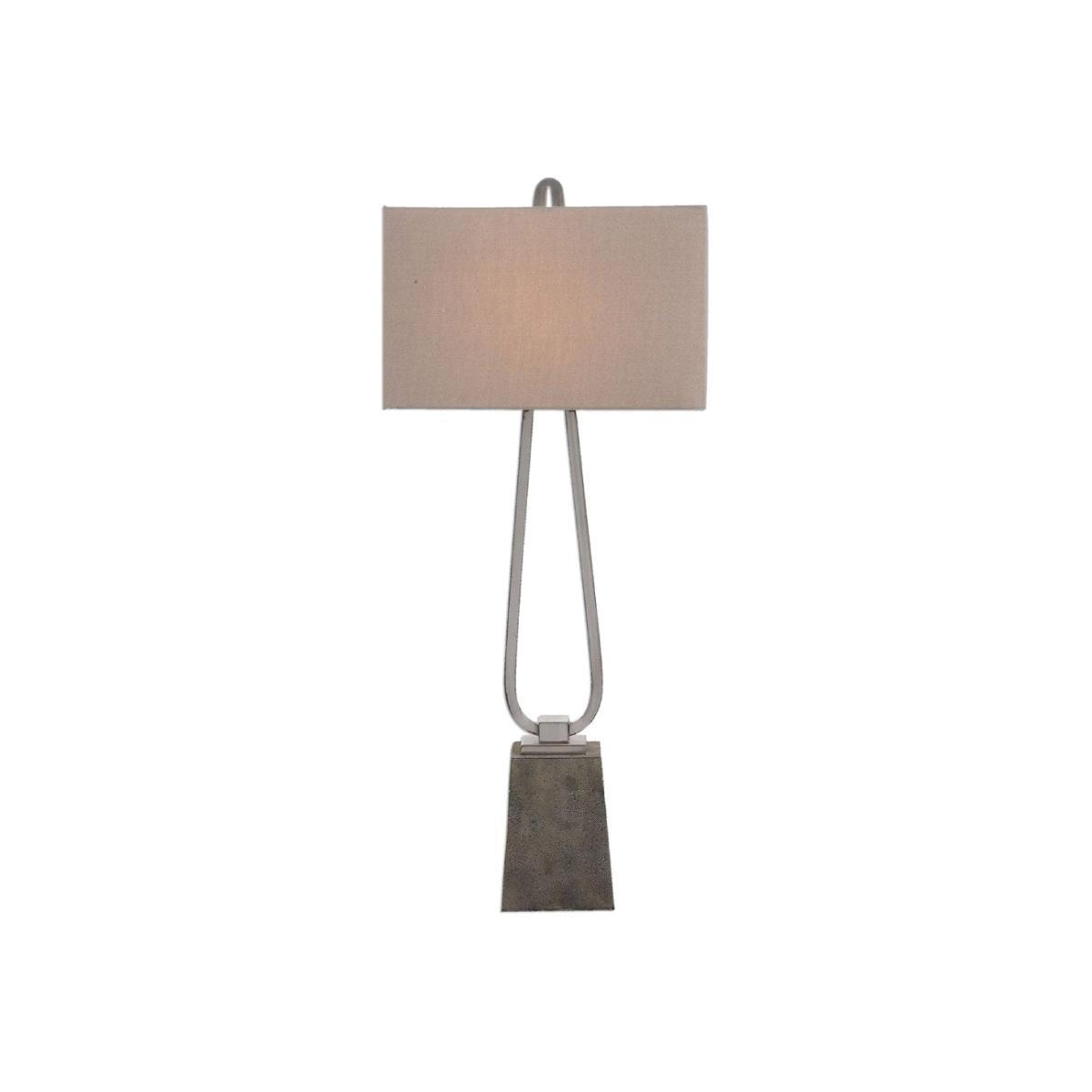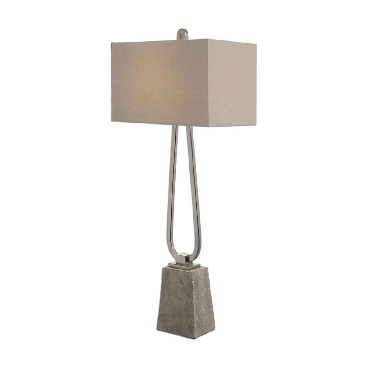 Hand forged metal base finished in a plated polished nickel accented with a lightly stained concrete foot. The rectangle hardback shade is a taupe bronze linen fabric. *Moot Trading Ltd is not a lender and acts only as an introducer. The credit product is provided by Klarna Bank AB (publ). Credit is only available to permanent UK residents aged 18 and over, subject to status. Terms and conditions apply. Please note that the following products are not regulated by the FCA: Pay in 30 days and Pay in 3 instalments. Read More.