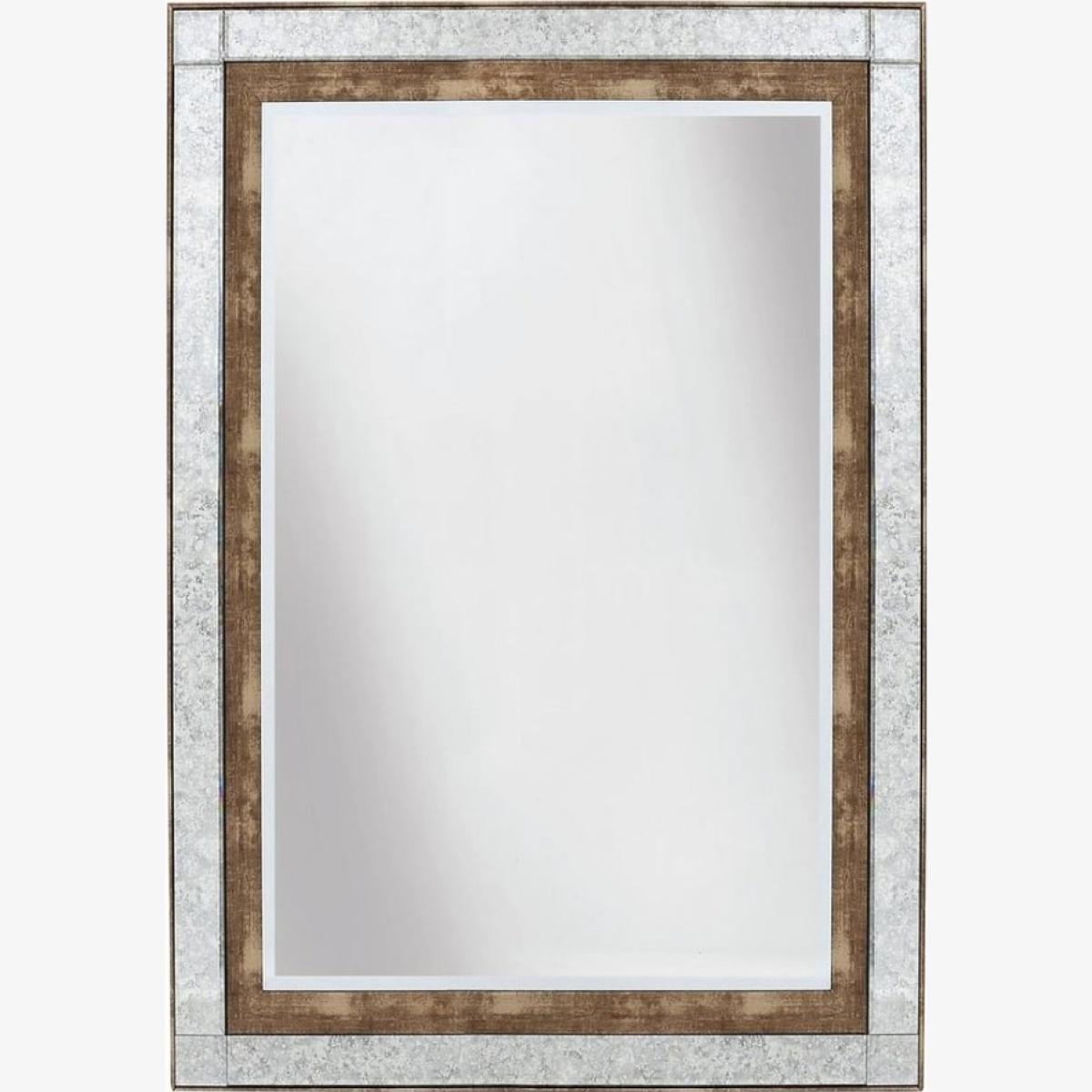 This mirror features antique mirror on the frame, which means a mottled aged effect, not clear. Insert of frame is a bronze colour in finish. Dimensions:W:109 x D:4 x H:79 cm