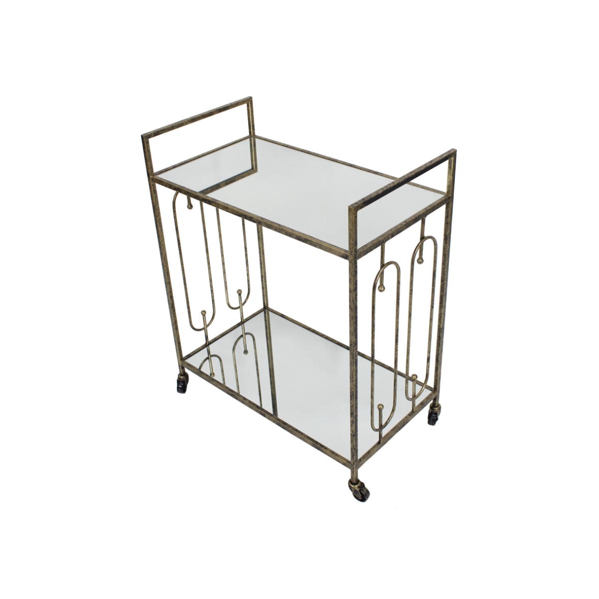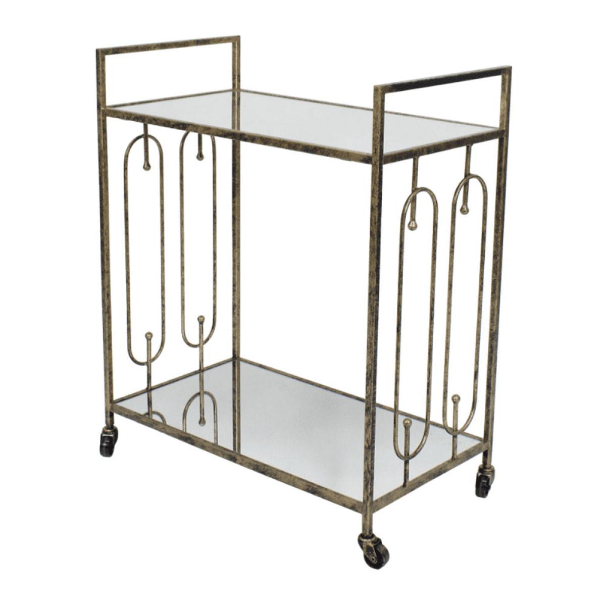 Serving made as simple as one, two, three A beautiful drinks trolley ideal for the host with the most Rectangular in design with oblong detailing on the outer surround which is finished in distressed gold and mirrored top and lower mirror shelf Style with your favourite cocktail ingredients and glassware for maximum impact