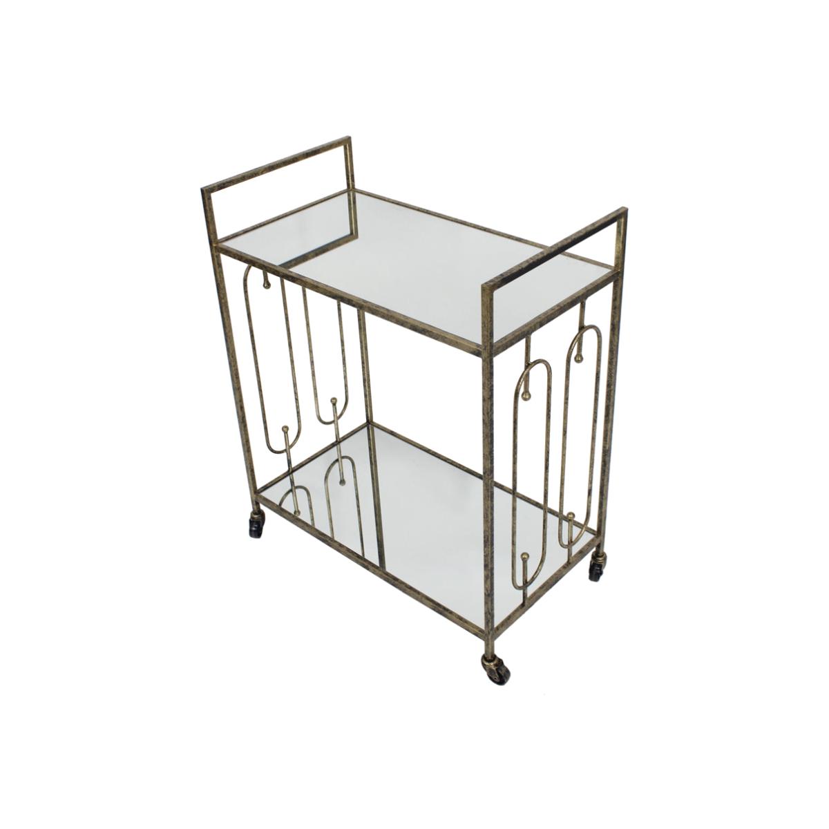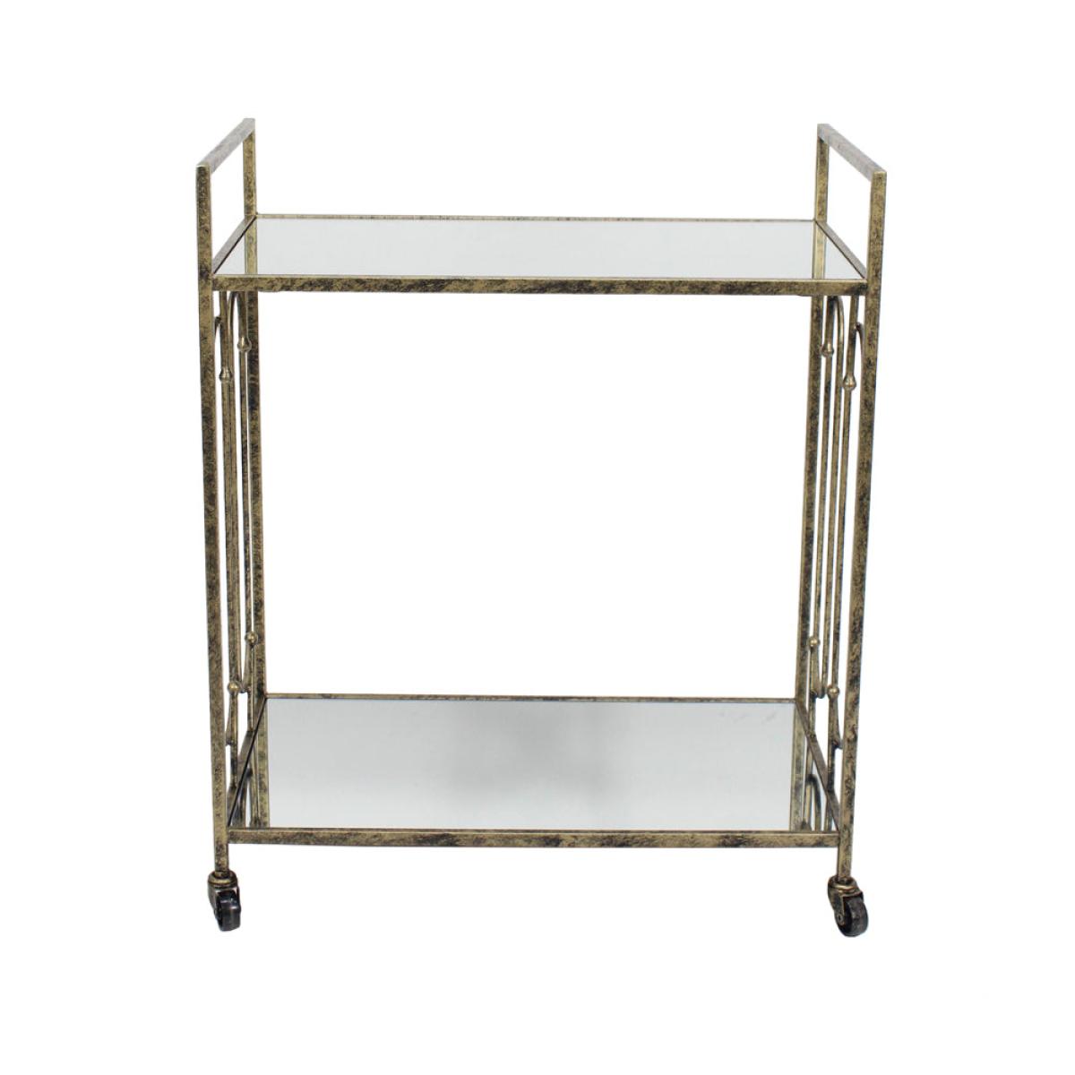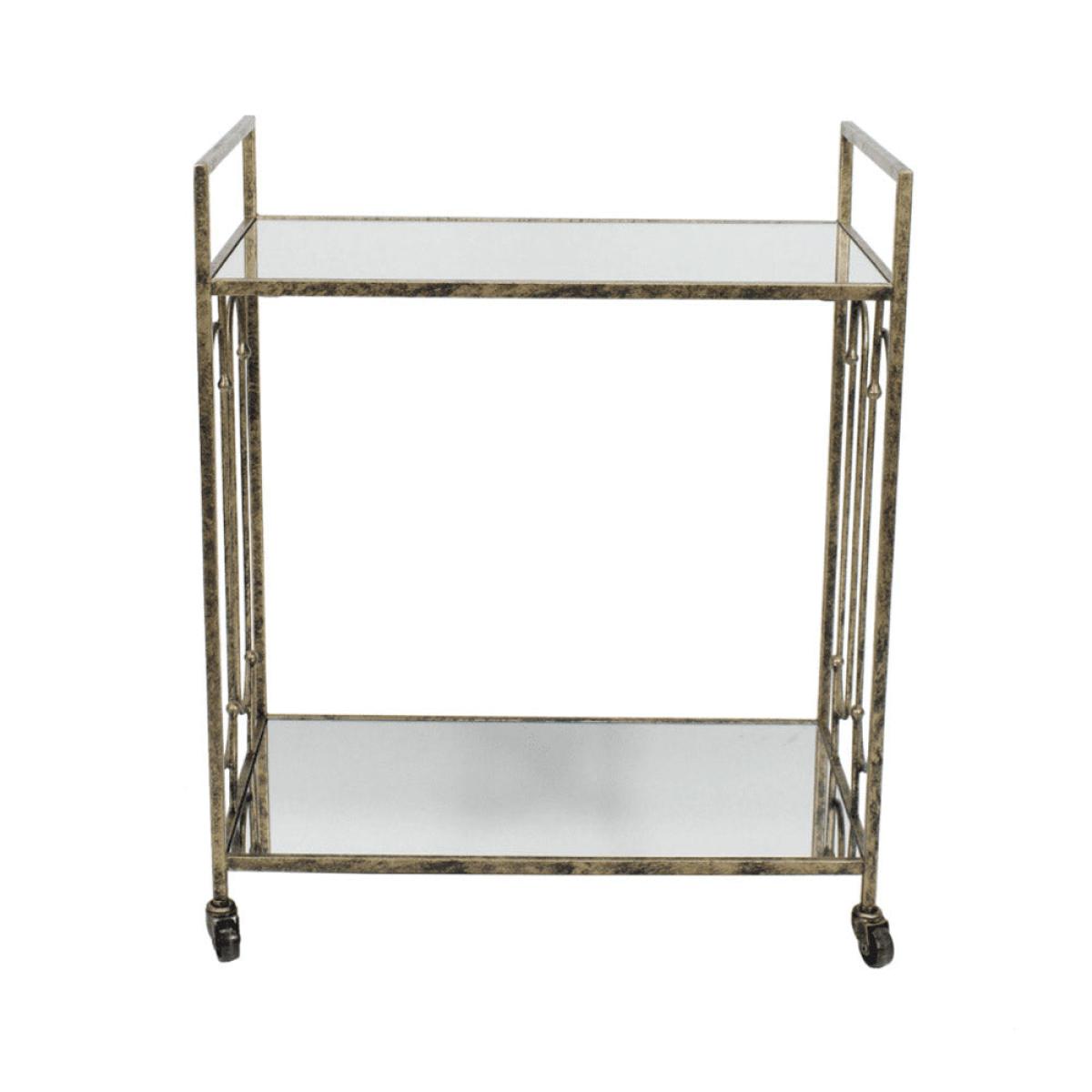 Serving made as simple as one, two, three A beautiful drinks trolley ideal for the host with the most Rectangular in design with oblong detailing on the outer surround which is finished in distressed gold and mirrored top and lower mirror shelf Style with your favourite cocktail ingredients and glassware for maximum impact