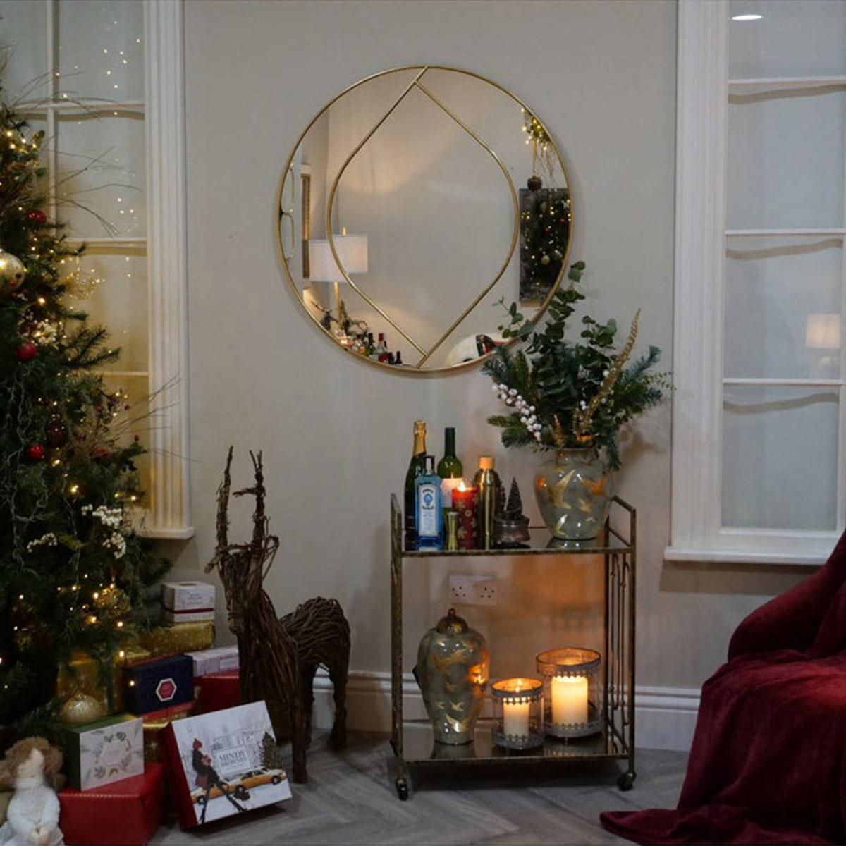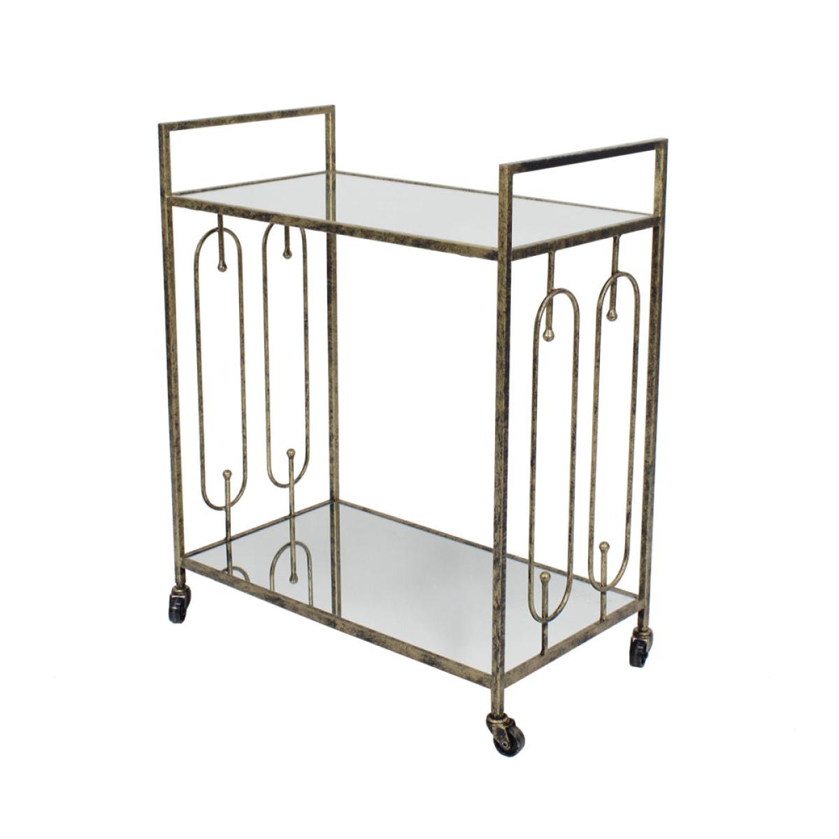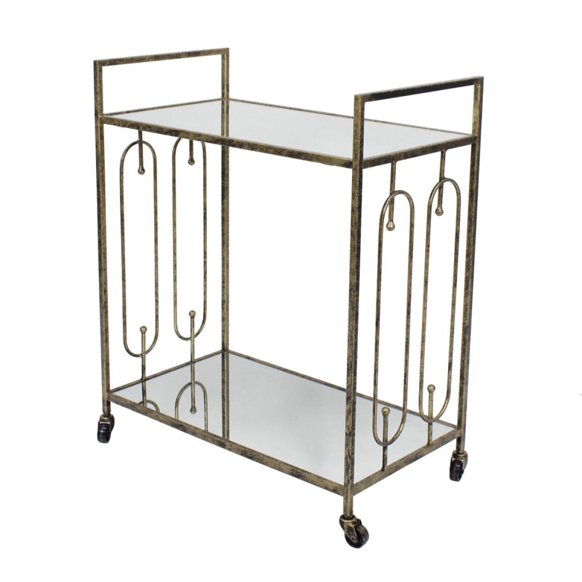 Serving made as simple as one, two, three A beautiful drinks trolley ideal for the host with the most Rectangular in design with oblong detailing on the outer surround which is finished in distressed gold and mirrored top and lower mirror shelf Style with your favourite cocktail ingredients and glassware for maximum impact