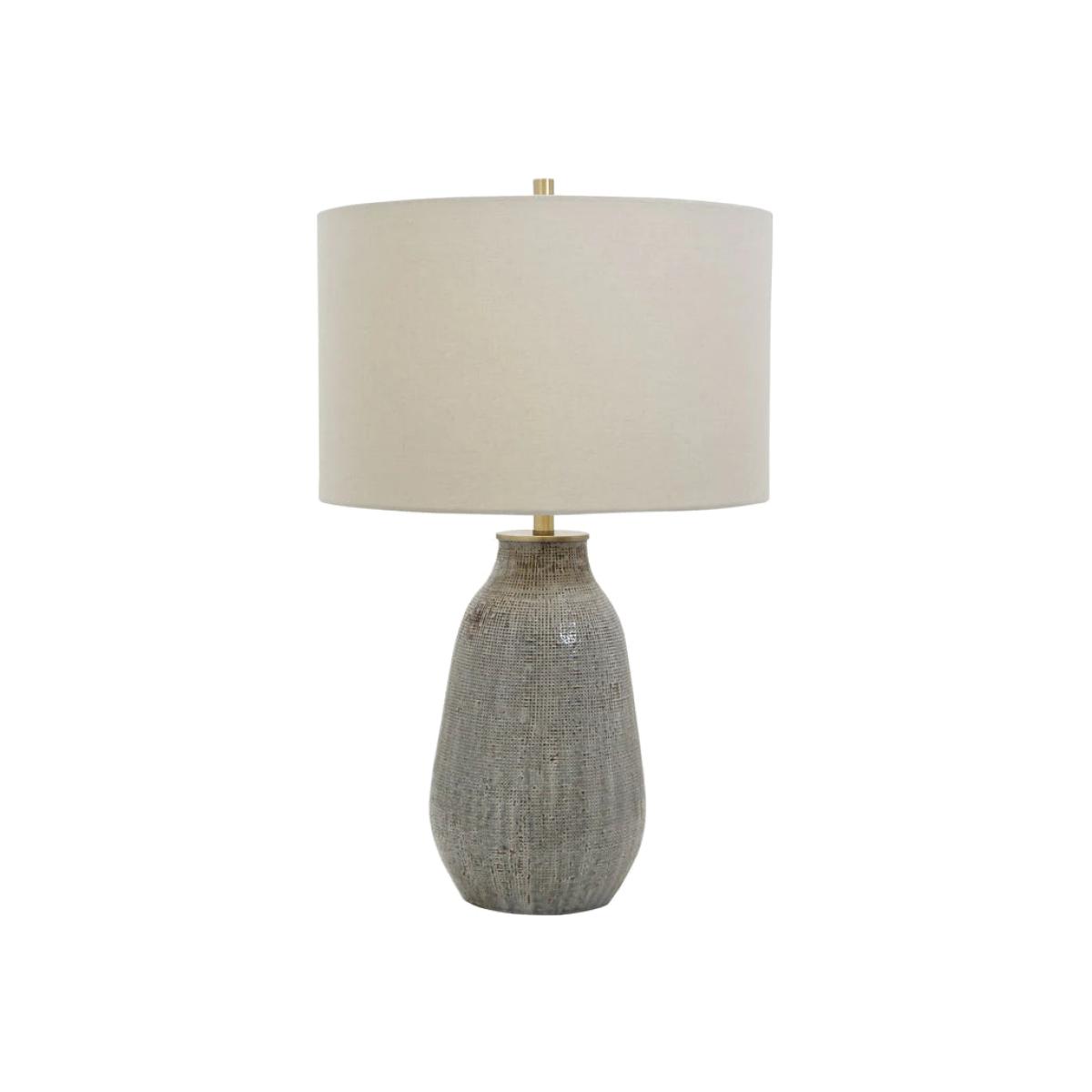 The Monacan Table Lamp is a beautiful statement piece with a grey base featuring sage green flecks and a linen drum shade. Additional Information